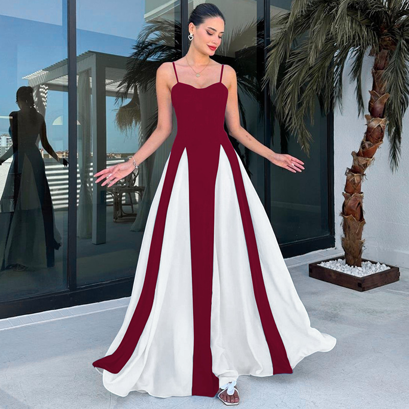 유럽과 미국 스타일의 대외 무역 여성 의류 2025 봄 신상 스커트 세련된 대비 색상 스플 라이스 서스펜더 드레스 도매