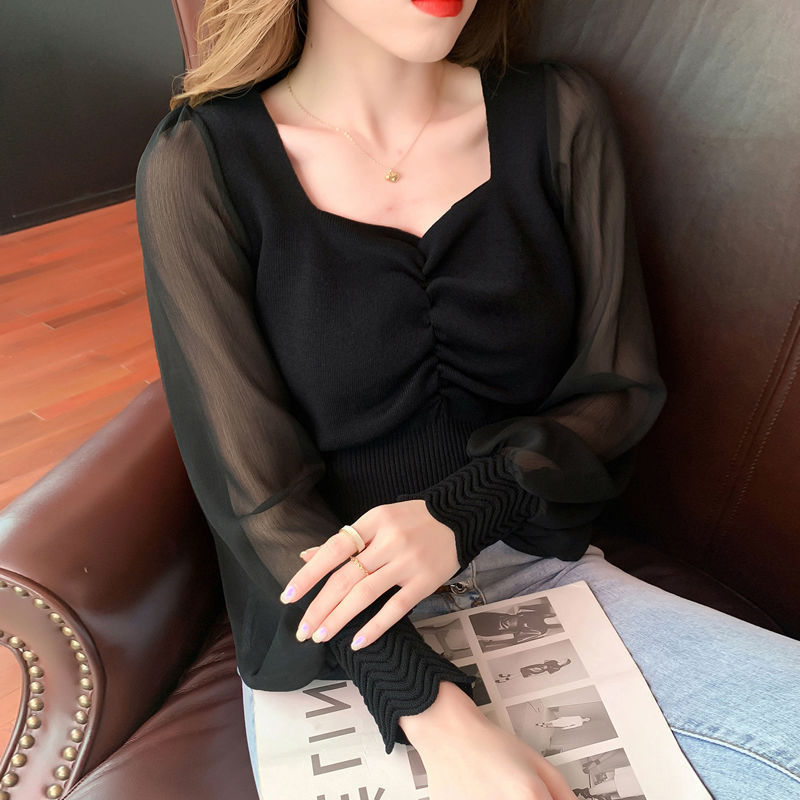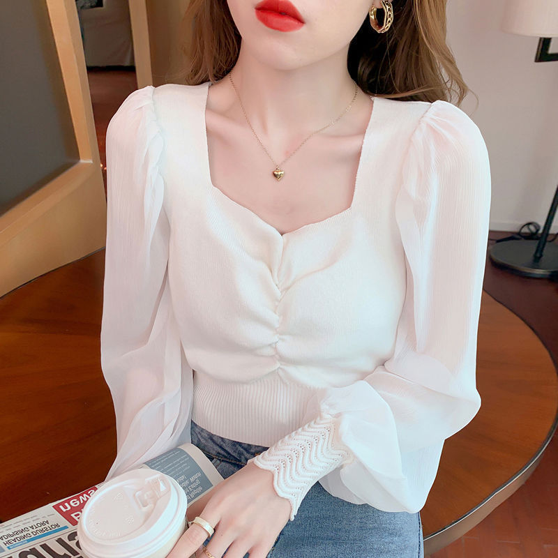 여성용 아이스 실크 니트웨어 얇은 가을옷 2025년 신상품 클라비클 스퀘어 넥 랜턴 슬리브 숏 스타일 쉬폰 와이드 슬리브 탑스토어 가기