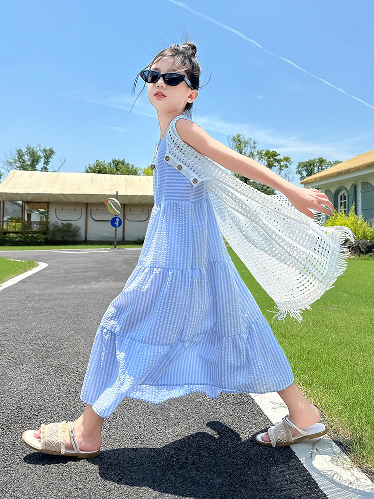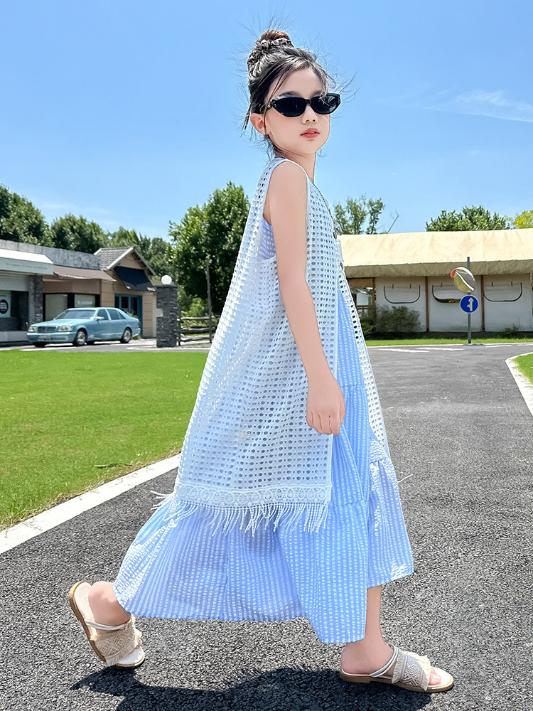 여자 드레스 2025 새로운 여름 달콤한 중공 해변 휴가 여름 서스펜더 스커트 여자를위한 투피스 세트