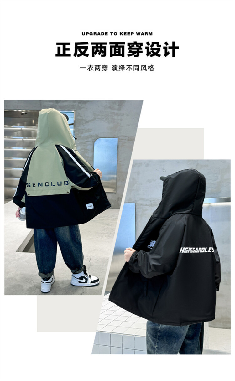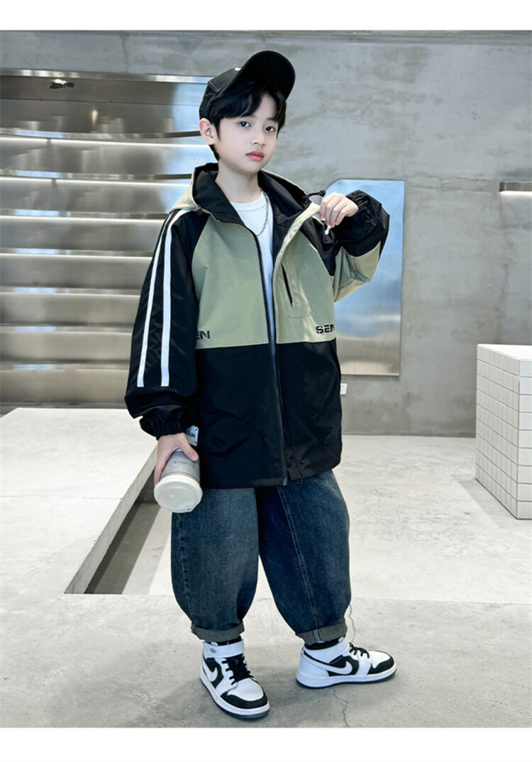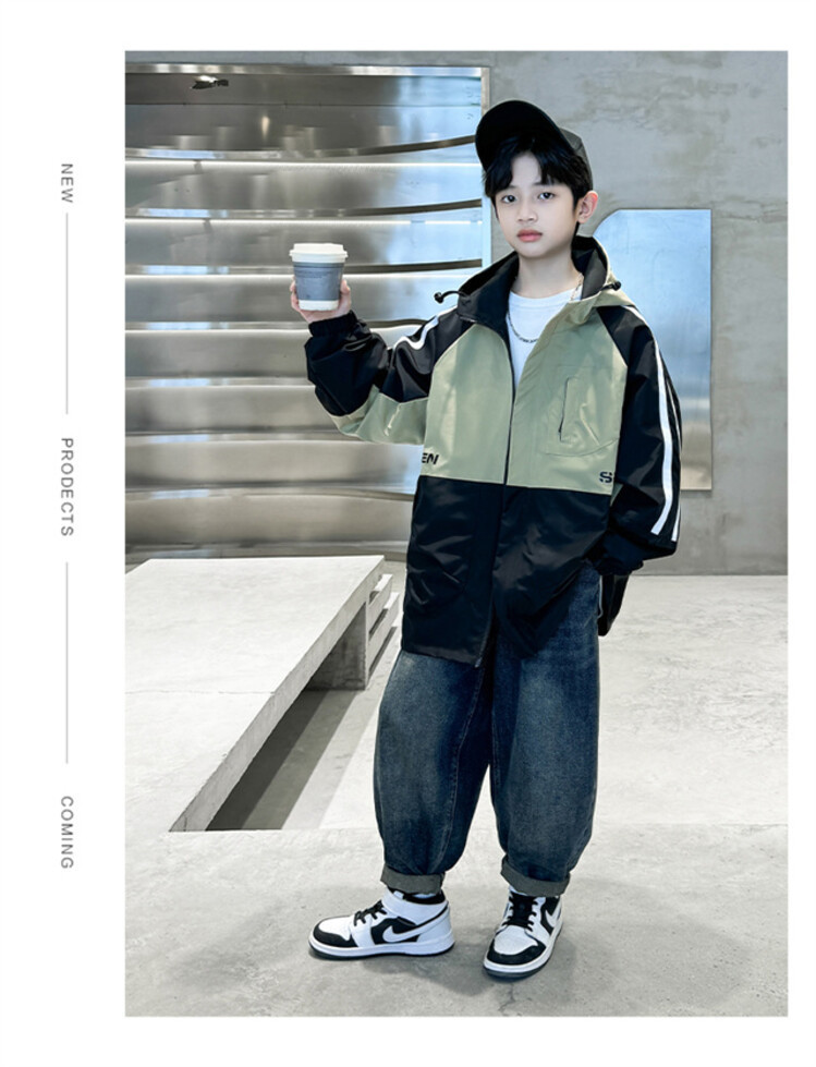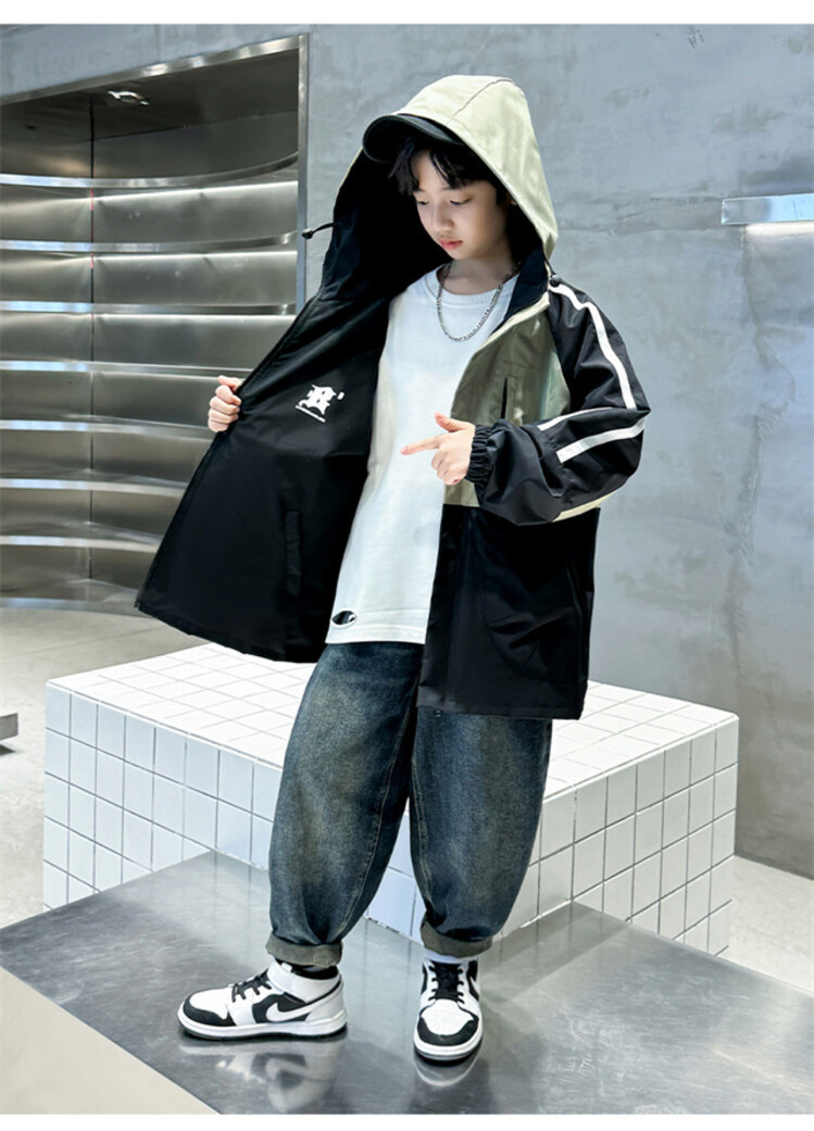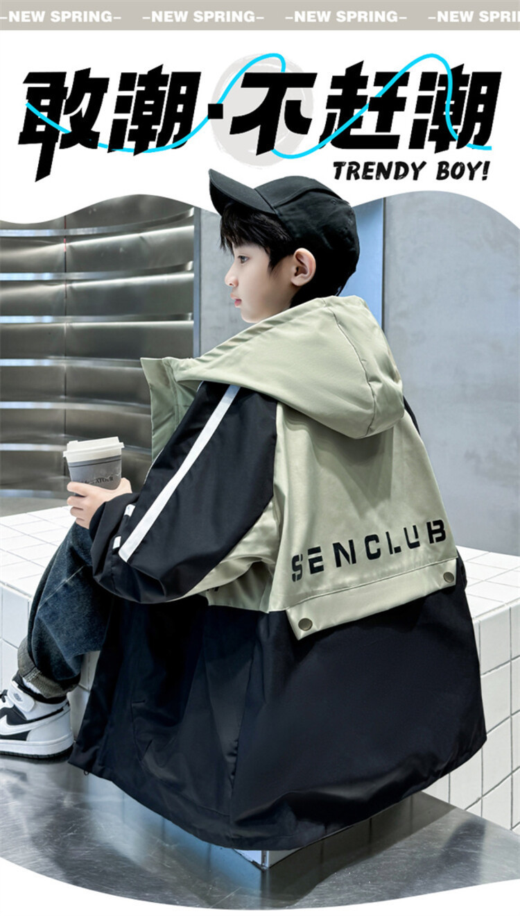 소년 봄과 가을 컬러 매칭 트렌치 코트 2024 봄 새로운 어린이 한국 외국 스타일 양면 후드 코트 도매스토어 가기