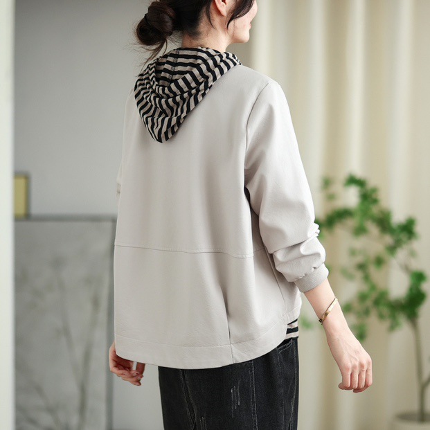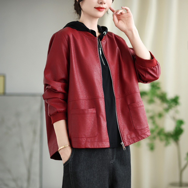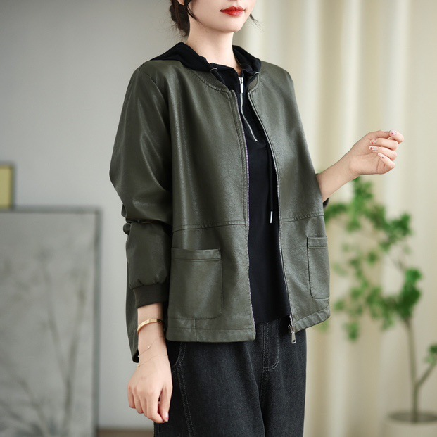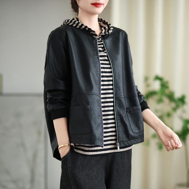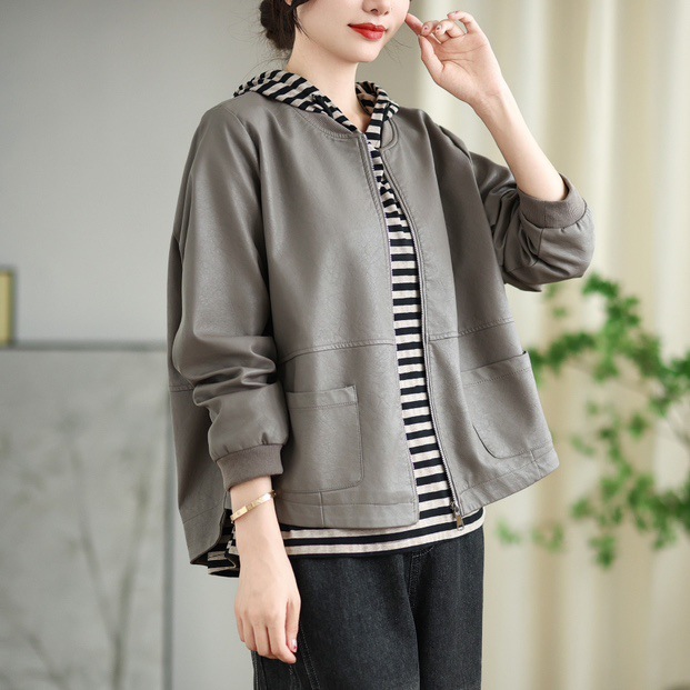 수직 칼라 긴 소매 PU 가죽 자켓 2024 가을 새로운 플러스 사이즈 느슨한 지퍼 재킷 81313