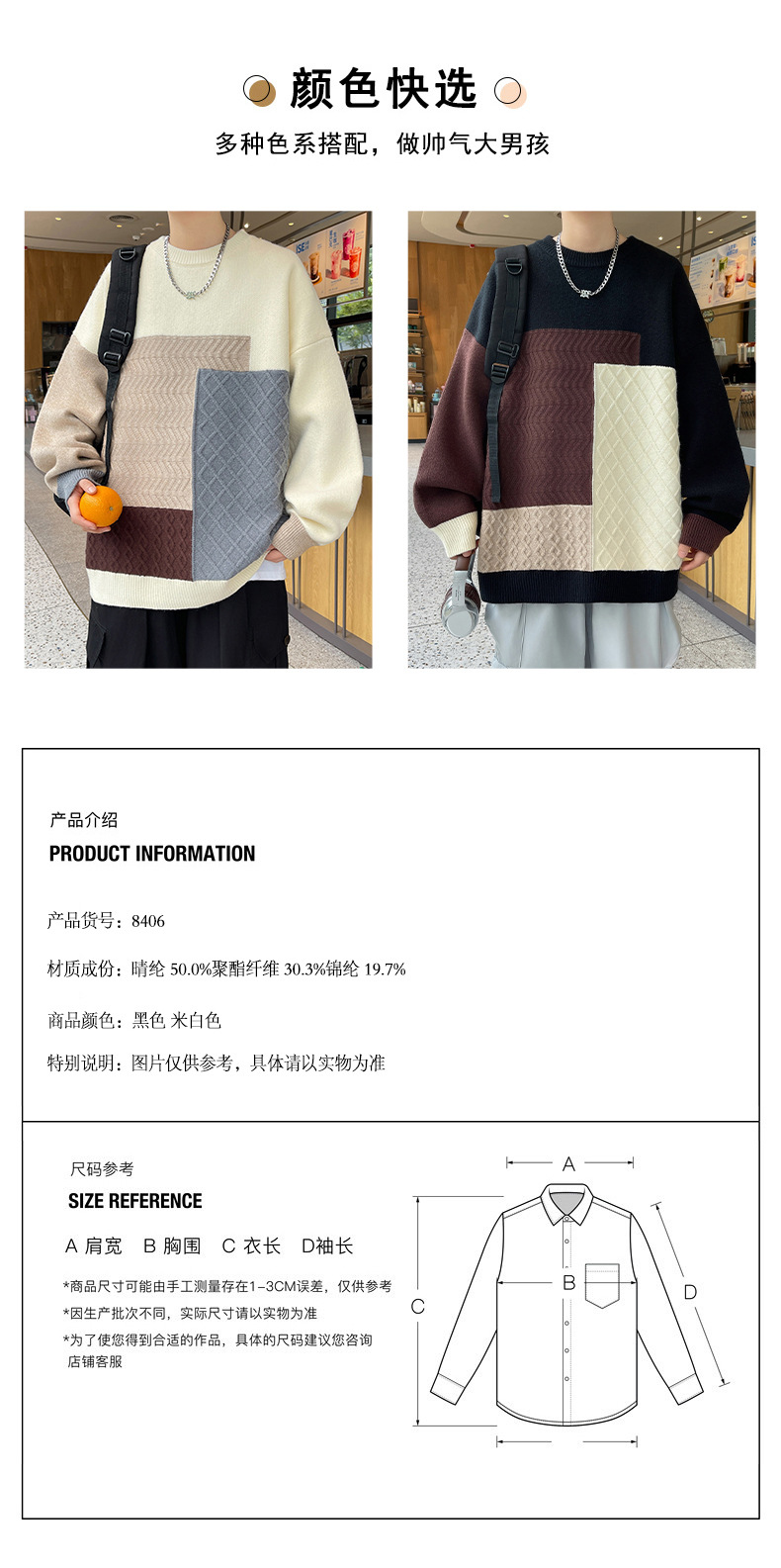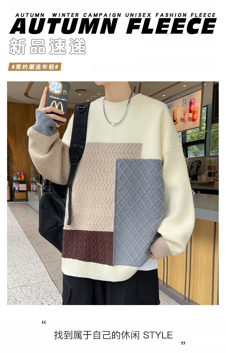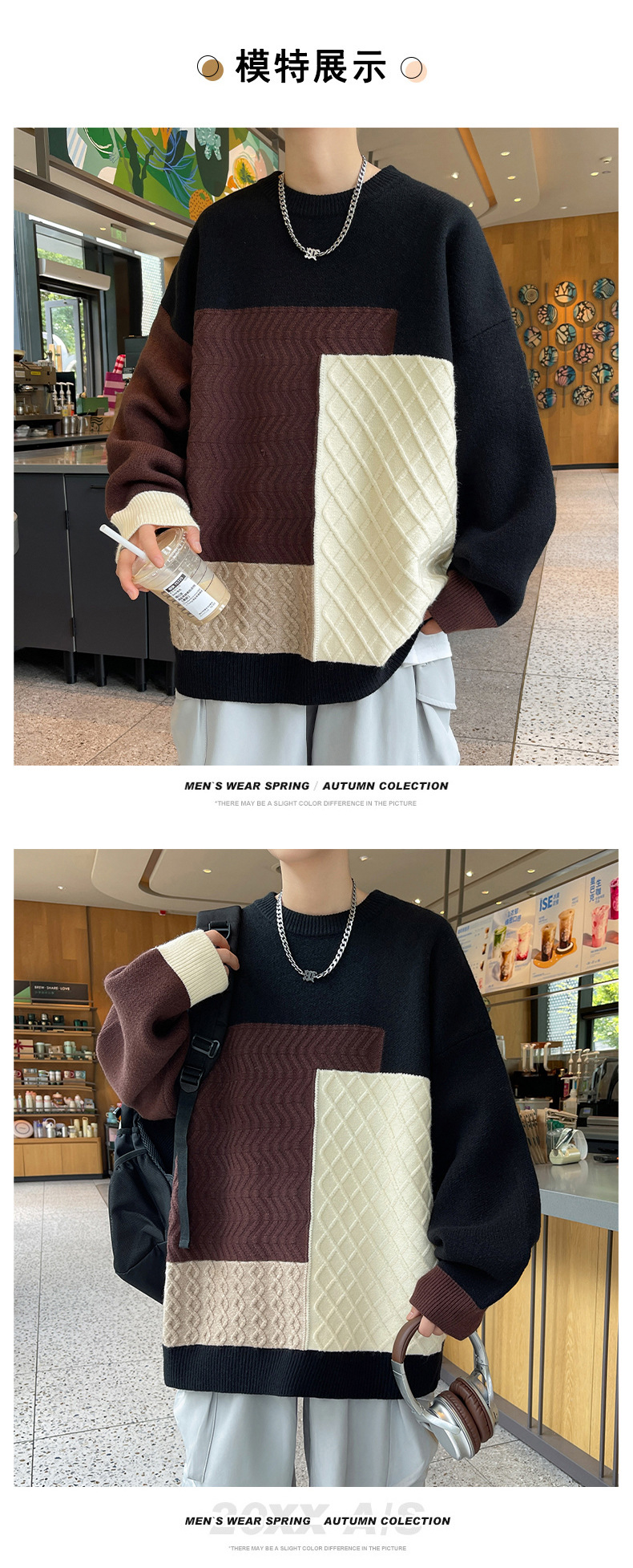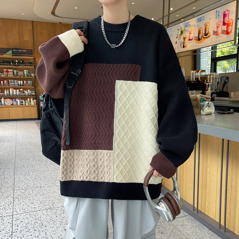 홍콩 스타일 소프트 왁스 크루 넥 스웨터 남자 루즈 심플 올 매치 기본 내부 스티칭 대비 니트스토어 가기