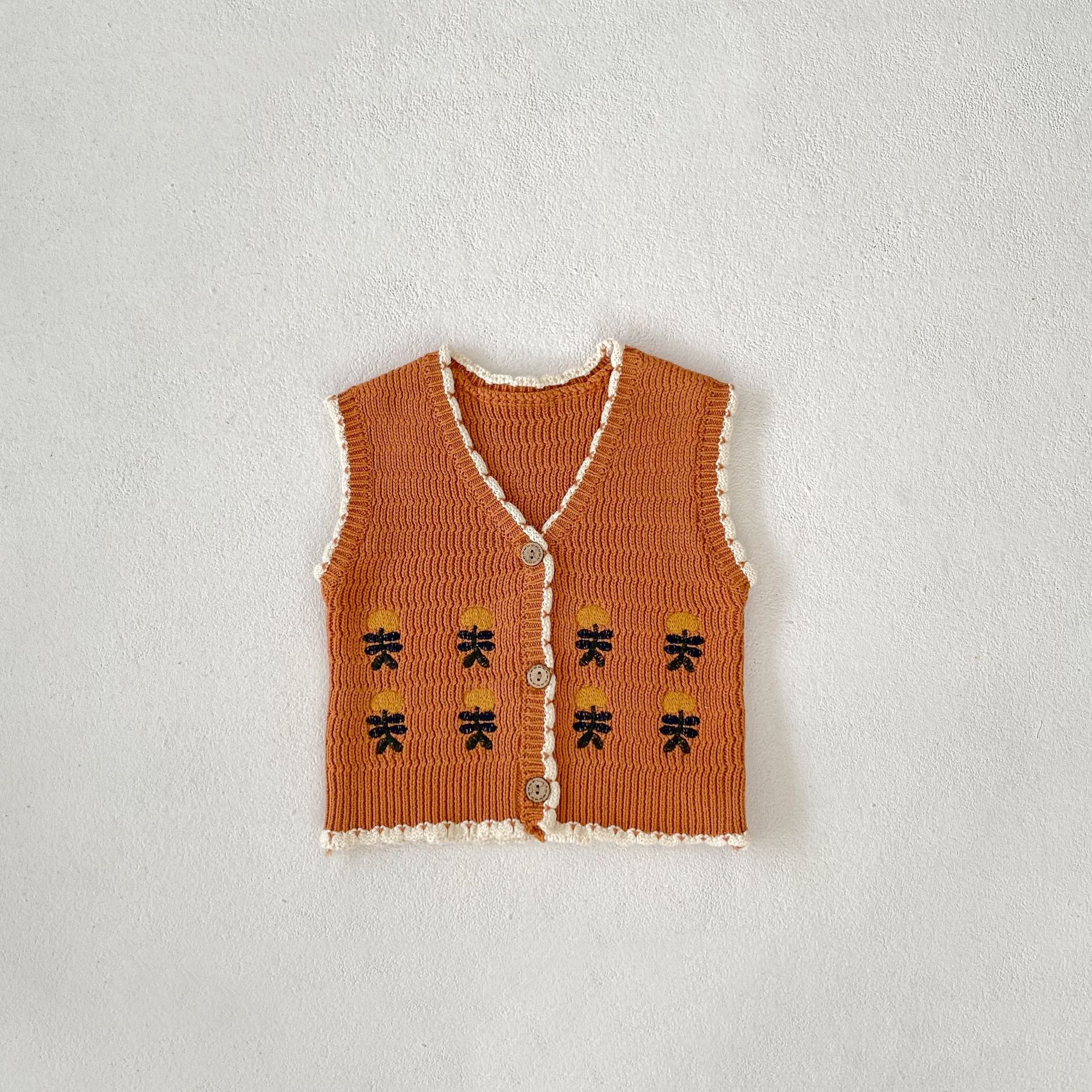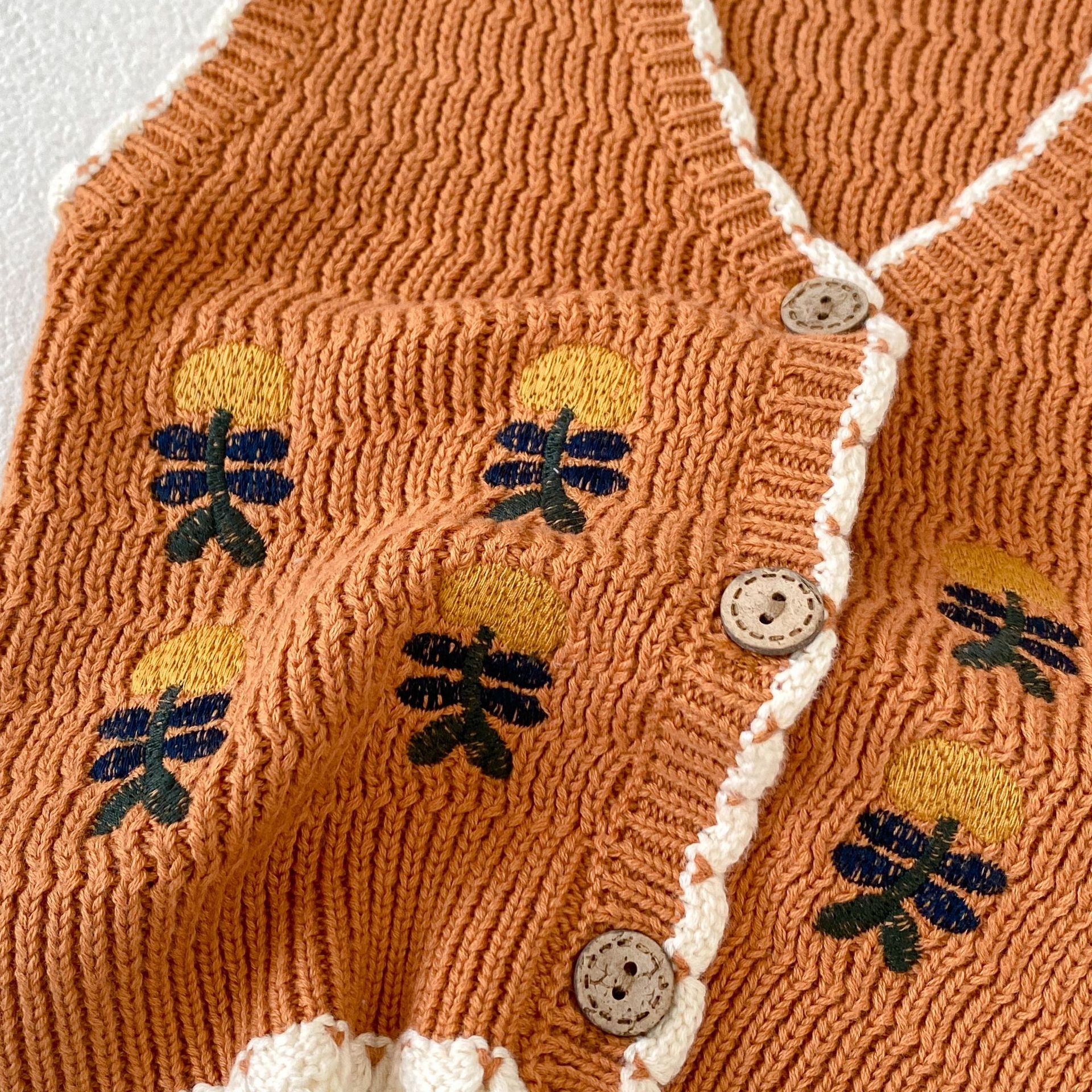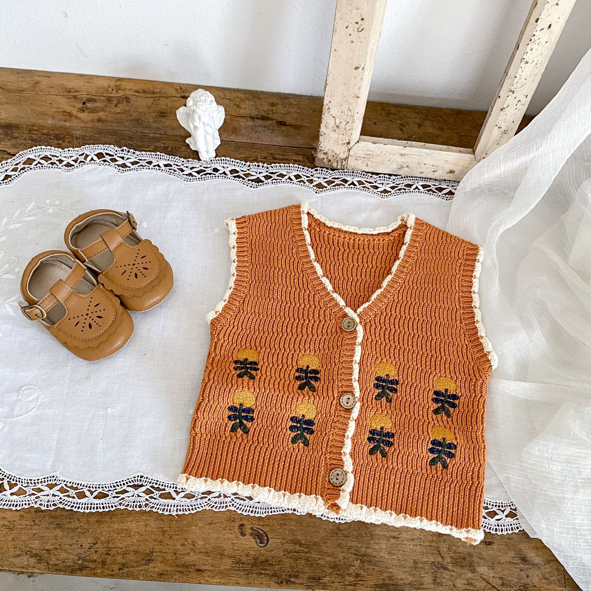 클래스 A 스웨터 2024 새로운 가을 아기 소녀 0-3 년 된 꽃 자수 가장자리 색상 니트 V 넥 작은 조끼스토어 가기