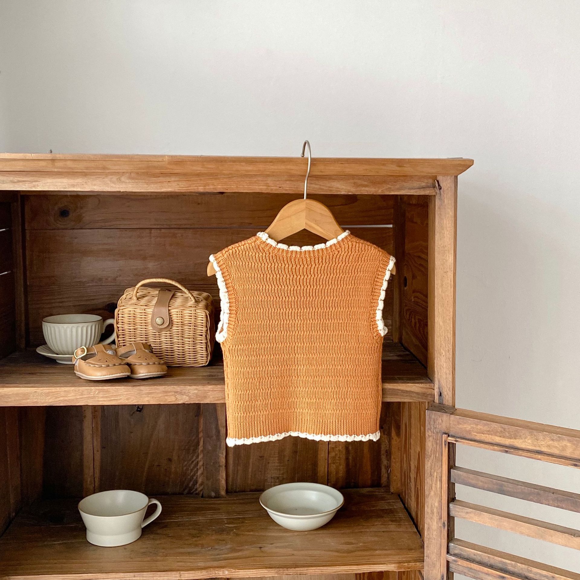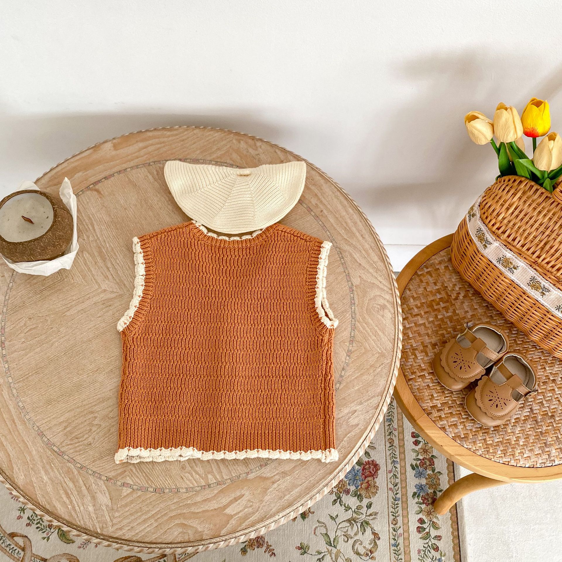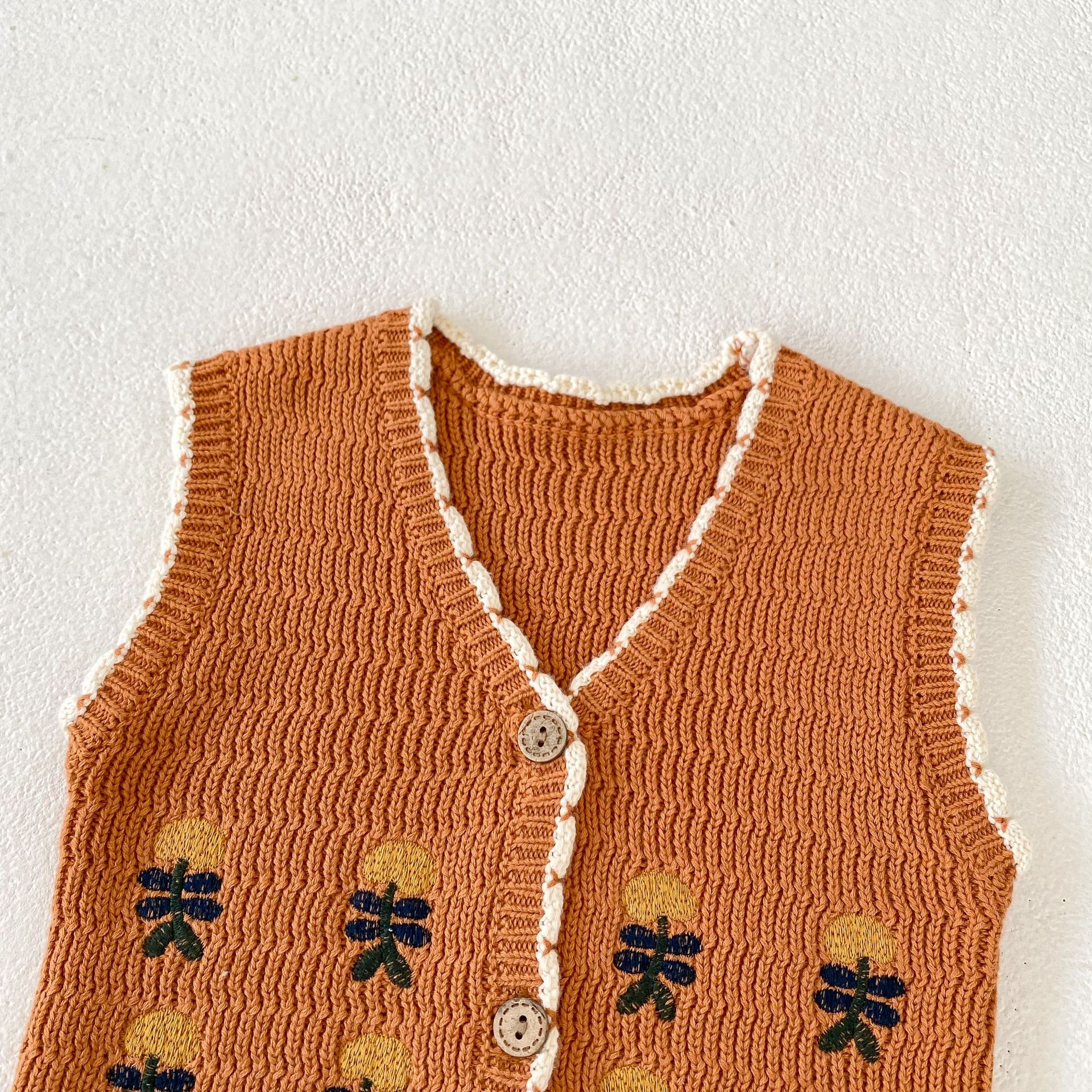 클래스 A 스웨터 2024 새로운 가을 아기 소녀 0-3 년 된 꽃 자수 가장자리 색상 니트 V 넥 작은 조끼스토어 가기