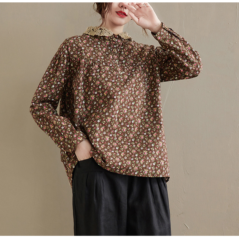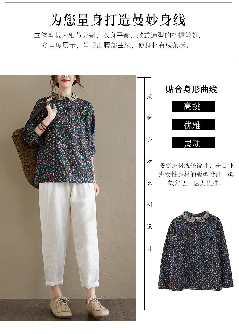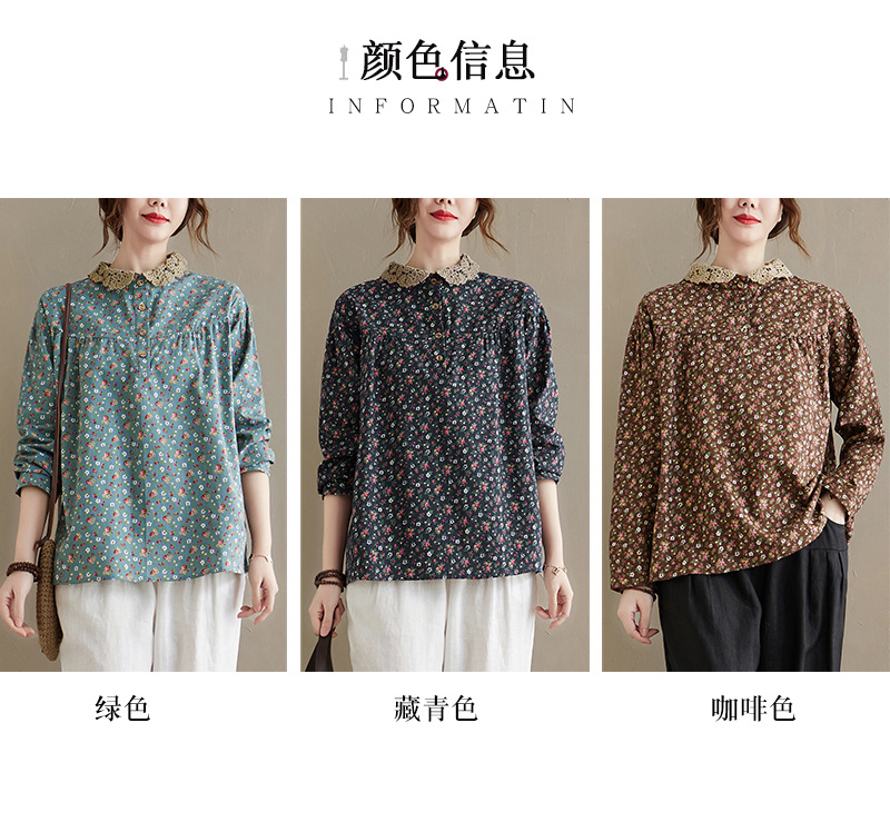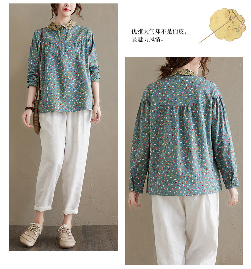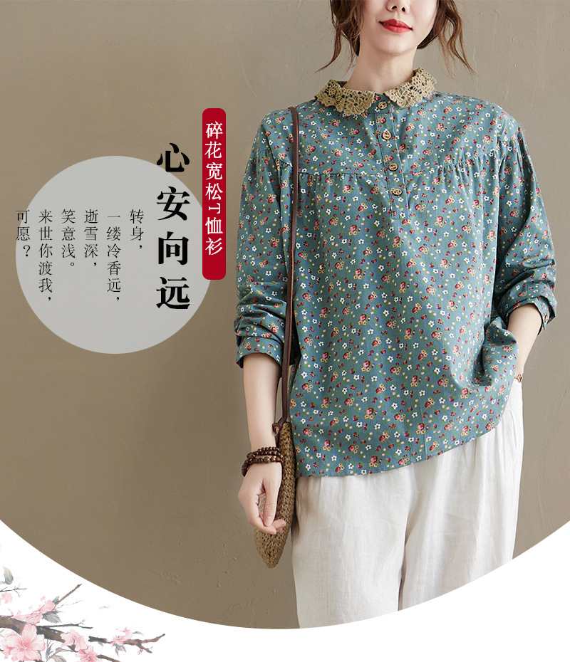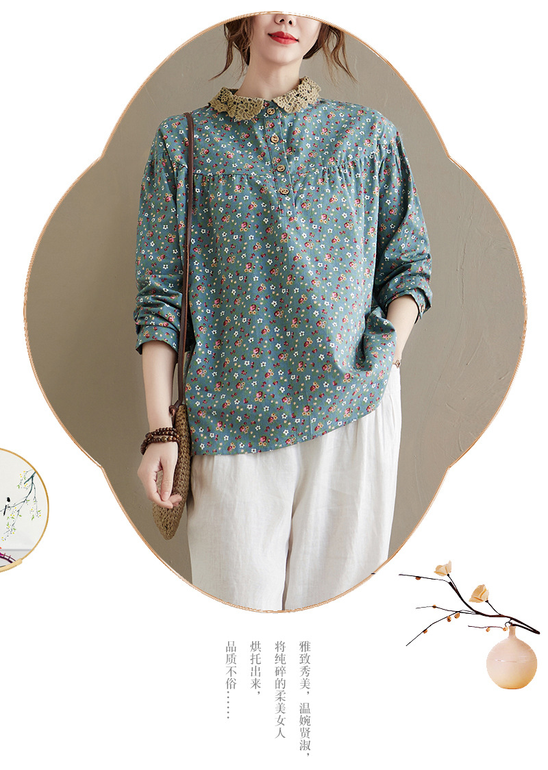 2025년 가을 신상 면마 혼방 예술적 프린트 레이스 칼라 긴팔 루즈핏 셔츠 여성용스토어 가기