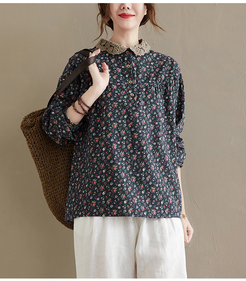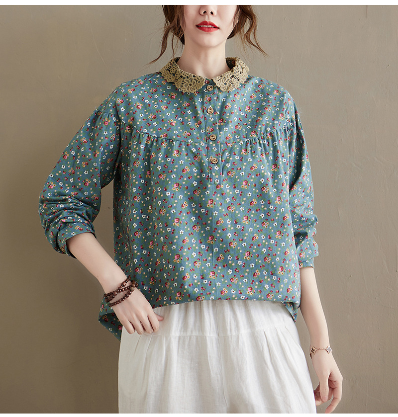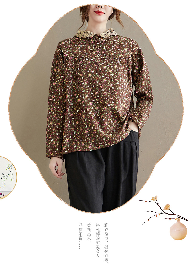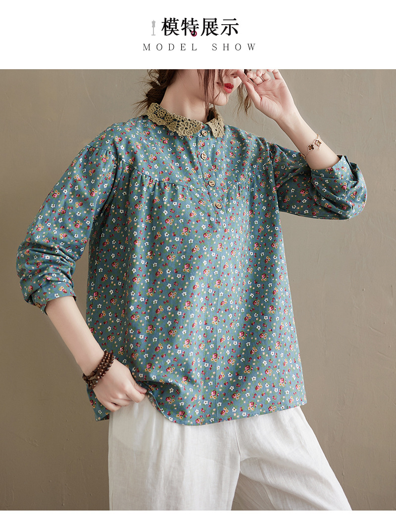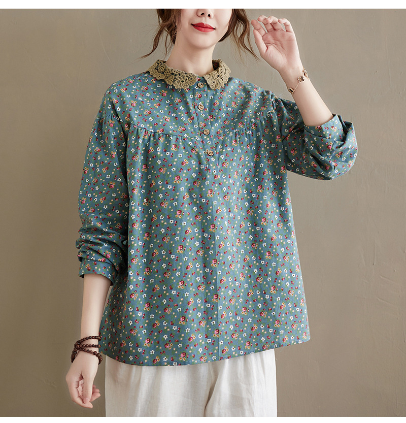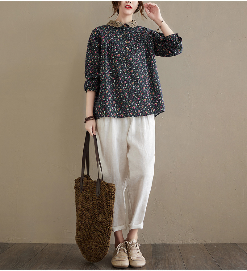 2025년 가을 신상 면마 혼방 예술적 프린트 레이스 칼라 긴팔 루즈핏 셔츠 여성용스토어 가기