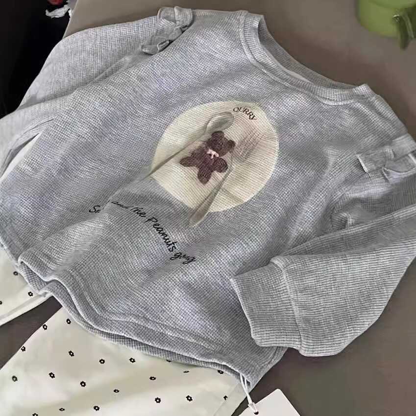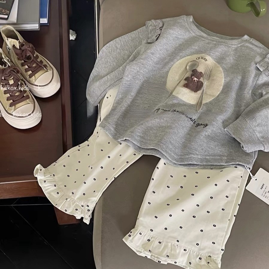 한국 스타일 소녀 2024 가을 세트 새로운 귀여운 회색 나무 귀 운동복 소녀 폴카 레이스 스트레이트 바지스토어 가기