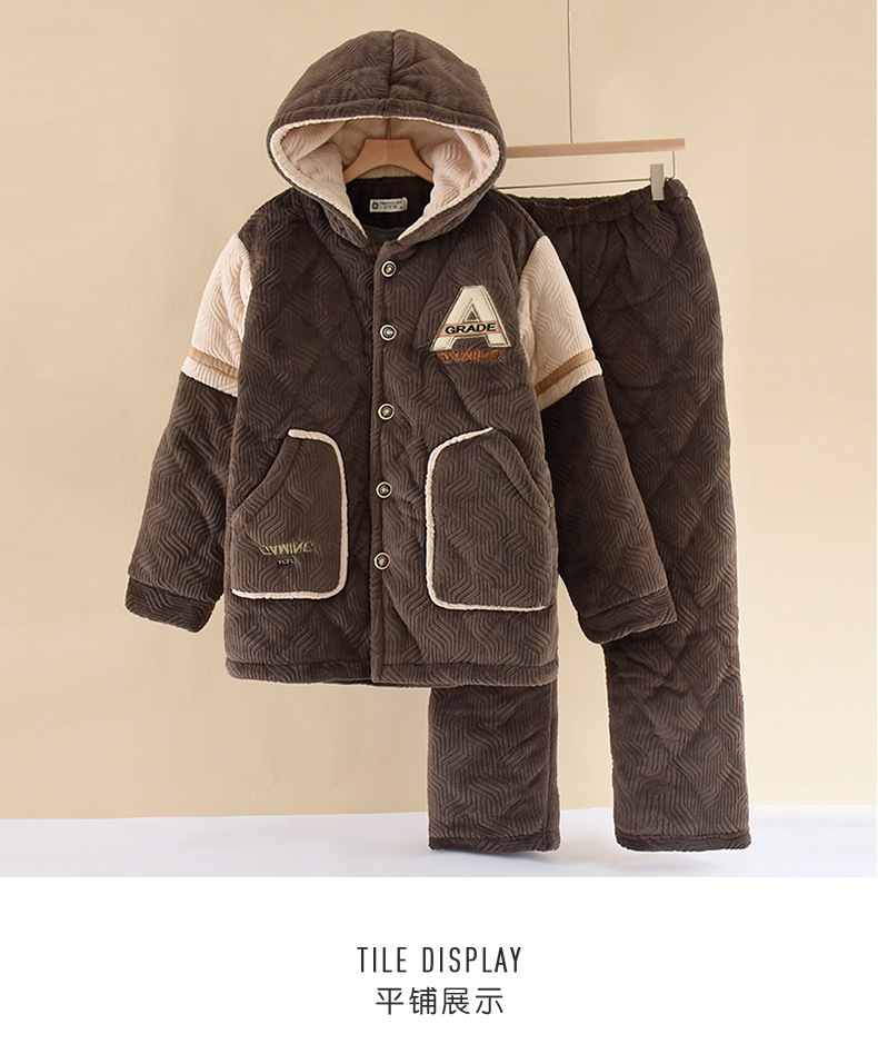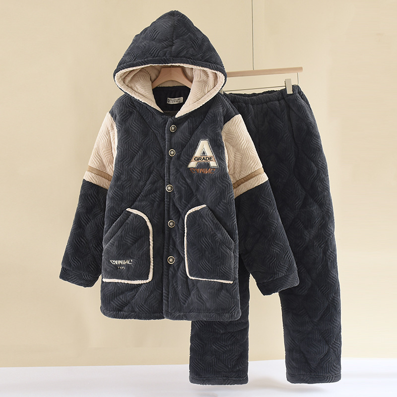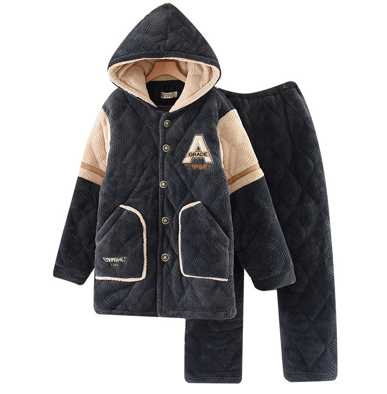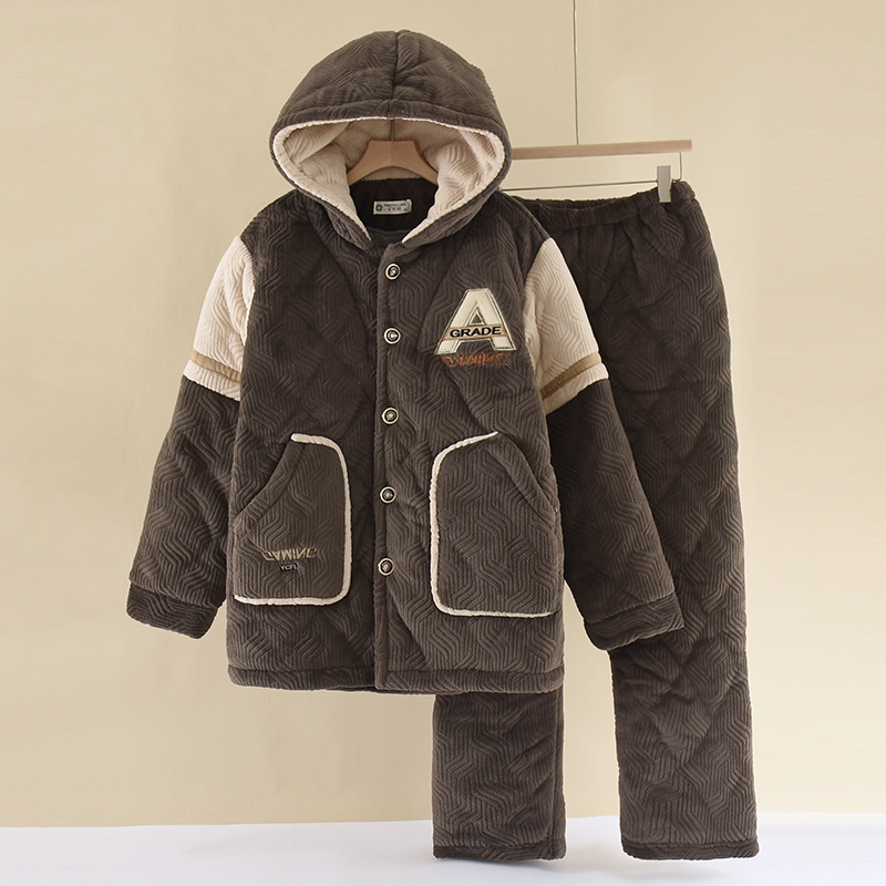 잠옷 겨울 중년 및 노인 플러스 3 층 퀼트 플란넬 남성 플러스 사이즈 따뜻한 산호 양털 홈 의류 세트