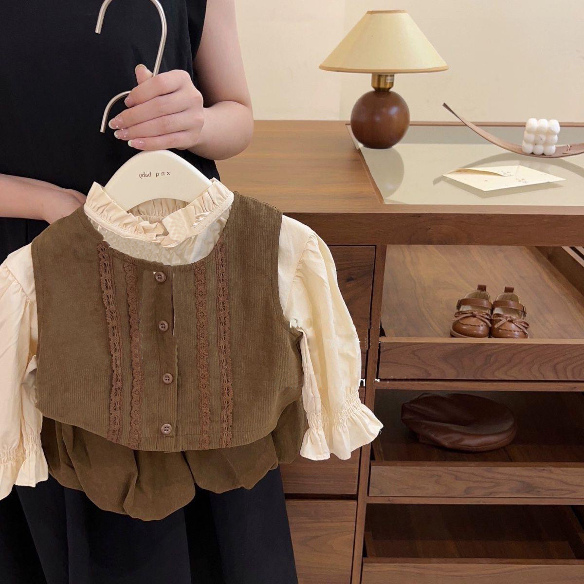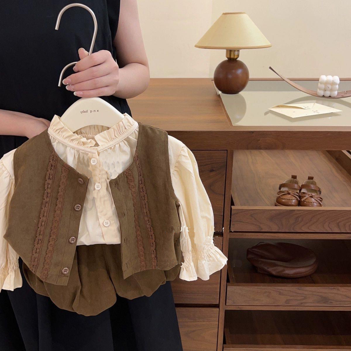 소녀 세트 봄 새로운 레이스 셔츠 조끼 반바지 세 조각 세트 어린이를위한 머리카락스토어 가기