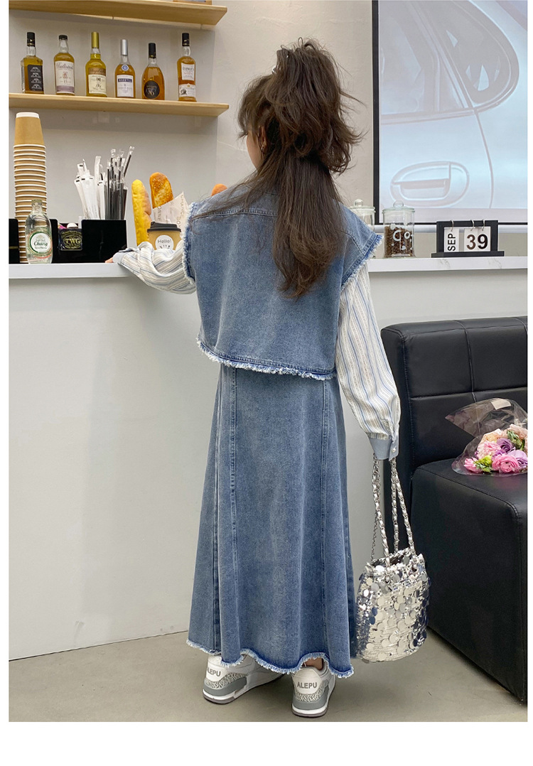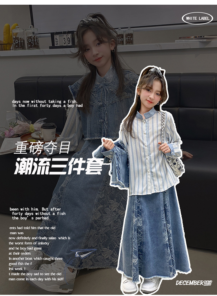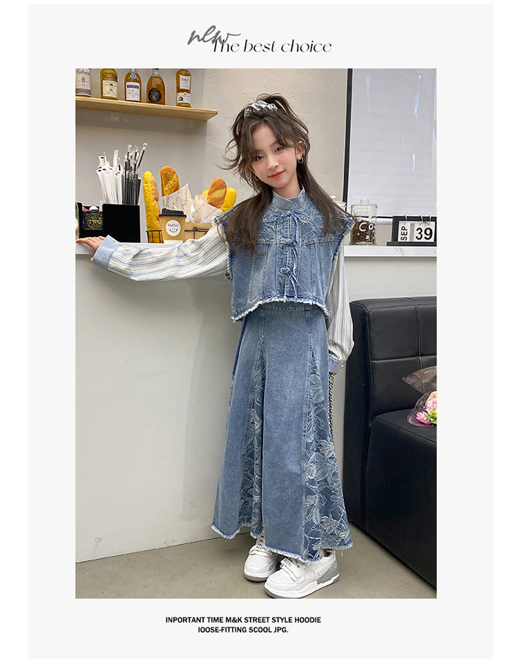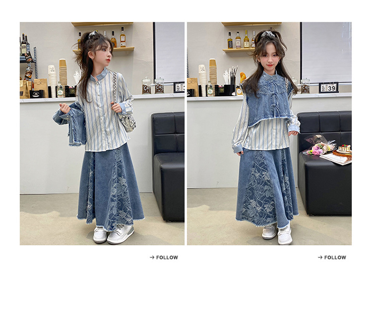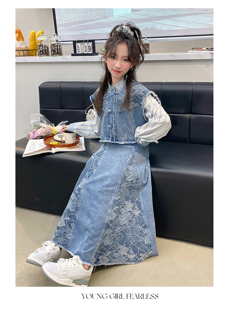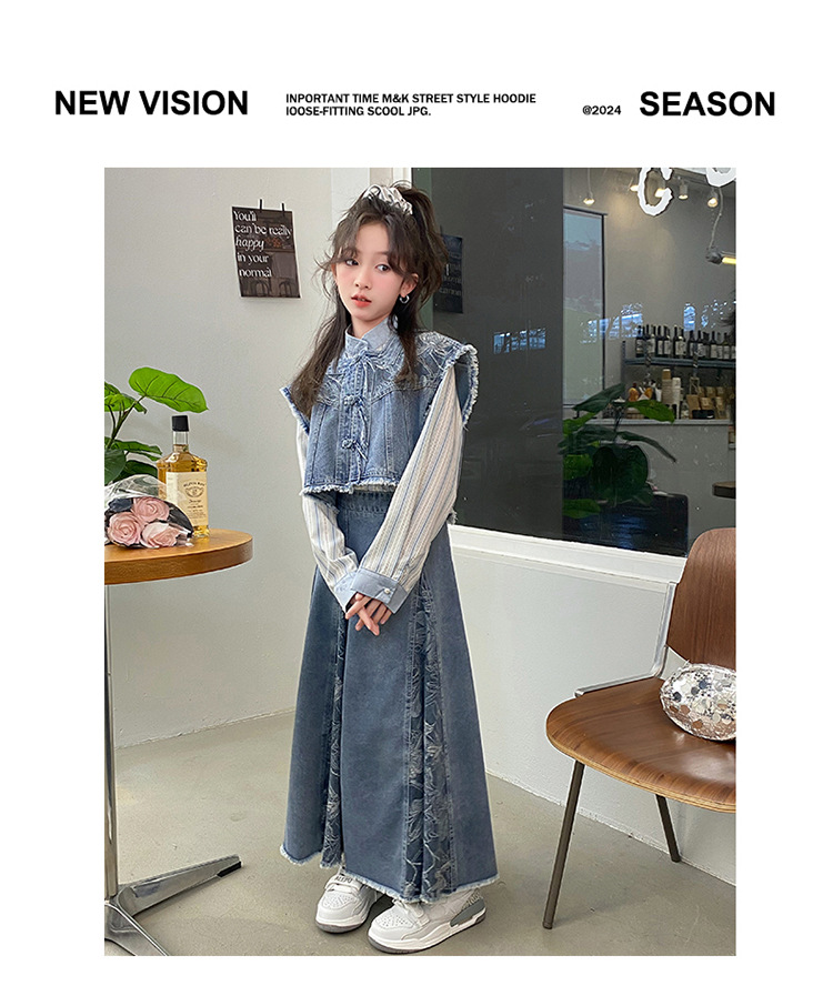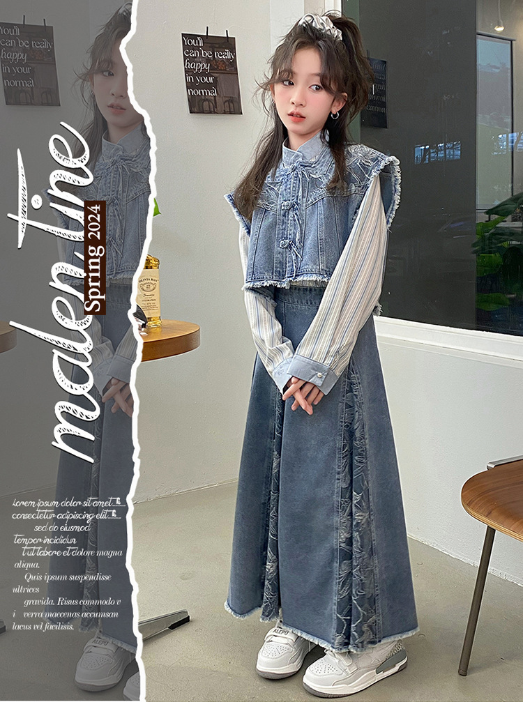 소녀 원피스 봄과 가을 2024 새로운 서양식 어린이 국가 스타일 새로운 중국 스타일 데님 봄 큰 어린이 치마 세트스토어 가기
