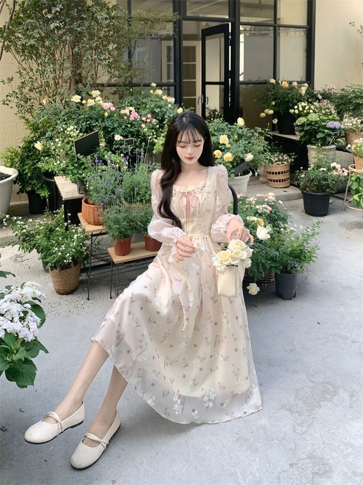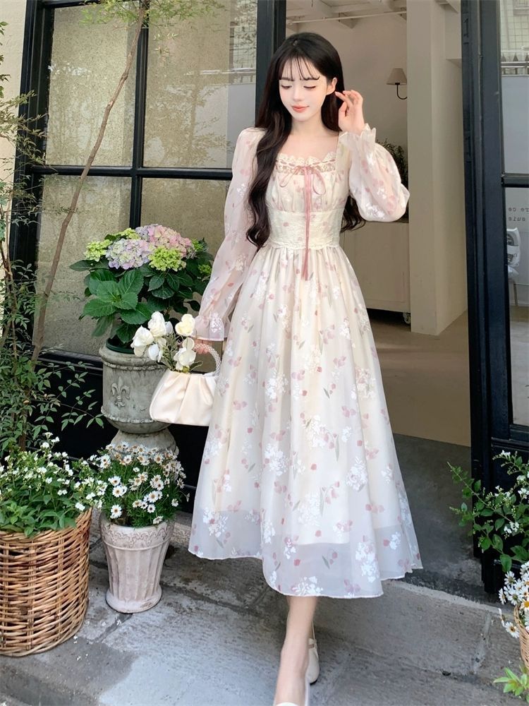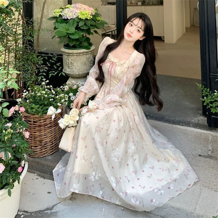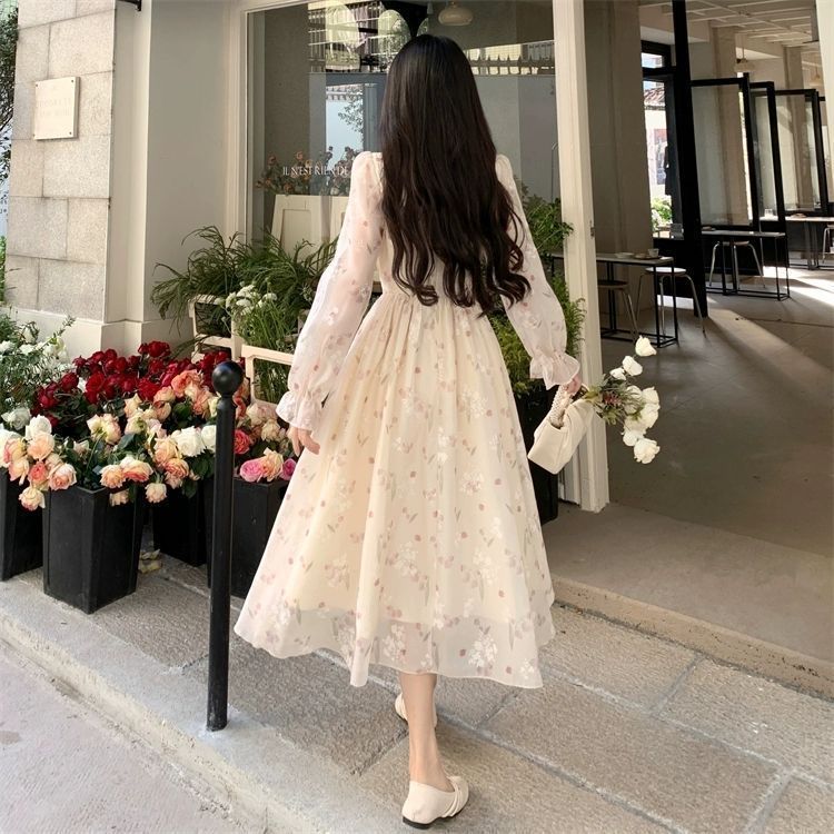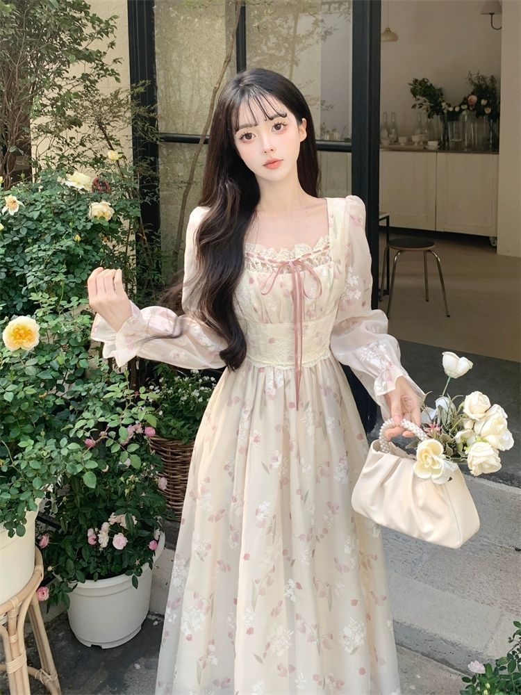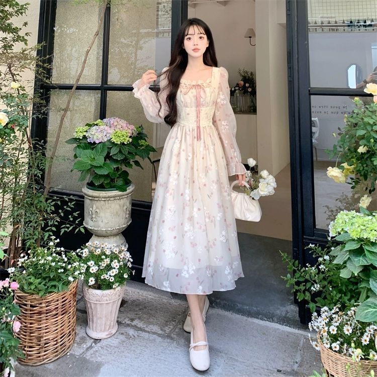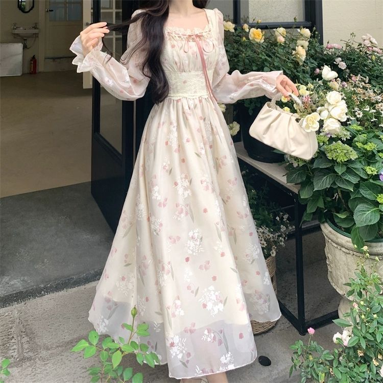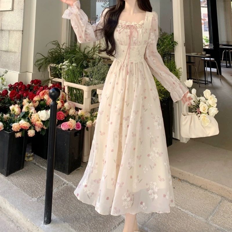 플러스 사이즈 이른 봄 프렌치 스퀘어 넥 자카드 요정 롱 스커트 허리 슬리밍 스위트 긴팔 쉬폰 드레스 여성 의류스토어 가기