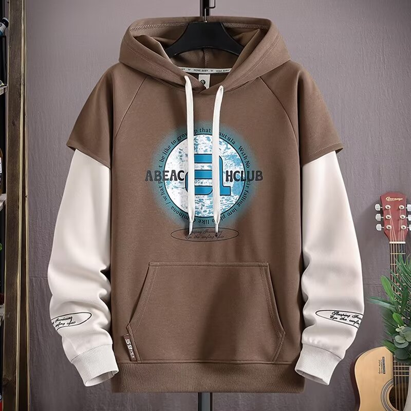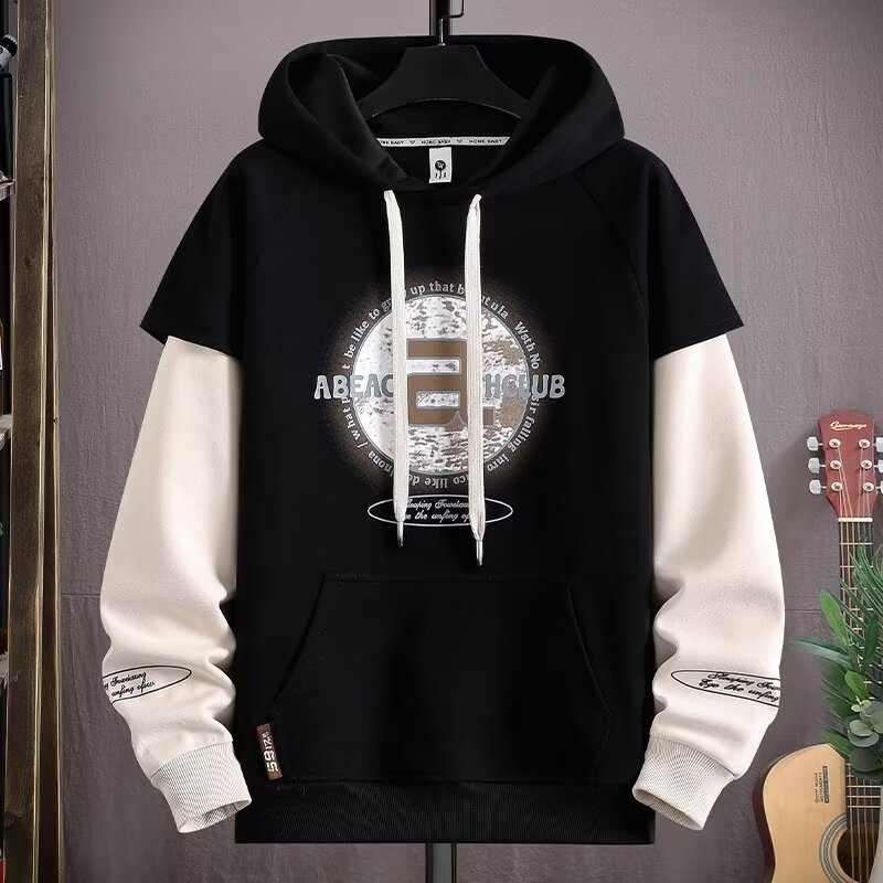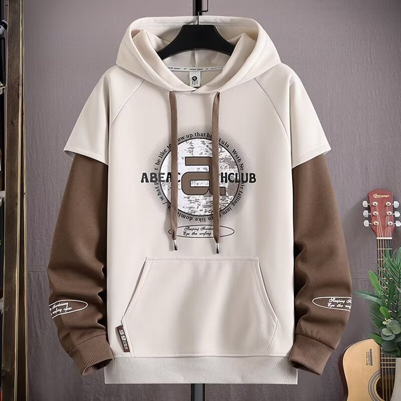 Douyin 라이브 방송 폭발 후드 스웨터 남자 풀오버 핸즈섬 스포츠 레저 칼리지 스타일 가짜 투피스 패션 재킷