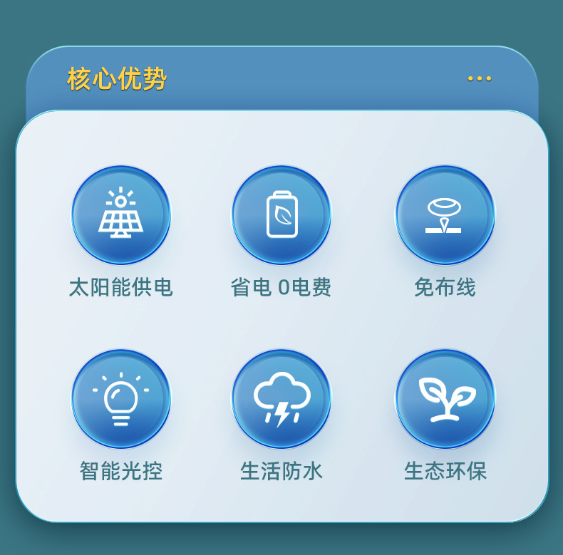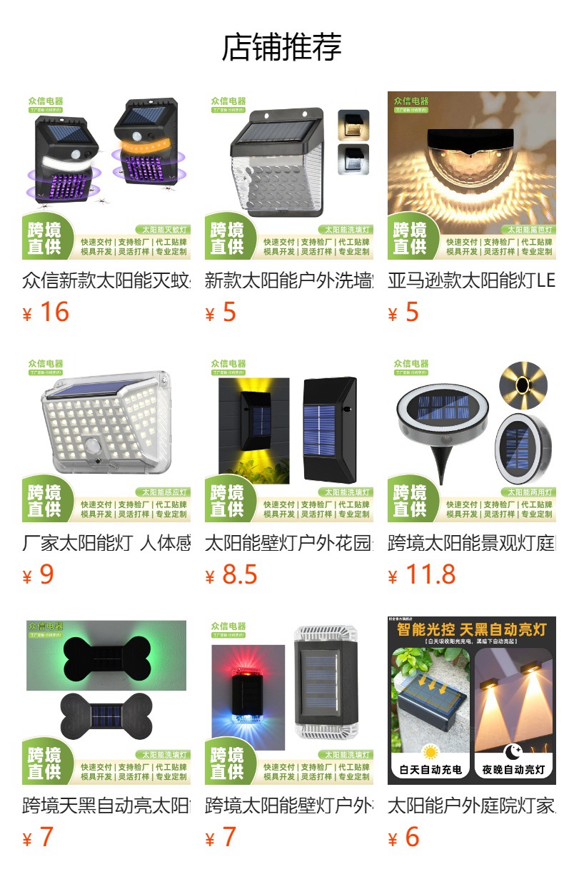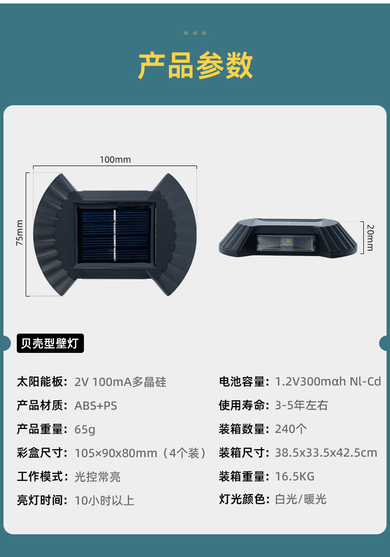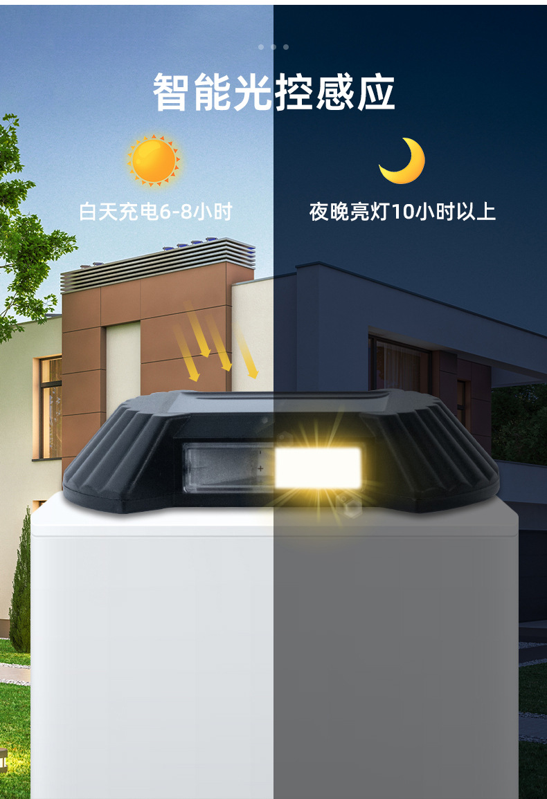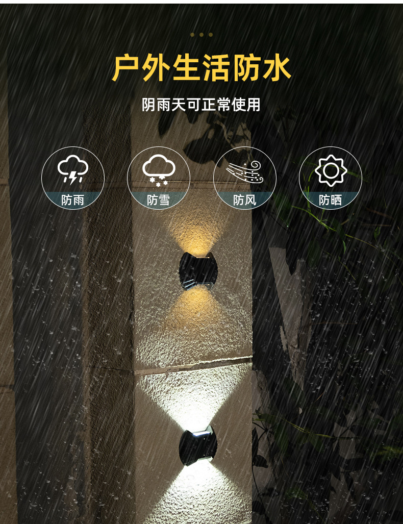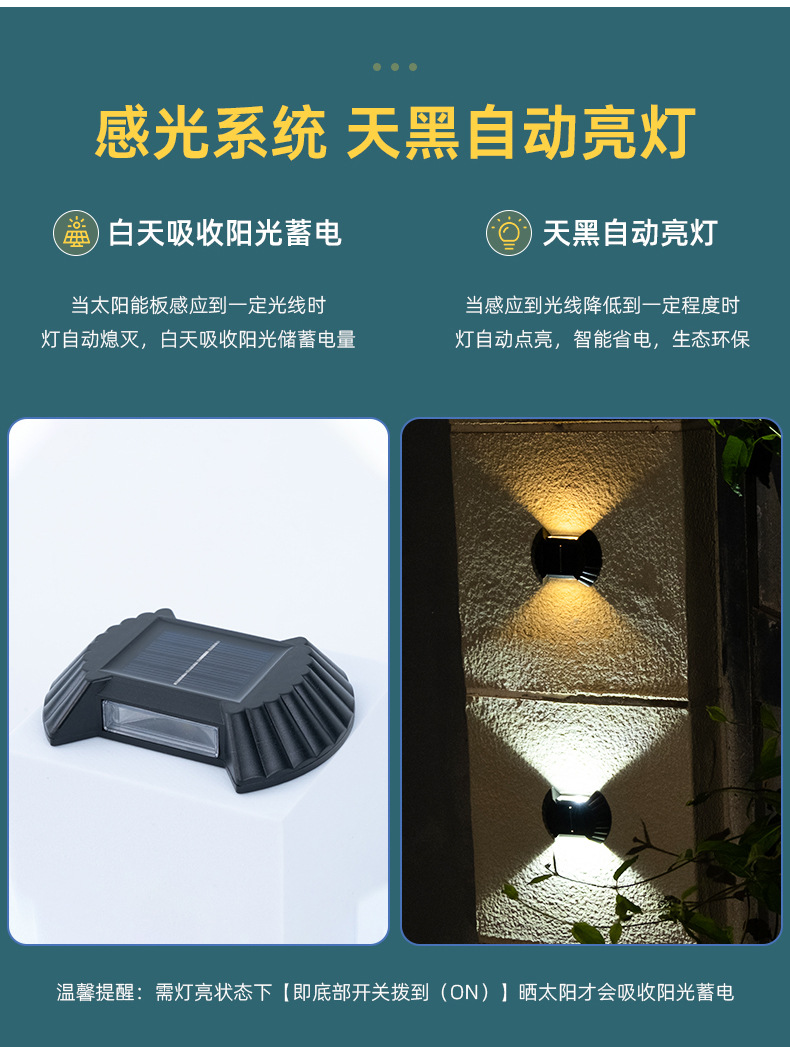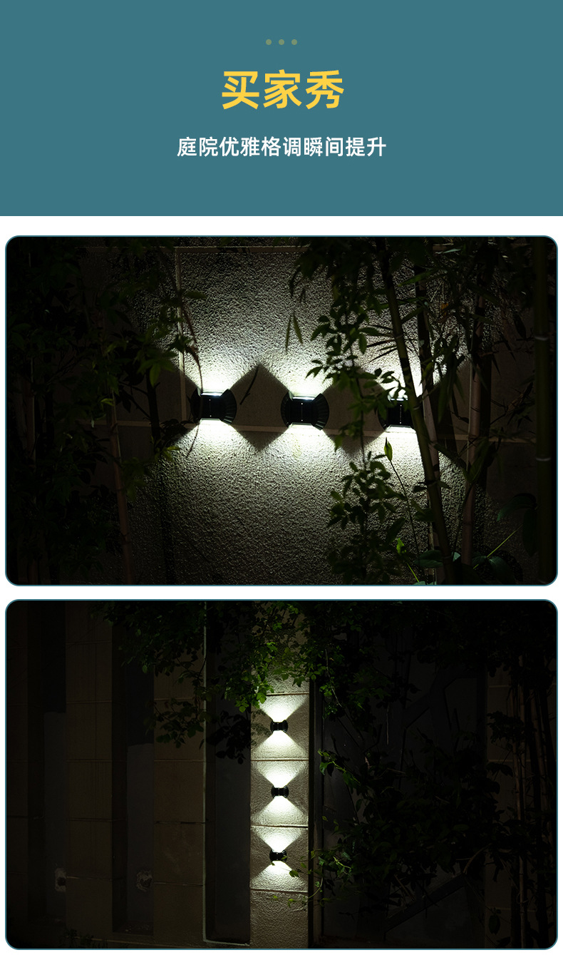 产品卖点:太阳能壁灯,防水设计,更大的发光面积,更好的光斑效果。