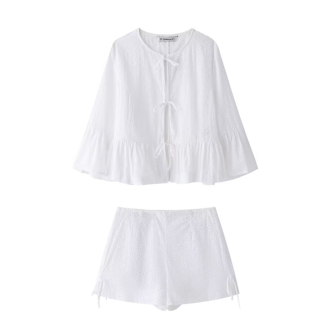 국경 AliExpress 새로운 여성 의류 대외 무역 도매 ZR 재고 중공 자수 셔츠 캐주얼 반바지 세트