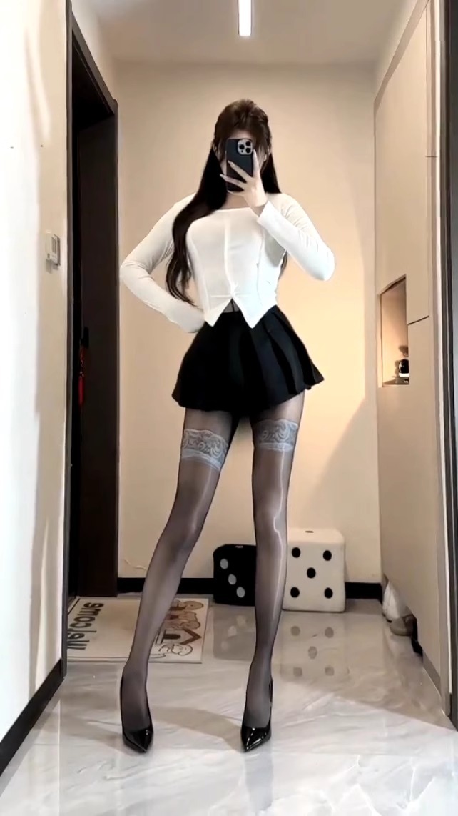 穿搭方法:先穿大腿袜,大腿袜穿好之后,然后外面再套上(珠光)连裤丝袜。