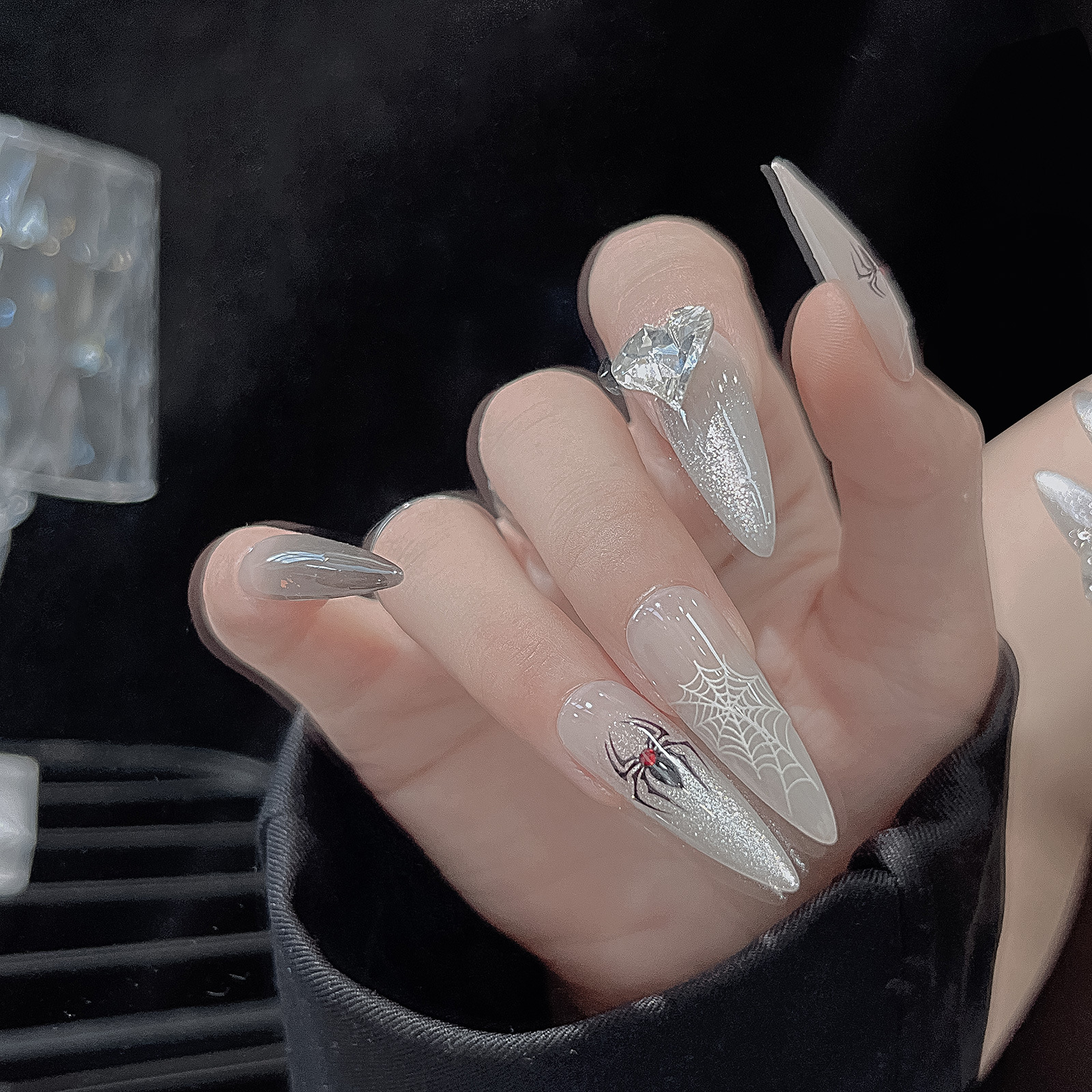 유럽과 미국 스타일의 달콤한 시원한 어두운 거미 흰색 실크 메쉬 네일 쥬얼리 복고풍 중공 릴리프 네일 다시 접착 페이스트 도매스토어 가기