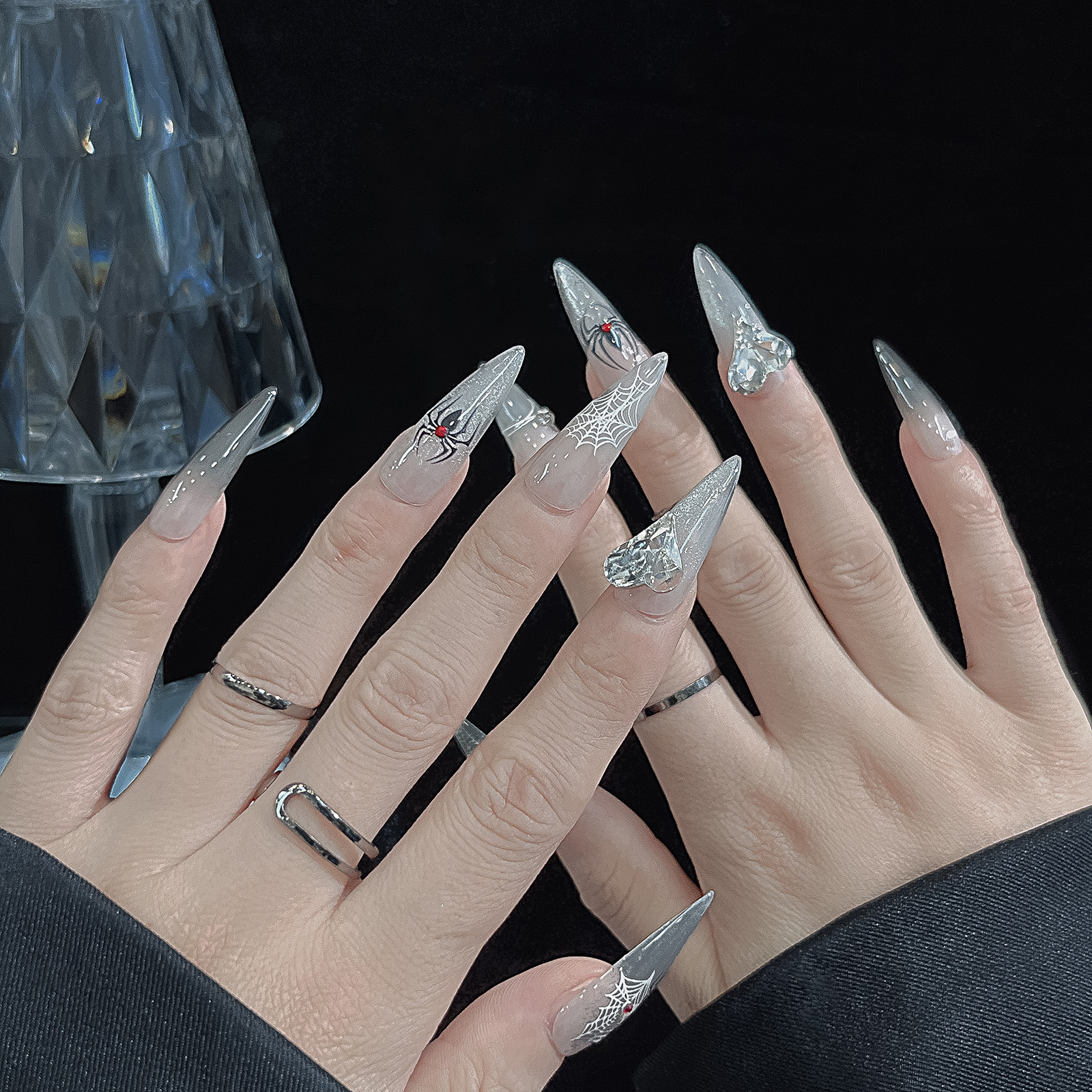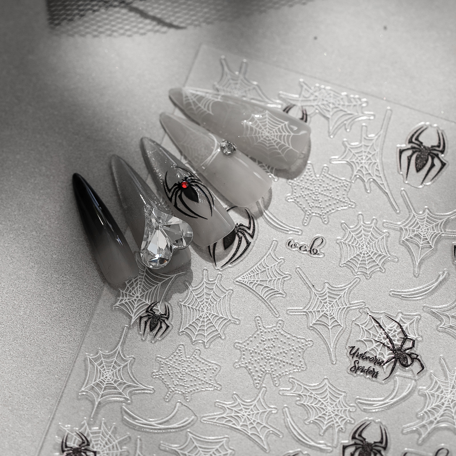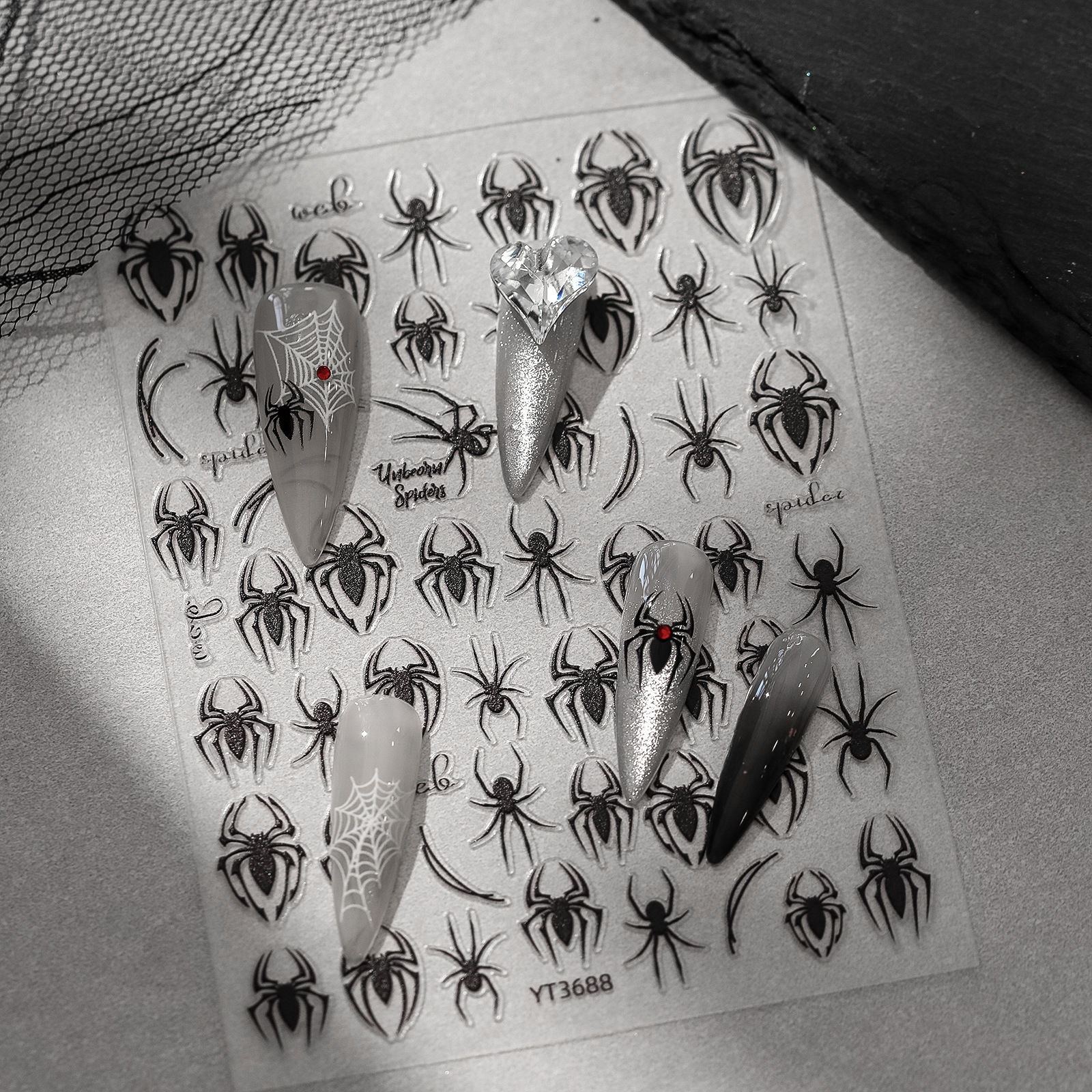 유럽과 미국 스타일의 달콤한 시원한 어두운 거미 흰색 실크 메쉬 네일 쥬얼리 복고풍 중공 릴리프 네일 다시 접착 페이스트 도매