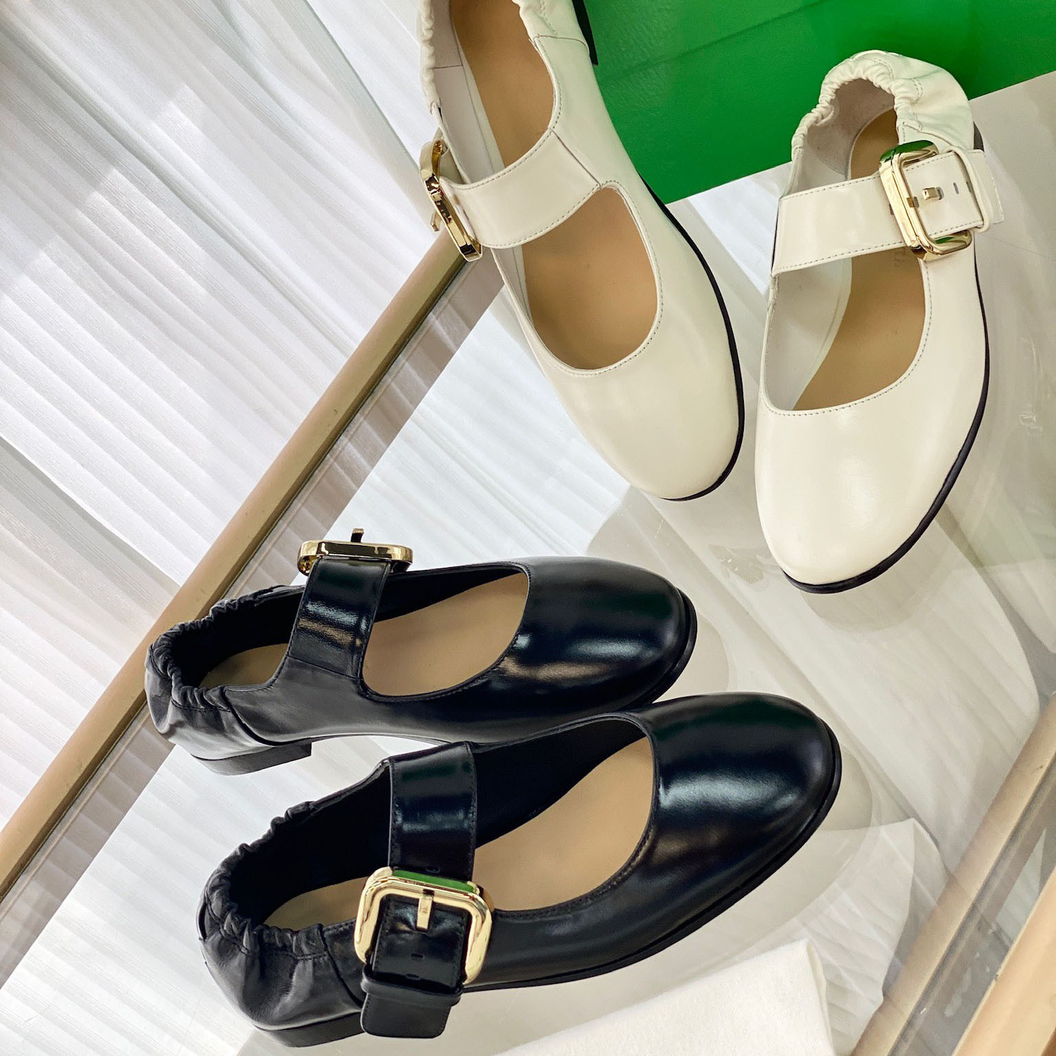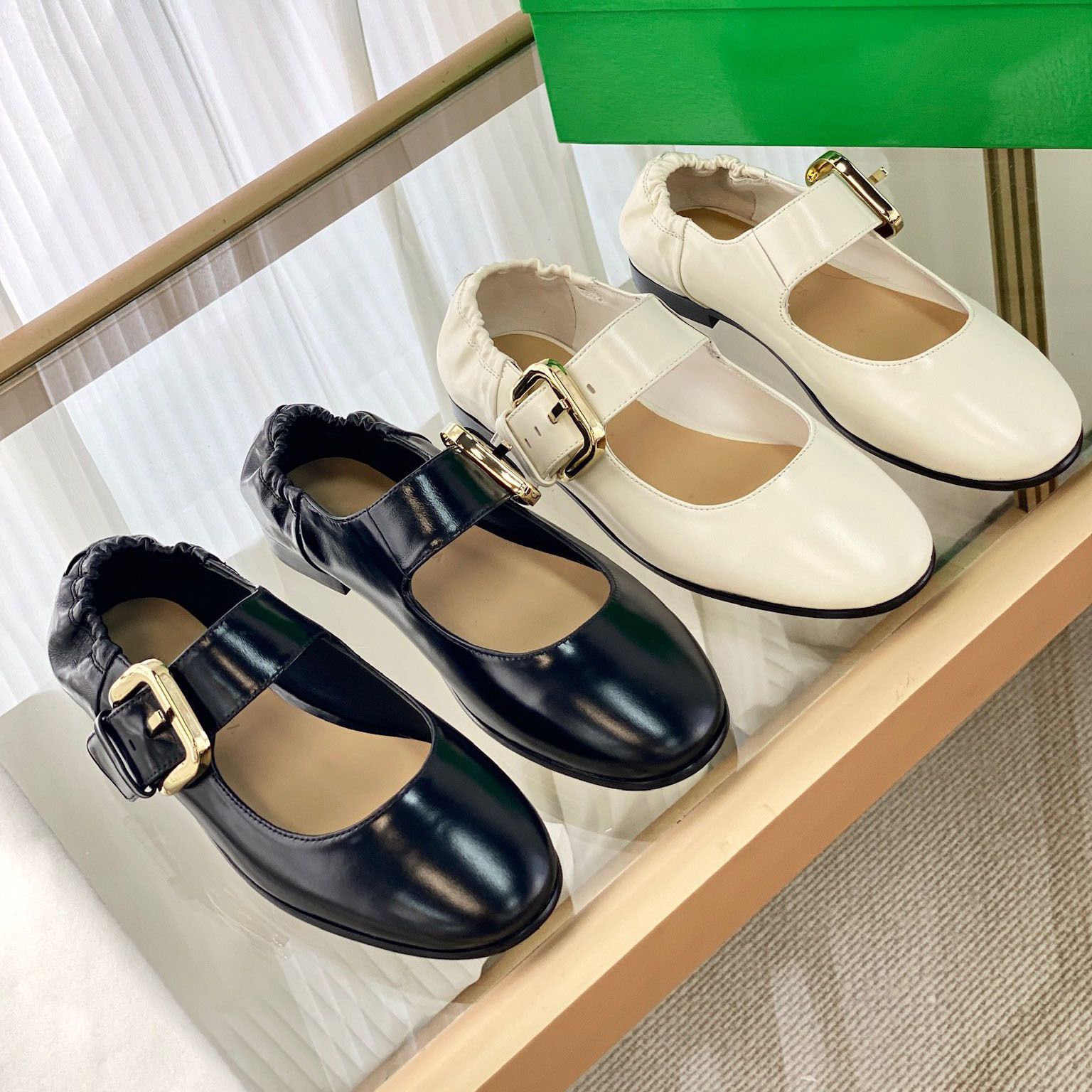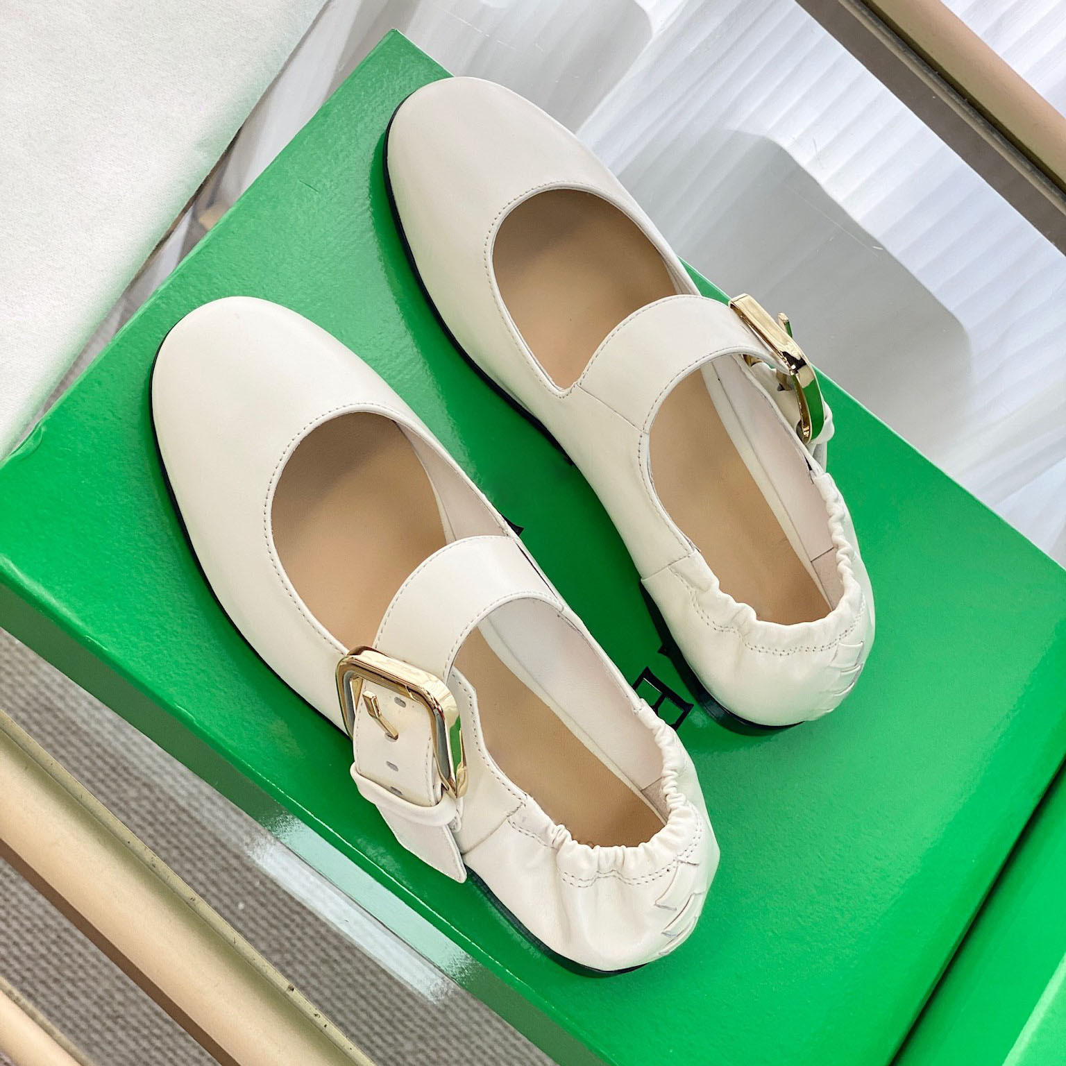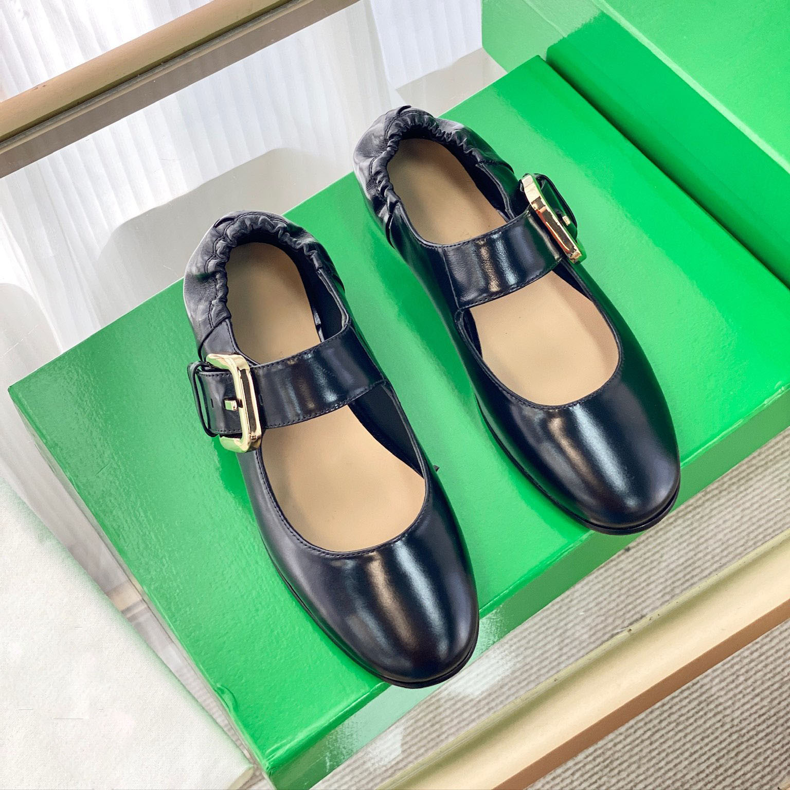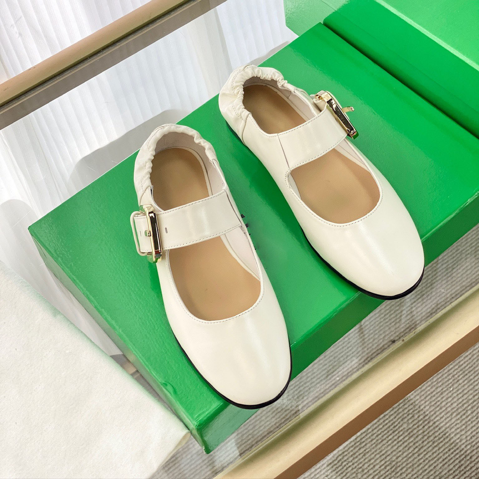 여름 새로운 도착 프랑스 정품 가죽 주름 금속 벨트 버클 메리 제인 신발 평평하고 편안한 발레 신발 캐주얼스토어 가기