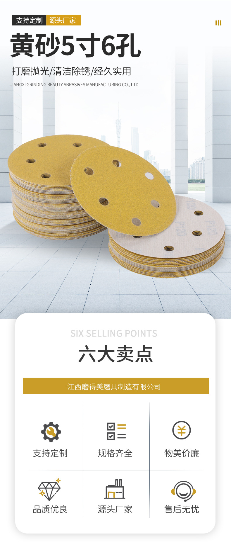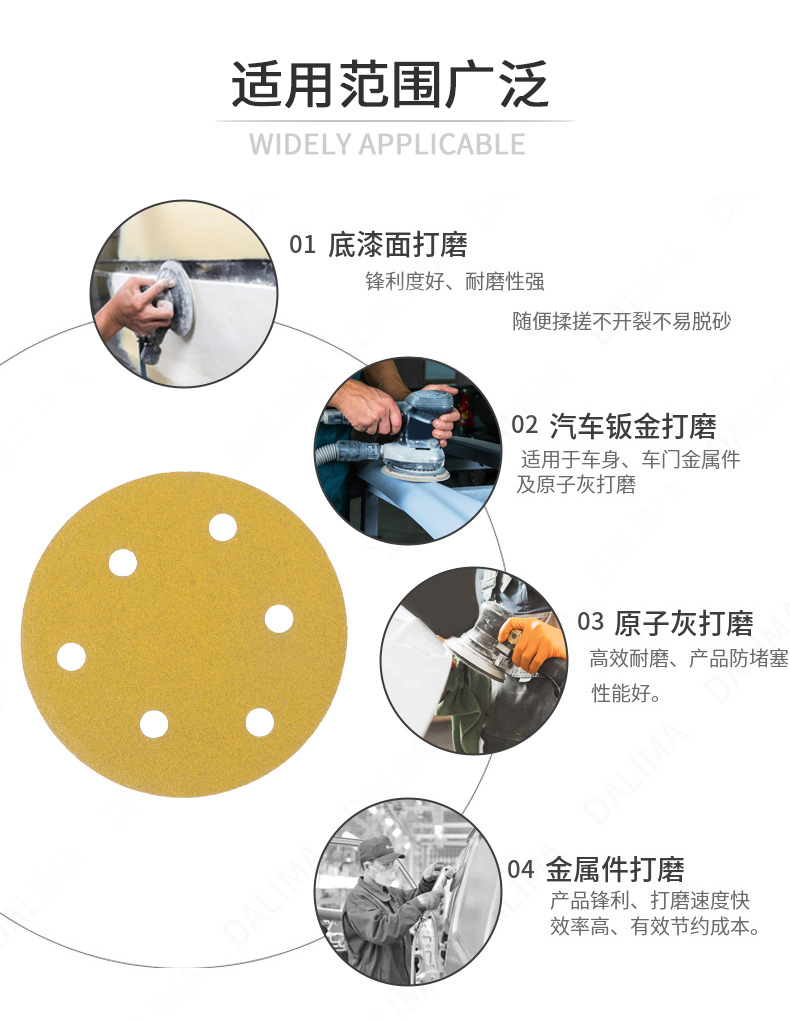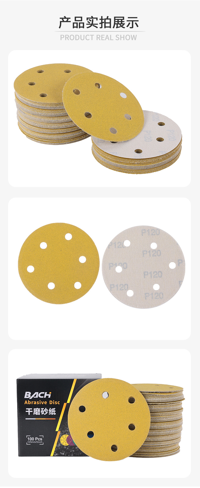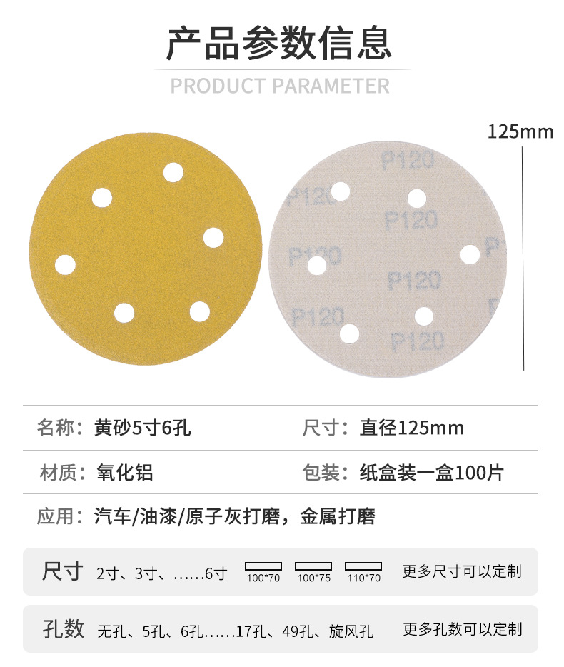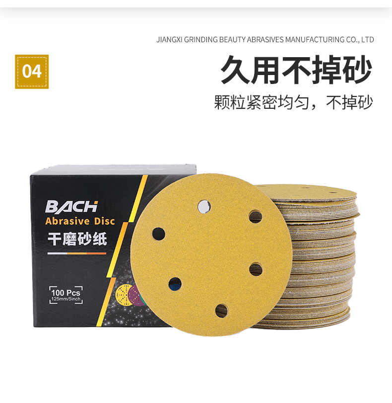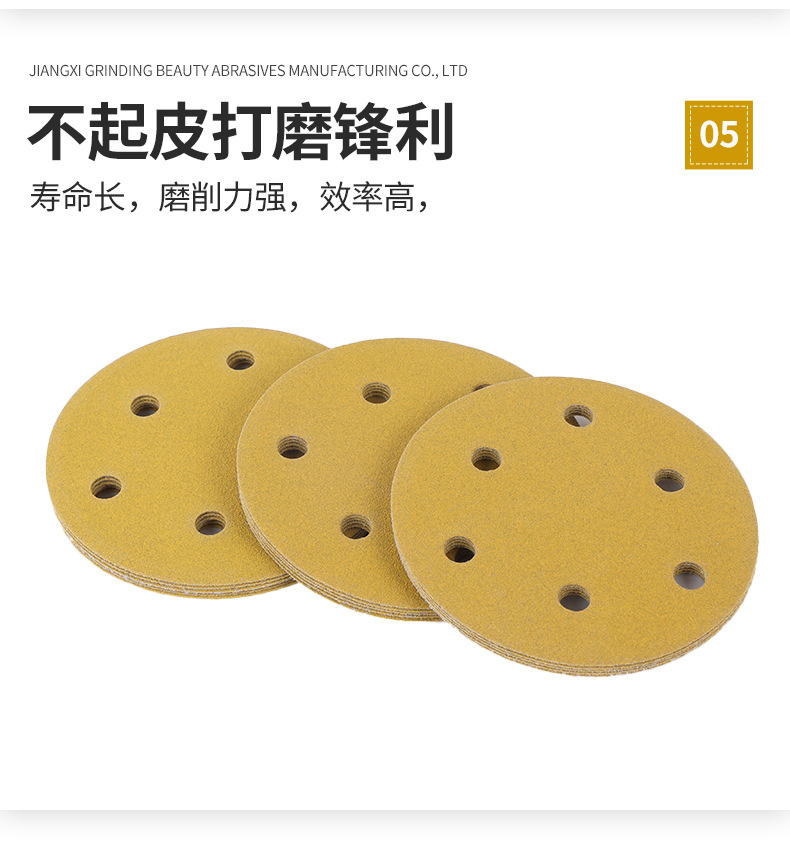 노란색 모래 5 인치 6 홀 플록 사포 알루미늄 합금 쉘 연마 종이 자동차 페인트 금속 연마 사포 도매