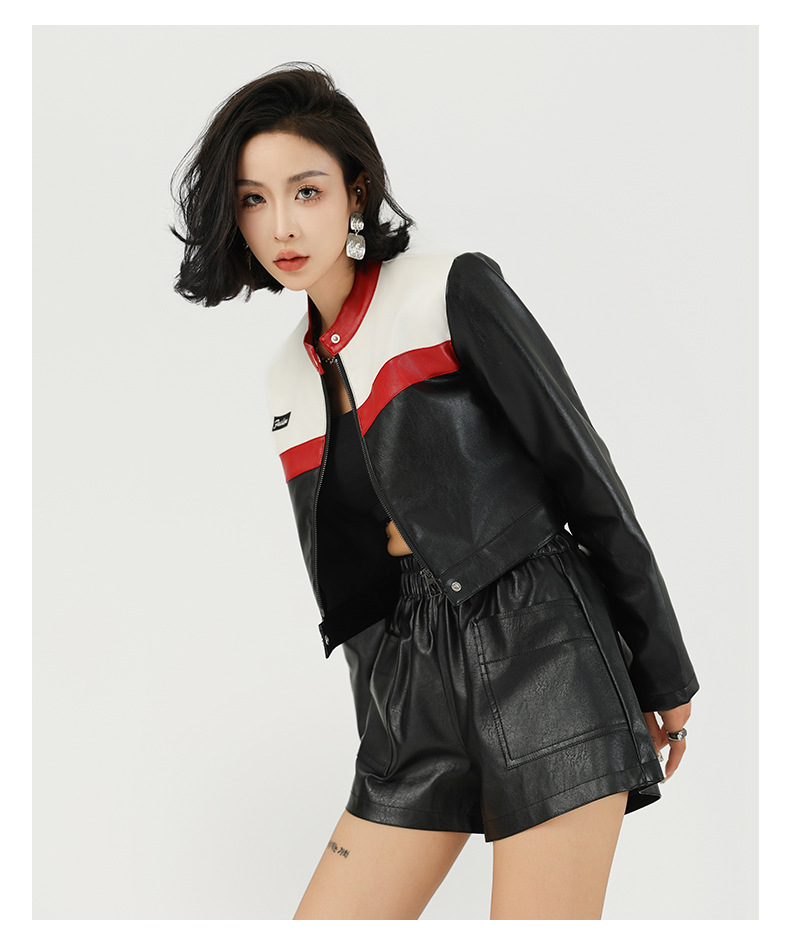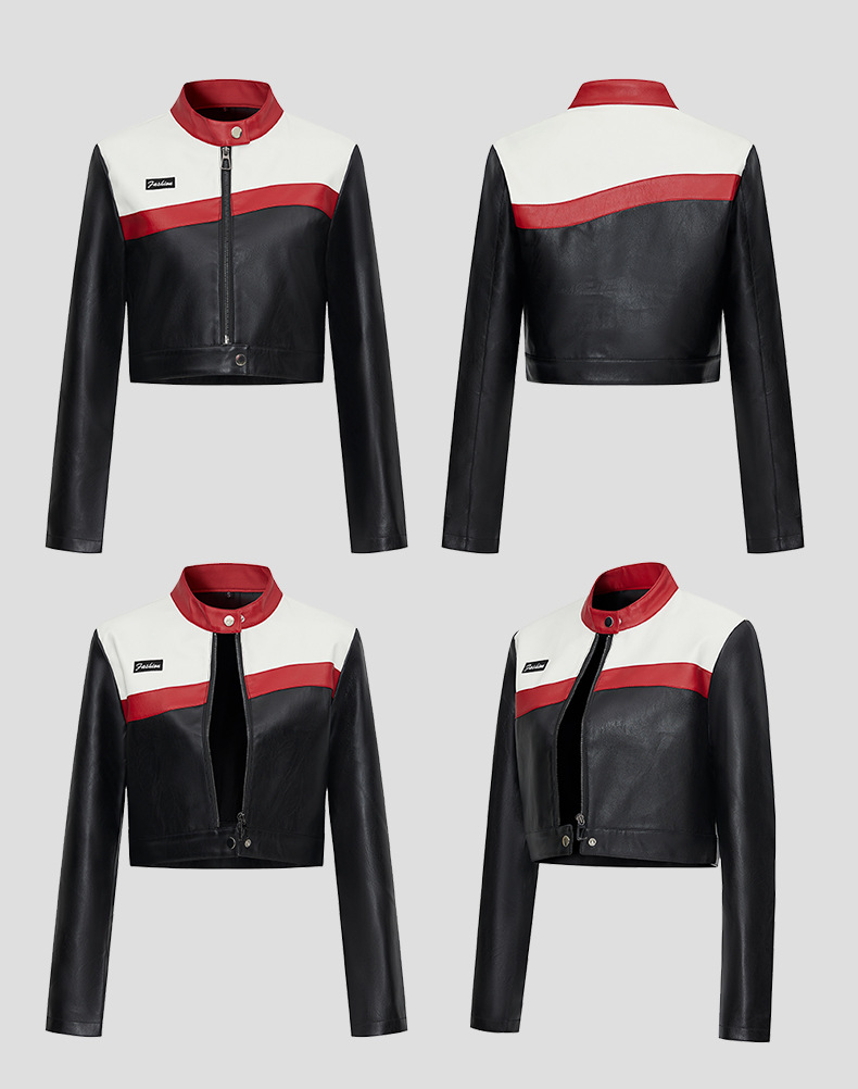 새로운 대비색 스티치 오토바이 재킷, 파일럿 재킷, 여성용 짧은 버전 재킷, 여성용 가죽 재킷, 대외 무역 크로스보더 가죽 재킷, 여성용 맞춤 제작스토어 가기