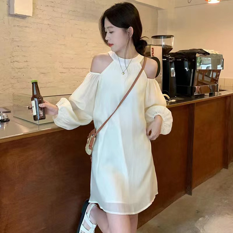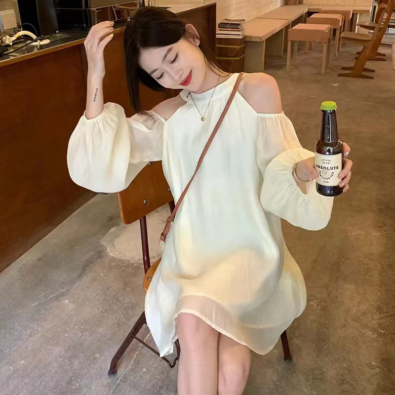 어깨 목 디자인 원피스 가을 2024 새로운 느슨한 패션 우아한 살구색 짧은 치마 여성스토어 가기