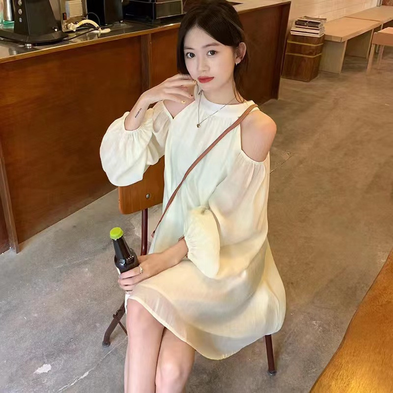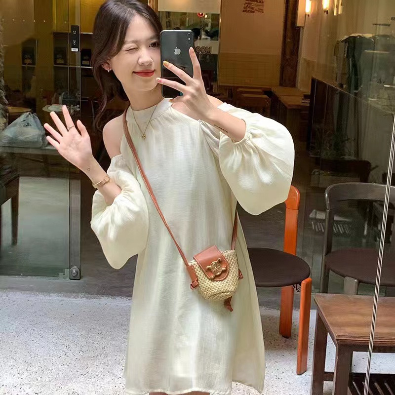 어깨 목 디자인 원피스 가을 2024 새로운 느슨한 패션 우아한 살구색 짧은 치마 여성