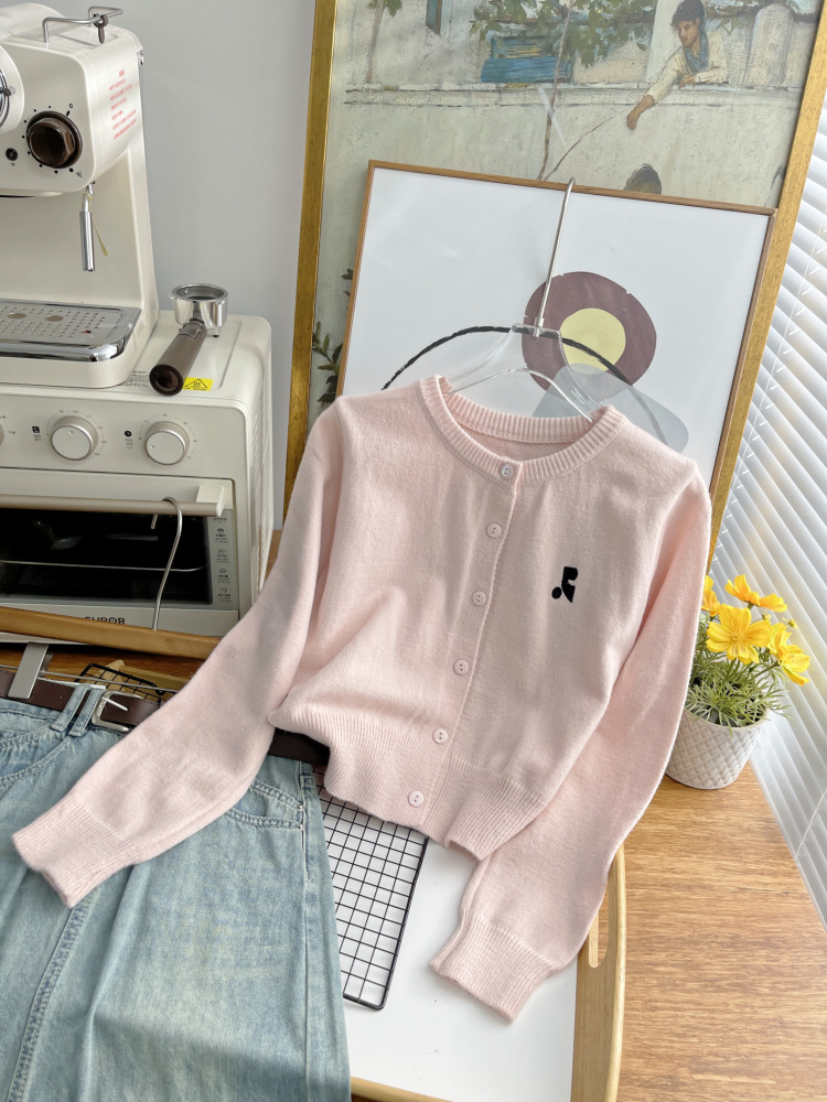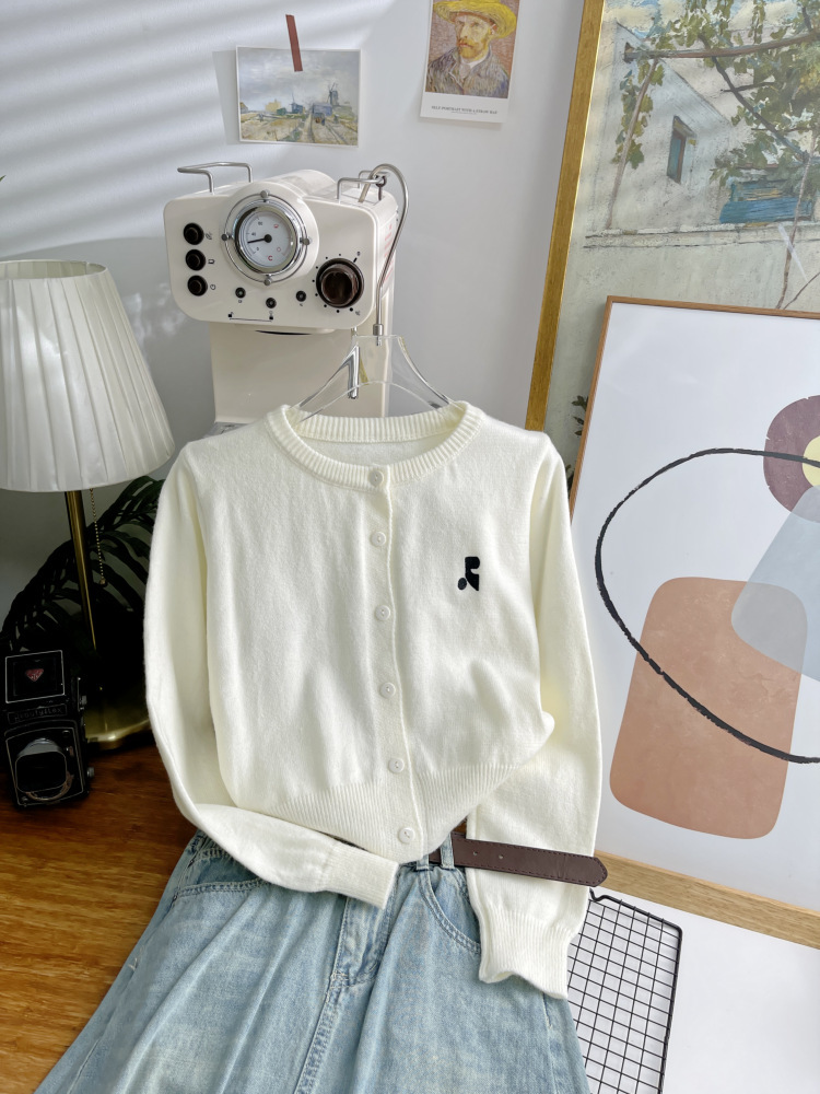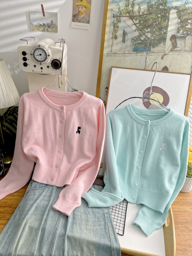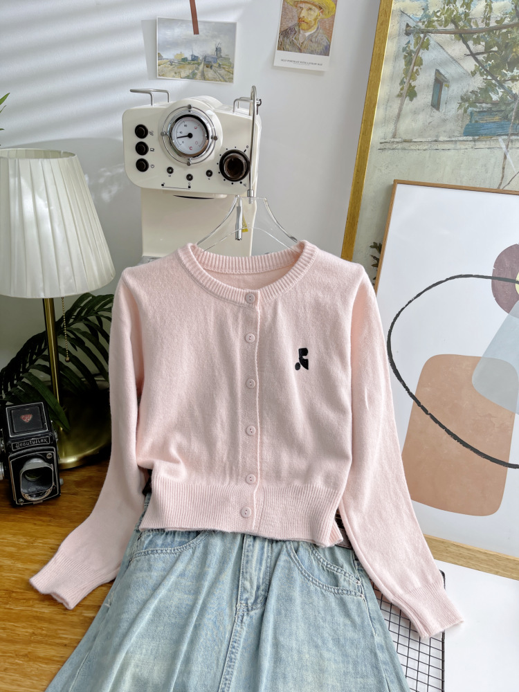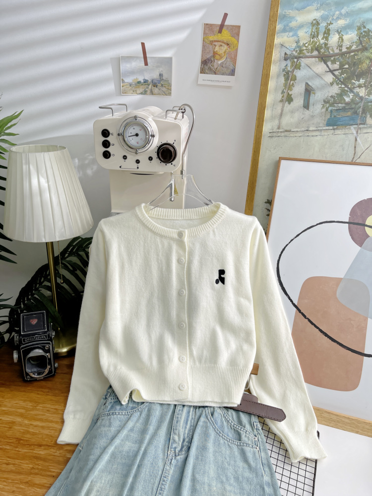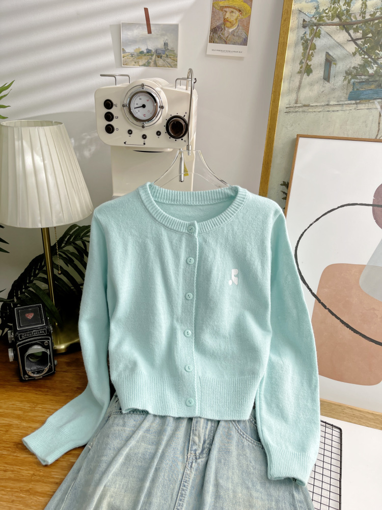 2024 년 가을 새 한국 동대문 자수 작은 라벨 짧은 단색 허리 긴 소매 니트 카디건 여성 4598