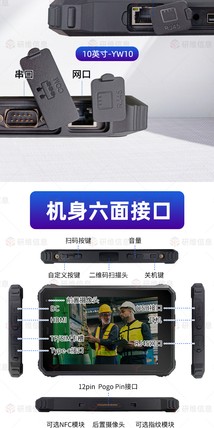 4:额外付费定制硬件项目包含:扫描头、低频/高频/超高频RFID、航插接口、二代证识别、CAN接口、433lora模块、航插接口、zigbee、客供模块内置等;如您有定制需求,可联系研维在线客服,详细了解研维10年来为众多工业领域用户定制相关案例展示。