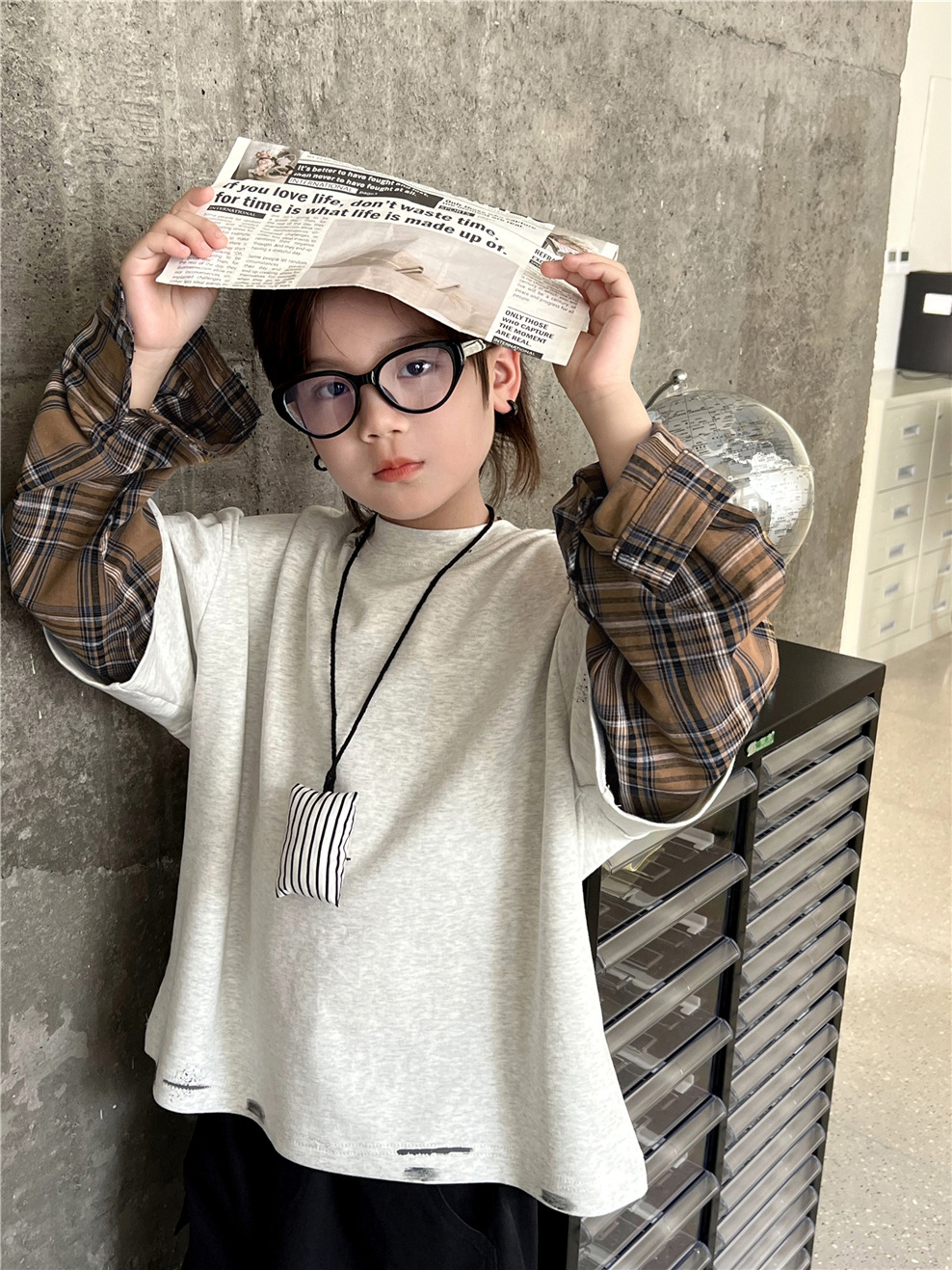 2026년 봄 신상 아동용 투피스 스타일 이너웨어, 체크무늬 소매와 핸드페인팅 래커 장식이 돋보이는 남아 여아용 트렌디 긴팔 상의