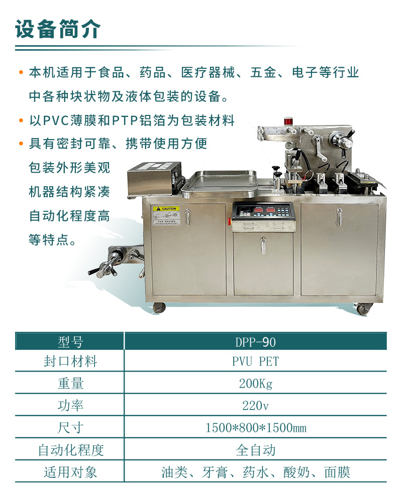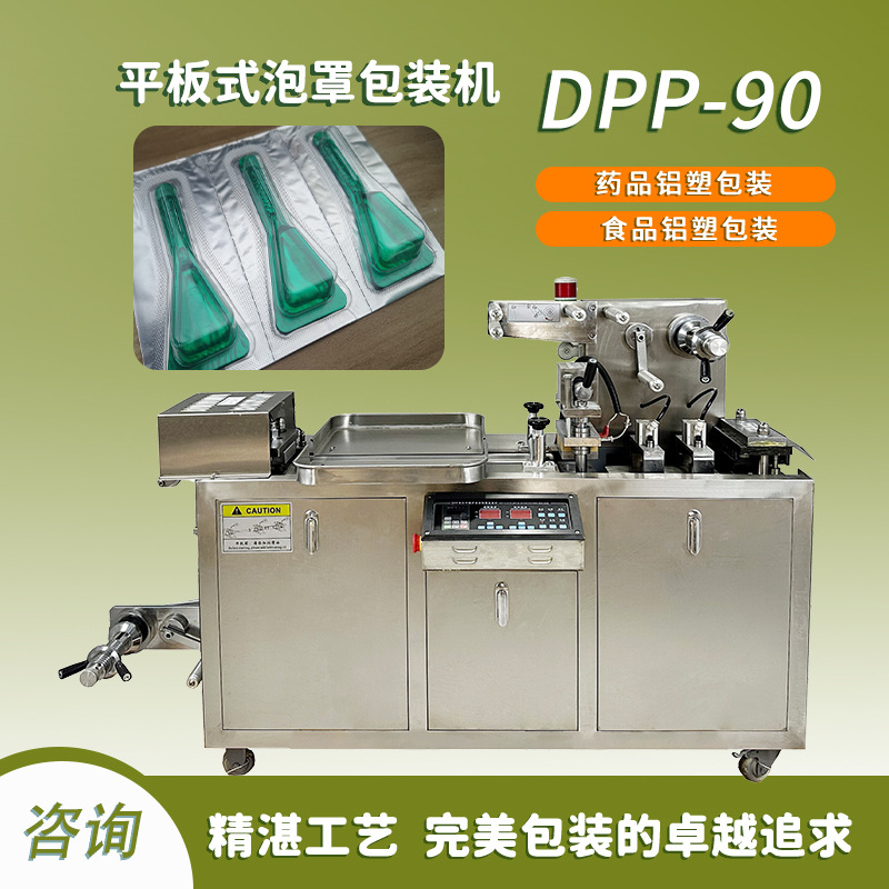 DPP-90型平版式铝塑包装机是我公司对市场充分调研的基础上专为小型制药厂、医院药剂科、药厂研究所设计的新型包装设备,该机性能稳定、结构紧凑、造型美观、自动化程度高,适用于制药、医疗器械、食品、电子、小五金等行业的各种规格胶囊、片剂、安瓿以及医疗器具、轻工食品、糖果、电子元器件、小五金产品的泡罩式密封包装。