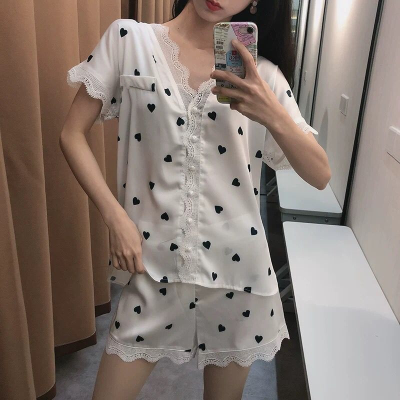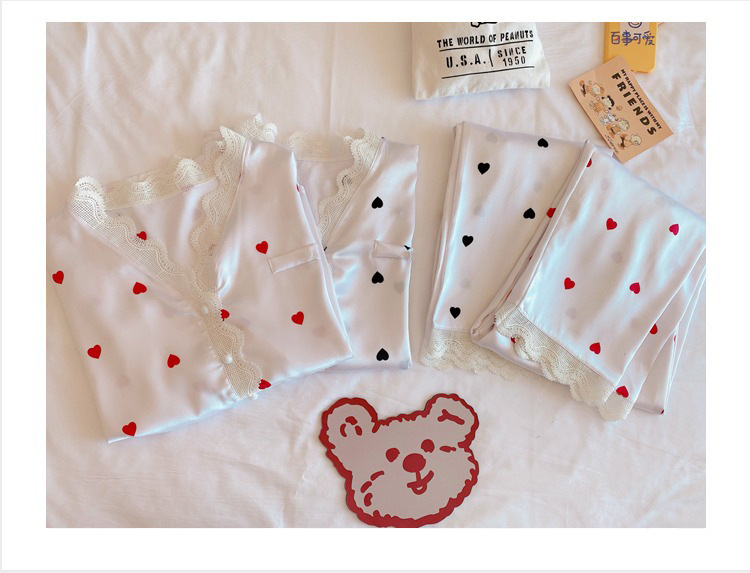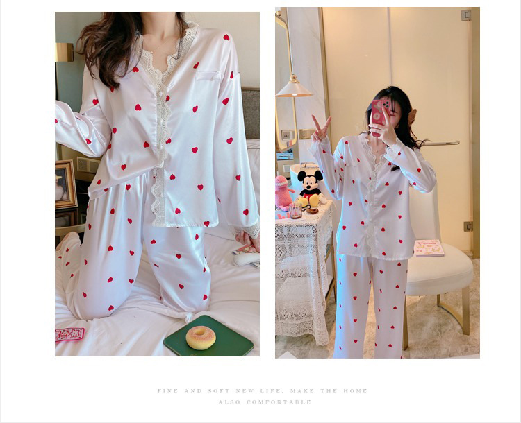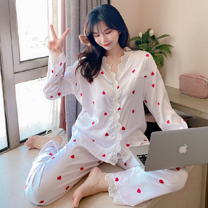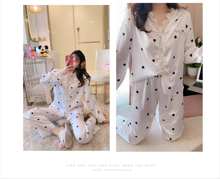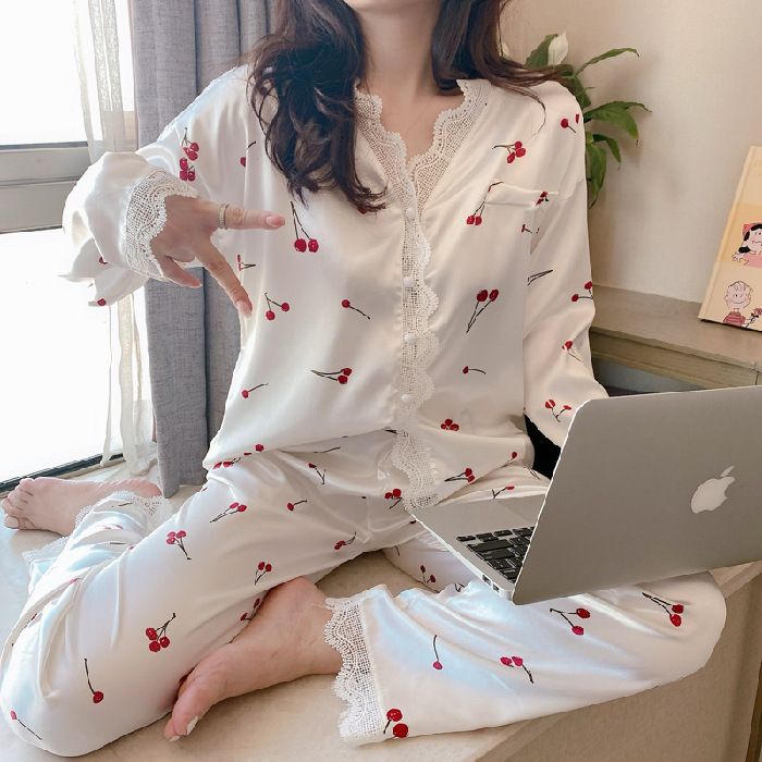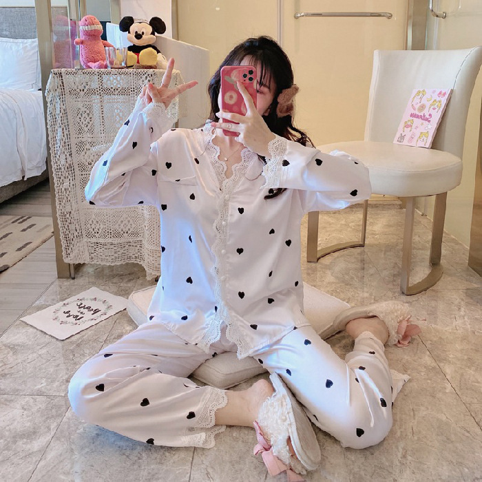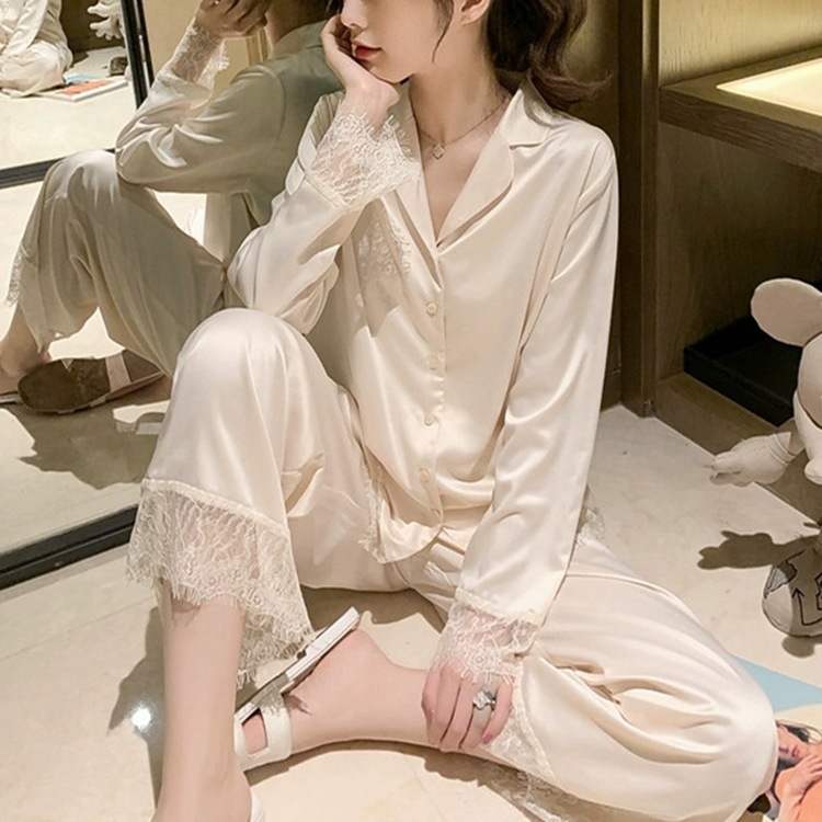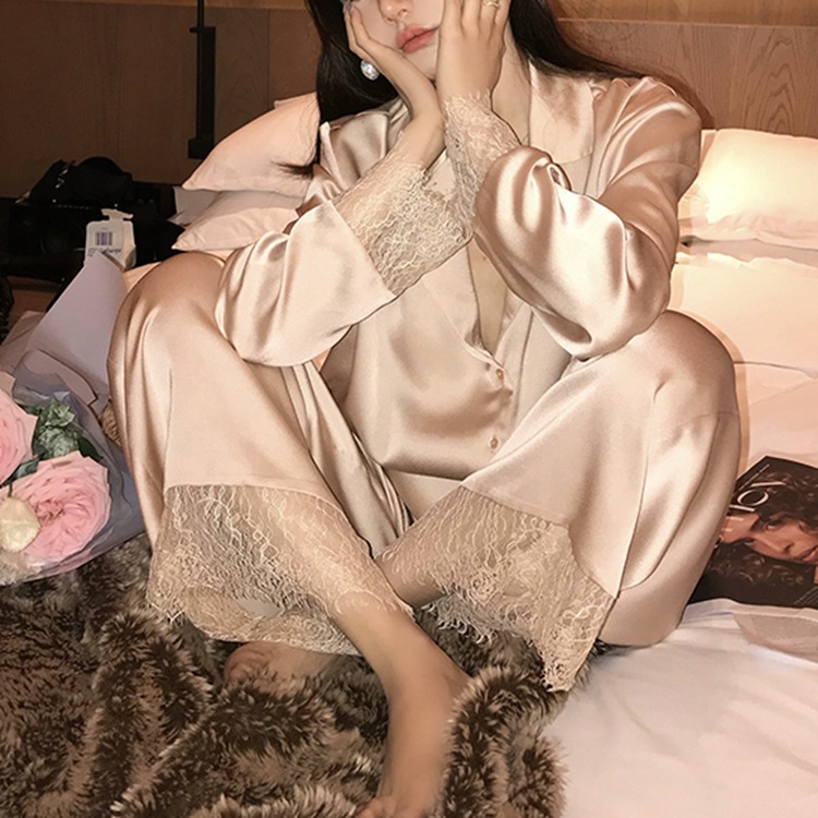 공주 스타일 간단한 단색 실크 파자마 여성의 가을 레이스 레이스 귀여운 소녀의 느슨한 크로스 국경 홈 옷