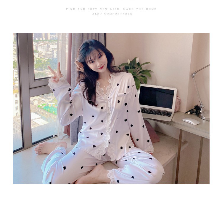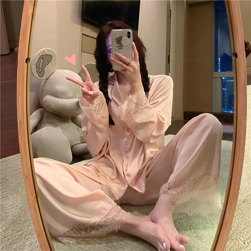 공주 스타일 간단한 단색 실크 파자마 여성의 가을 레이스 레이스 귀여운 소녀의 느슨한 크로스 국경 홈 옷스토어 가기