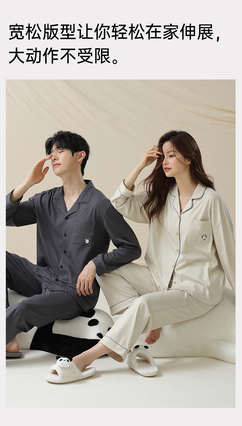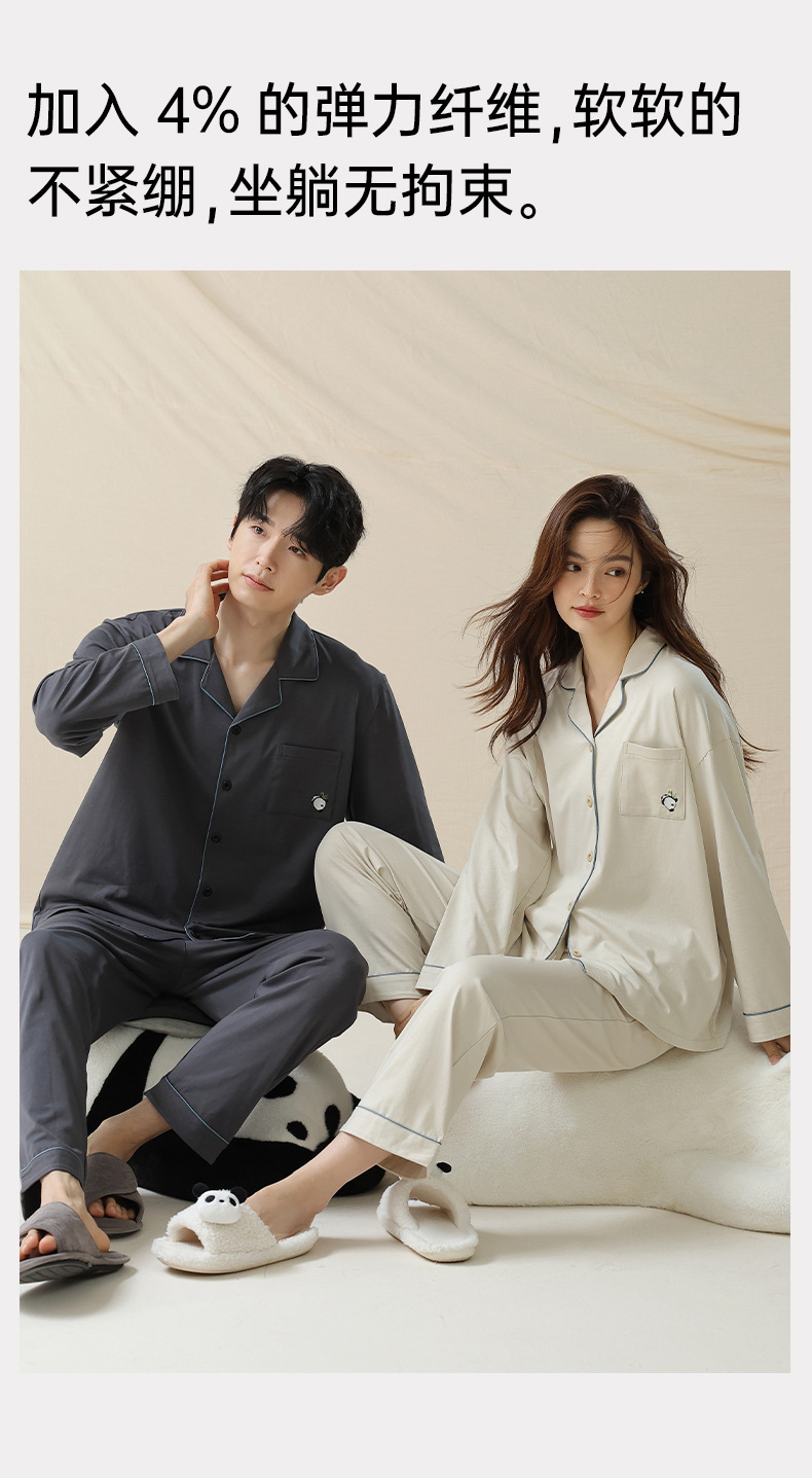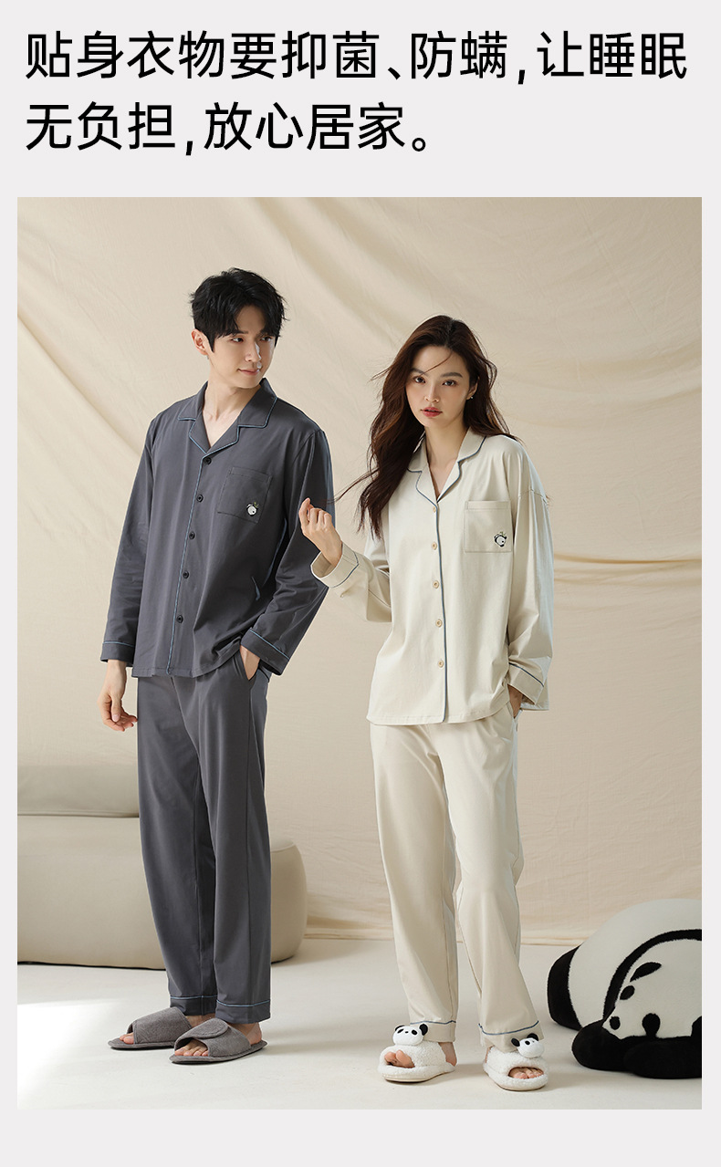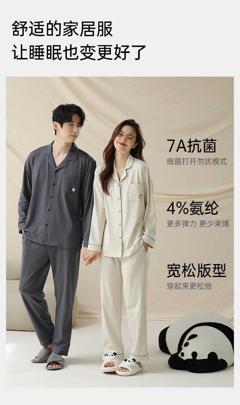 【A类抗菌】春秋季情侣家居服条纹熊猫纯棉女士睡衣翻领男士套装