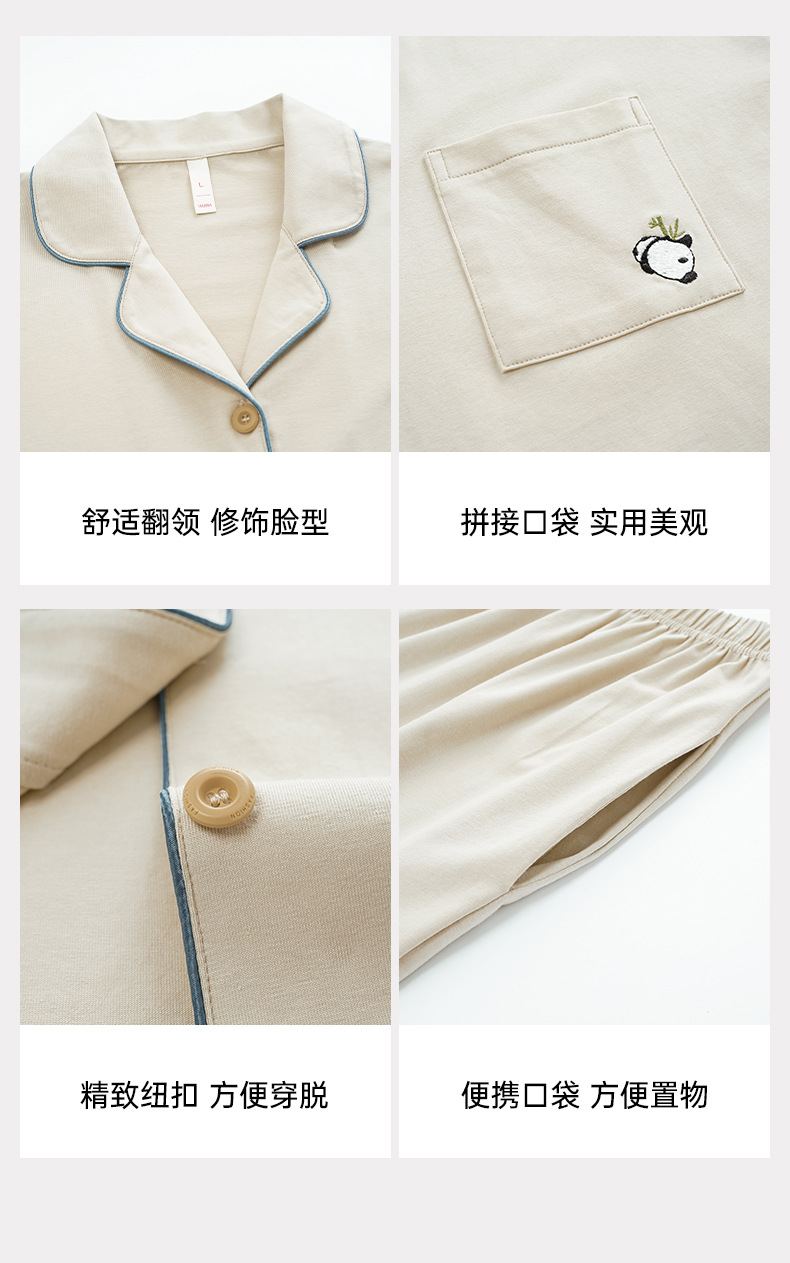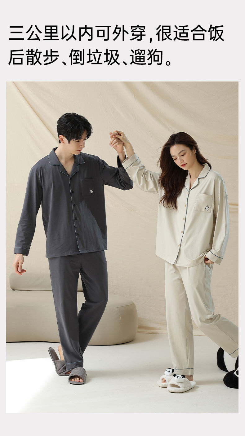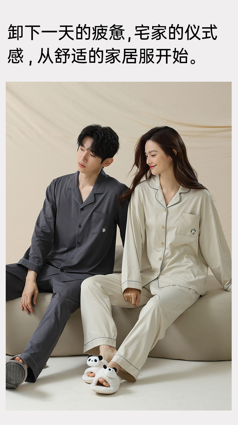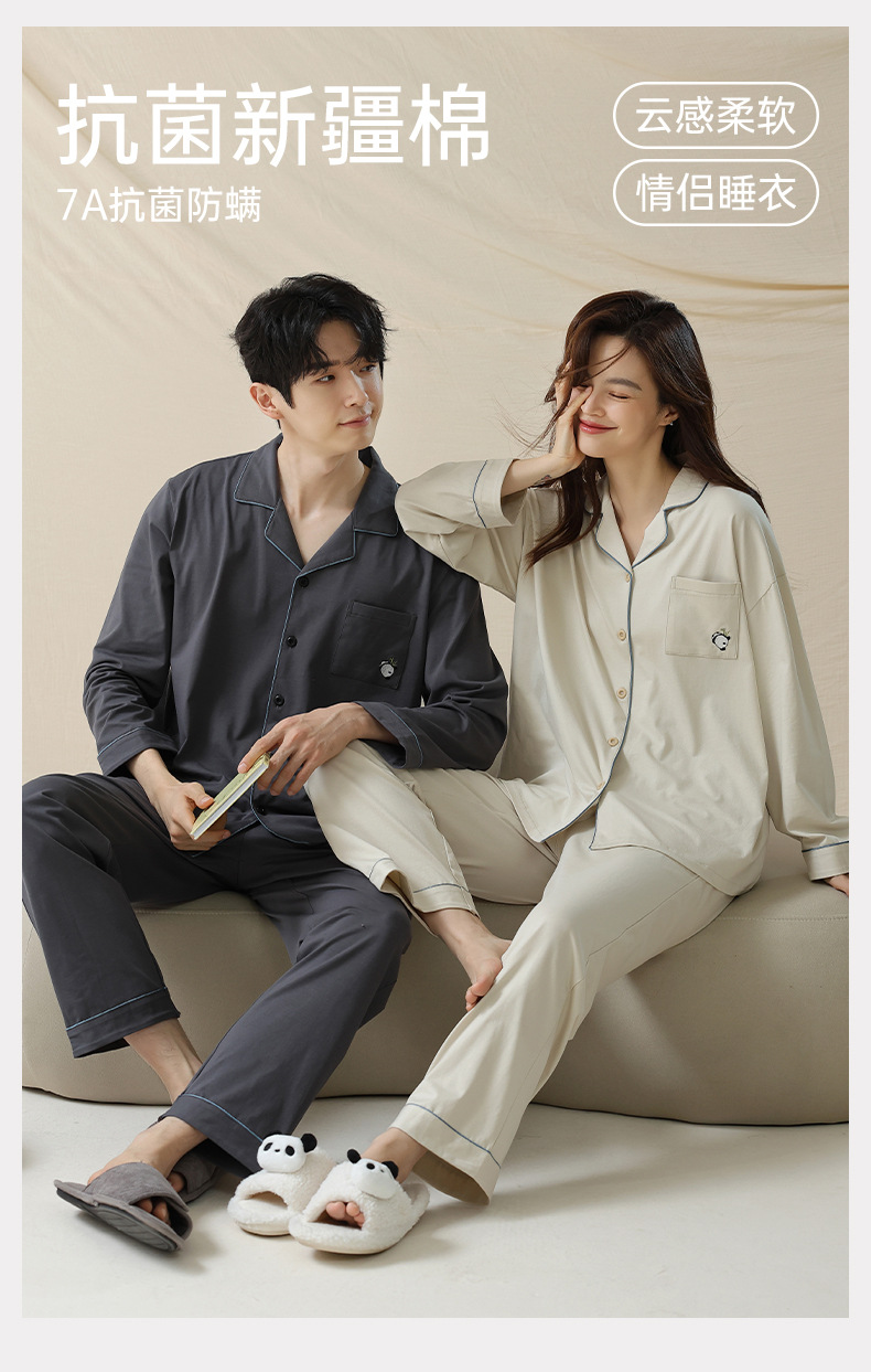 【A类抗菌】春秋季情侣家居服条纹熊猫纯棉女士睡衣翻领男士套装