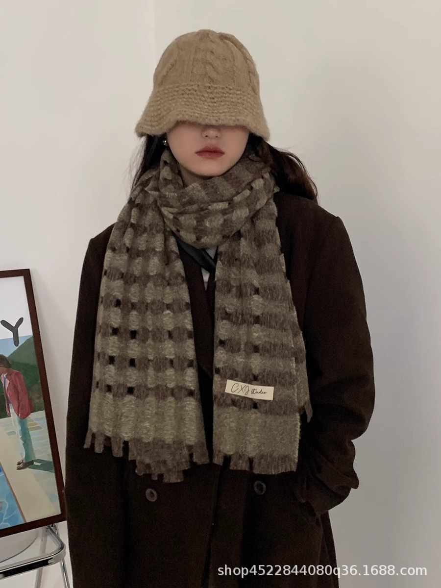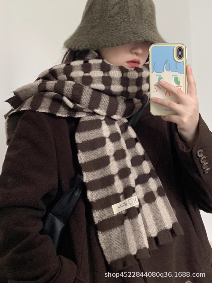 니치 두꺼운 격자 무늬 스카프 여자 2024 년 겨울 새 한국식 올매치 학생의 목도리 이중 목적 따뜻한 목