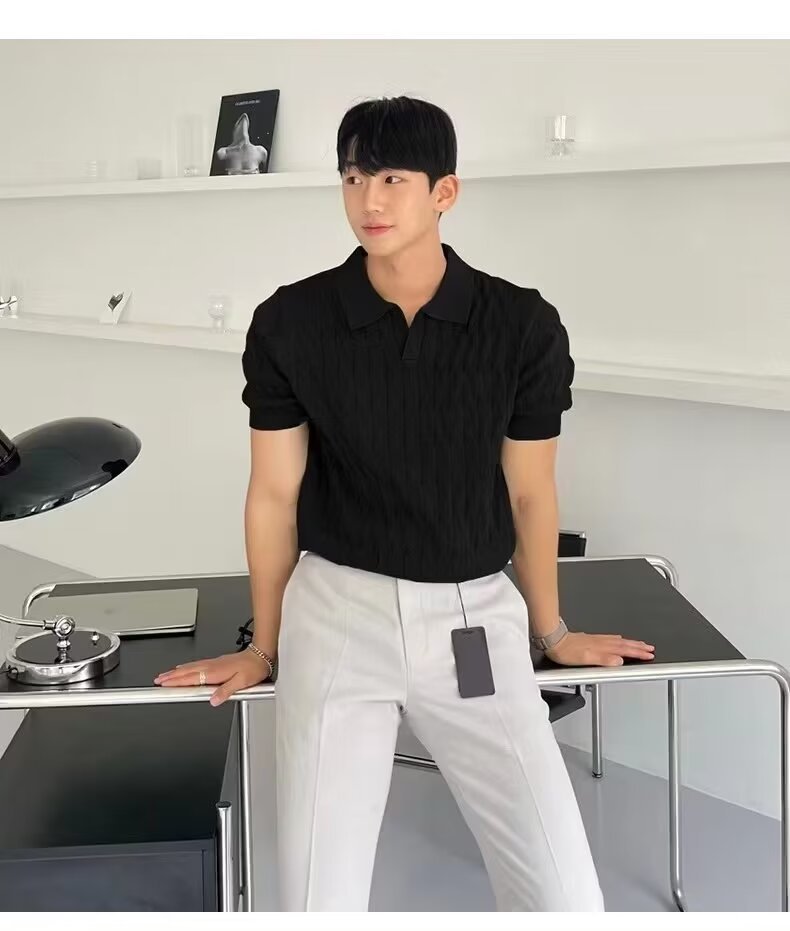 여름 빛 성숙한 폴로 스기야마 남자 한국 스타일 슬림 핏 옷깃 단색 캐주얼 얇은 반소매 유행 니트 탑 티셔츠스토어 가기