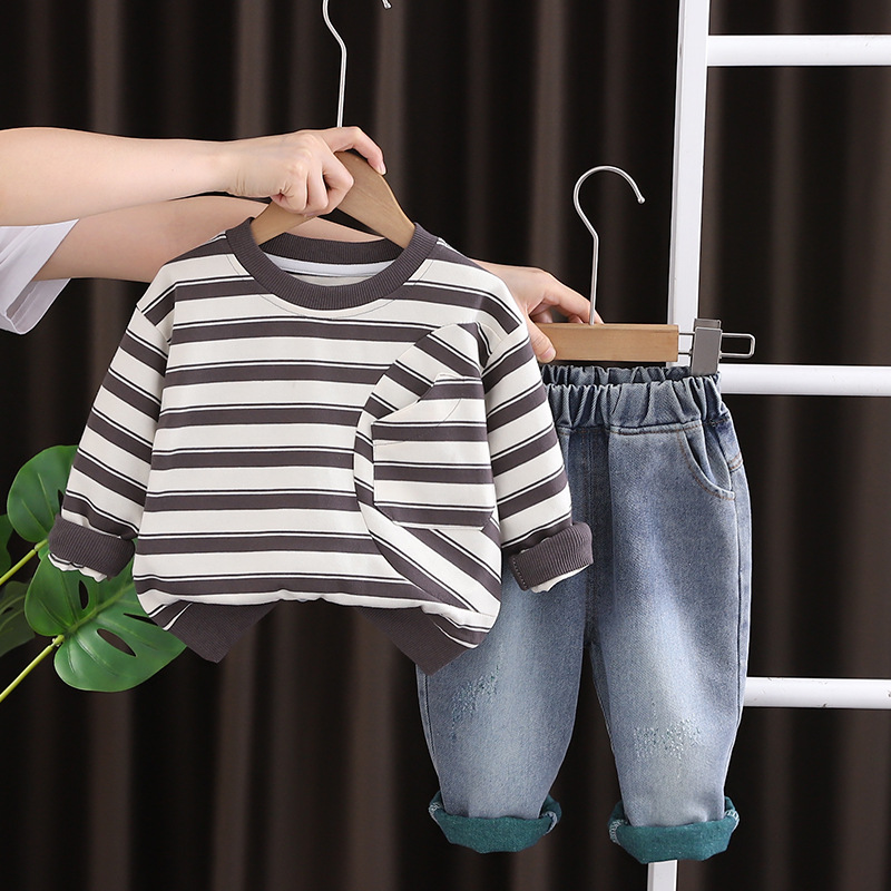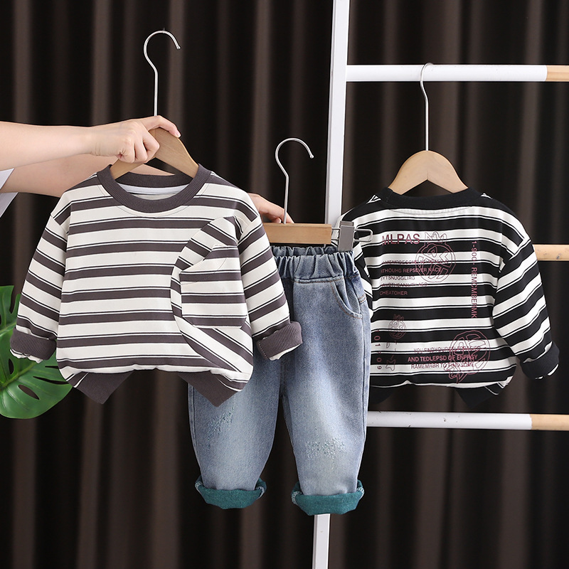 어린이 착용 한국 어린이 줄무늬 가을 세트 2024 새로운 여성 아기 외국인 스타일 소년 1-3 세 5 세트 국경스토어 가기