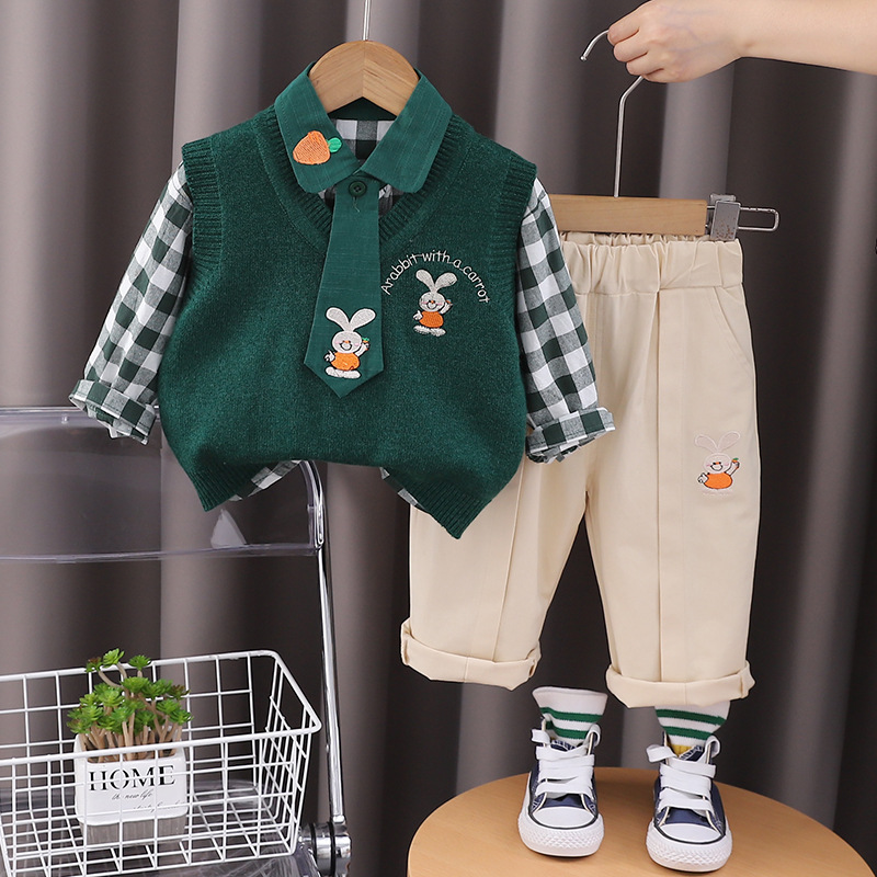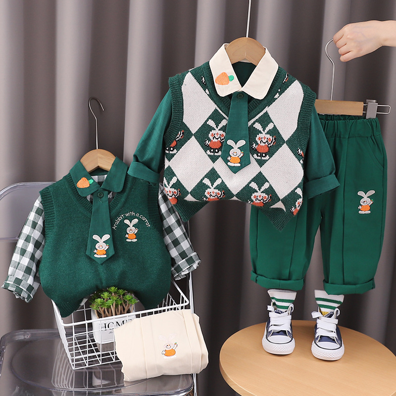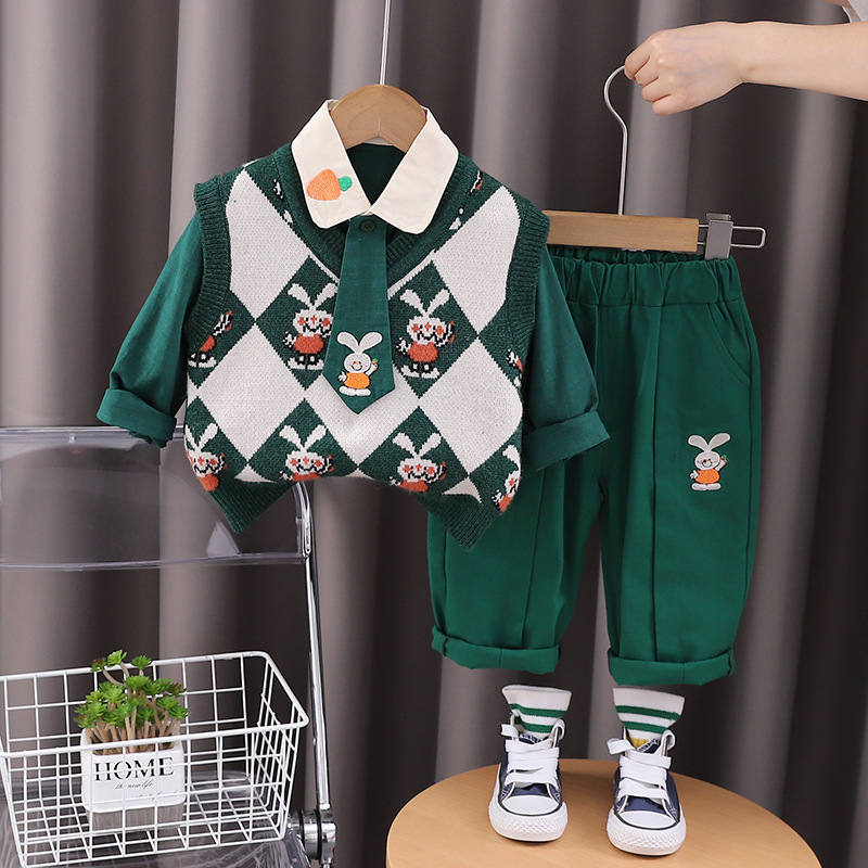 소년의 가을 세트 2024 새로운 아기 서양식 어린이 봄과 가을 캐주얼 스웨터 조끼 3 조각 유행 머리스토어 가기