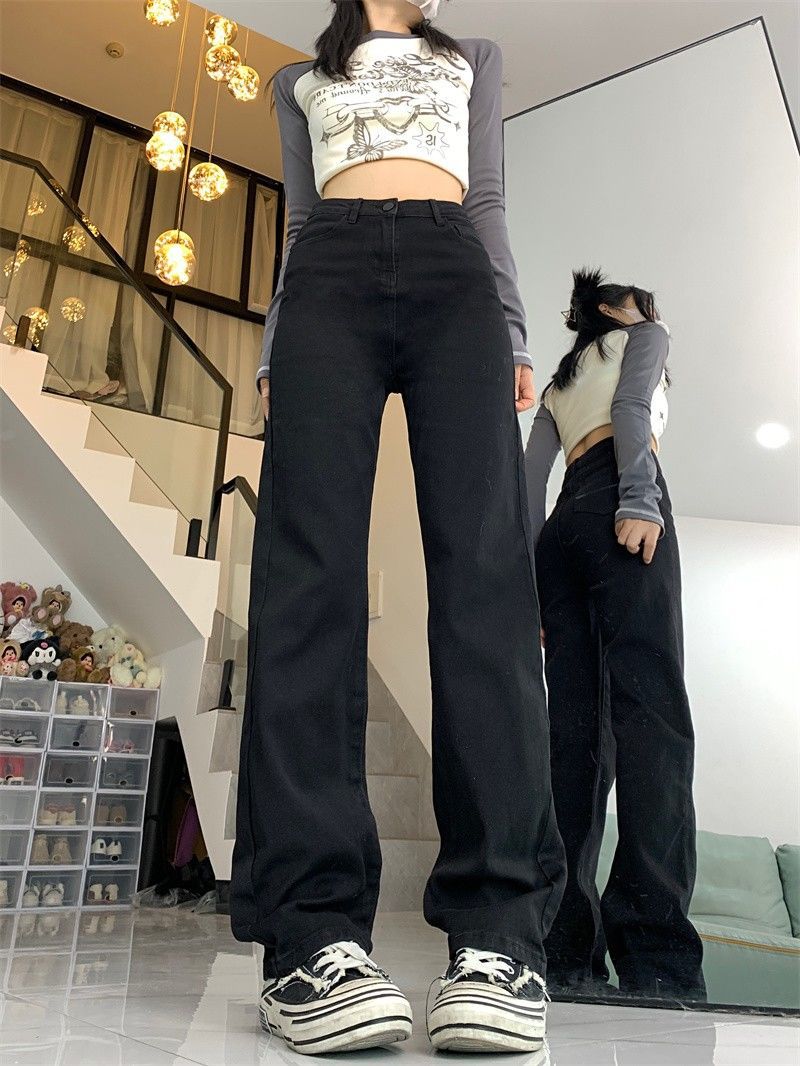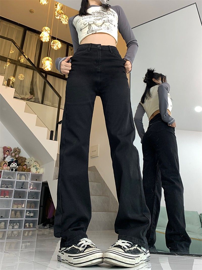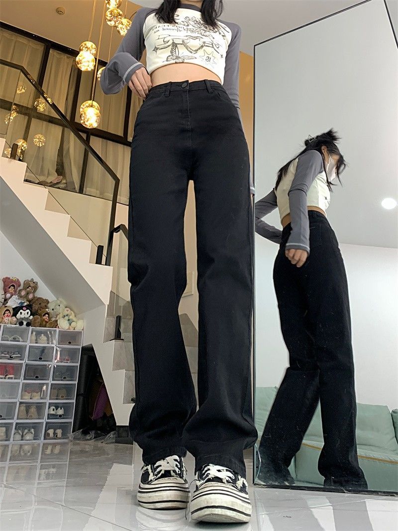 검은 직선 다리 청바지 여성의 얇은 작은 높은 허리 느슨한 슬리밍 좁은 넓은 다리 바지 봄과 여름스토어 가기