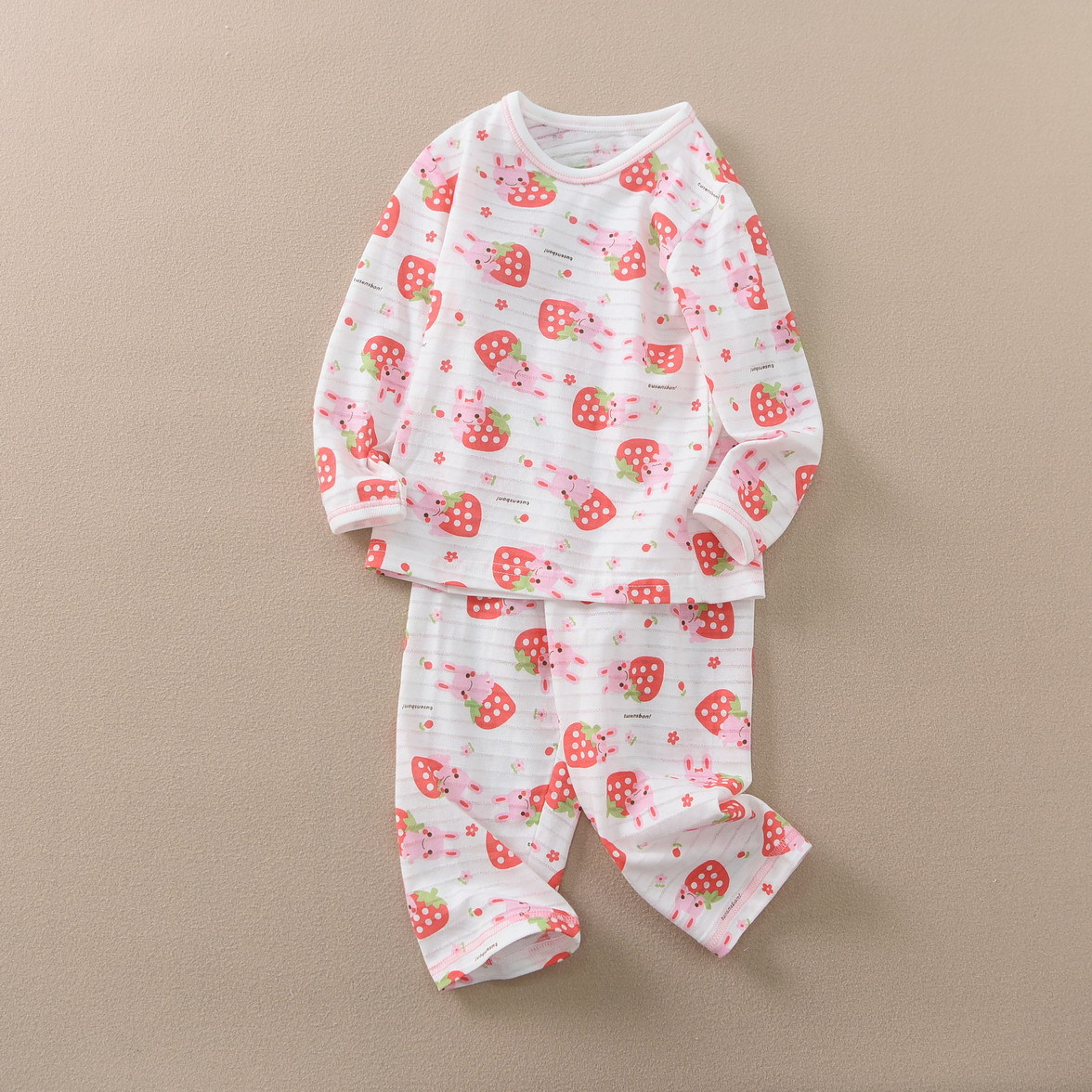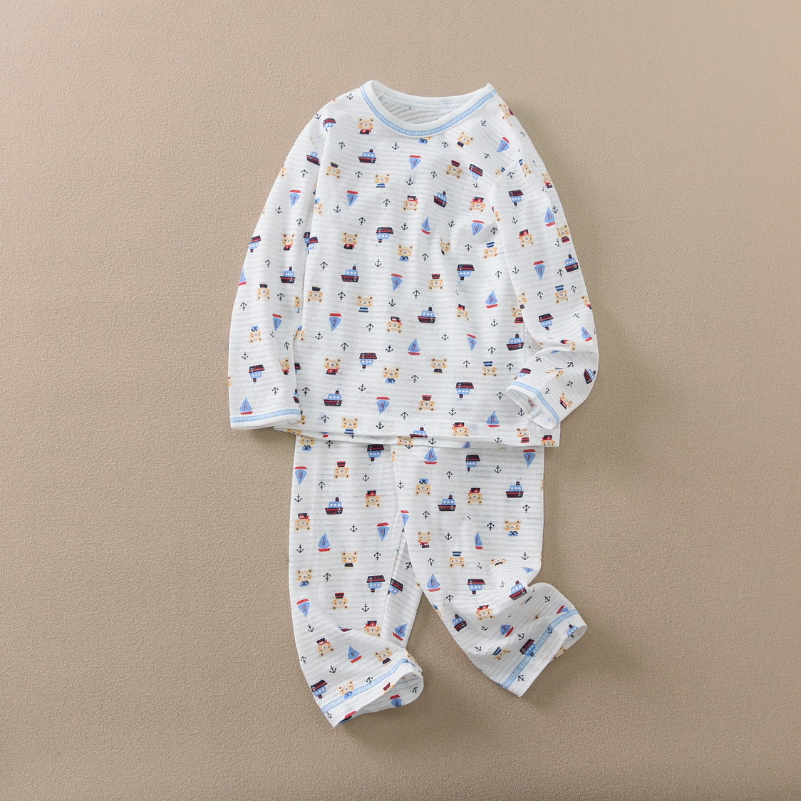 采用新疆长绒精梳棉原料,40支纱线 提花网眼织布 吸汗透气 采用环保水印印花, A类执行标准 可以做家居服空调服 睡衣都是很舒服的,打底都可以哦不易起球不易变形,裤子宽幅弹力腰头不勒宝宝肚子,立体裁剪设计,夜晚安睡。