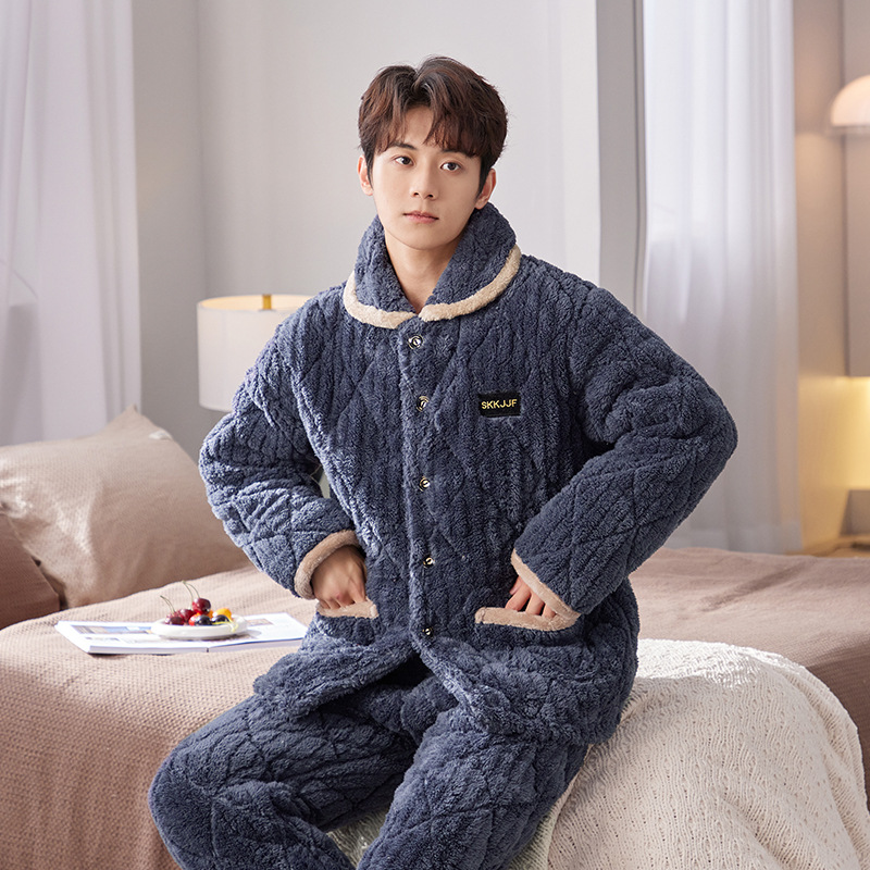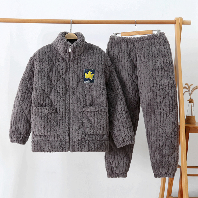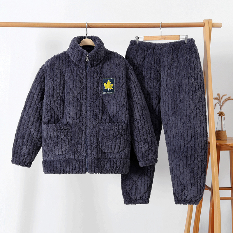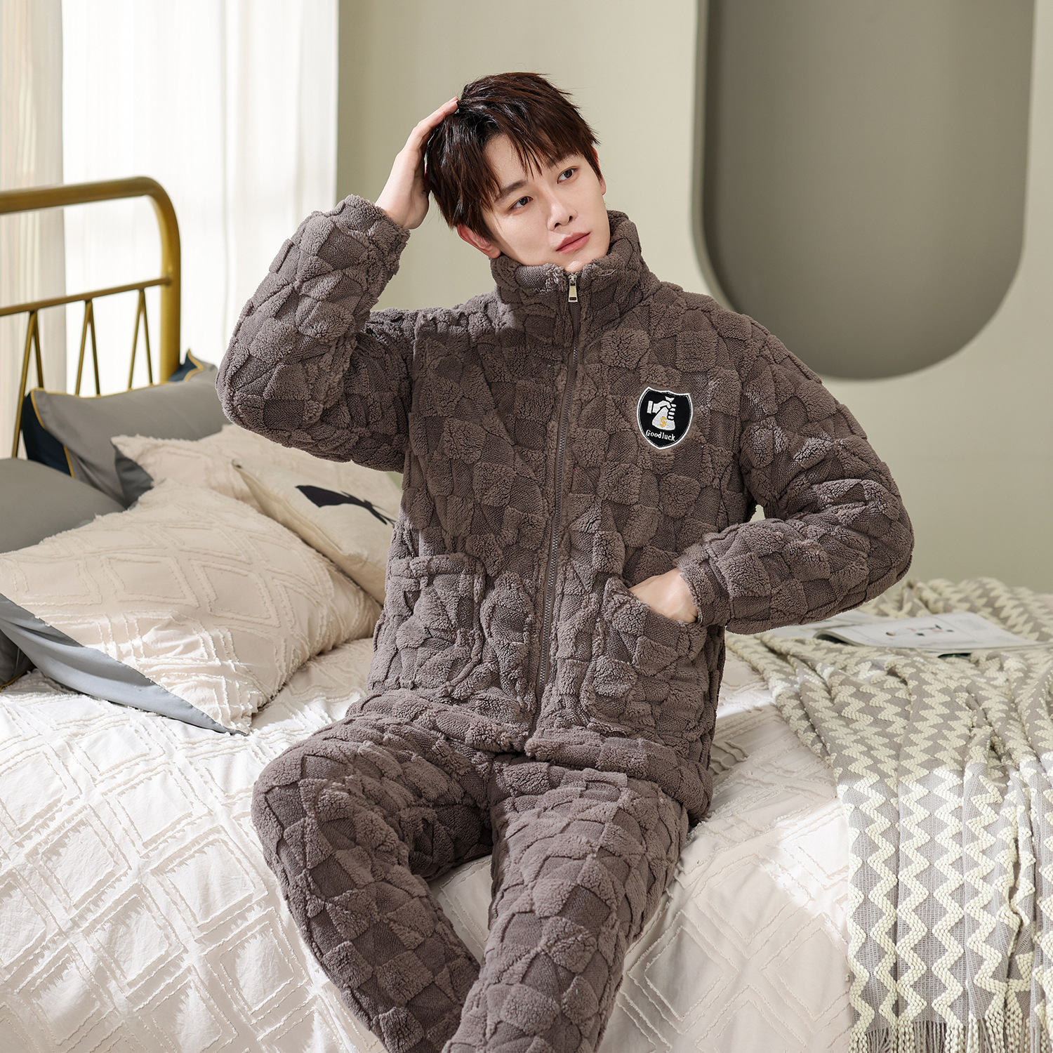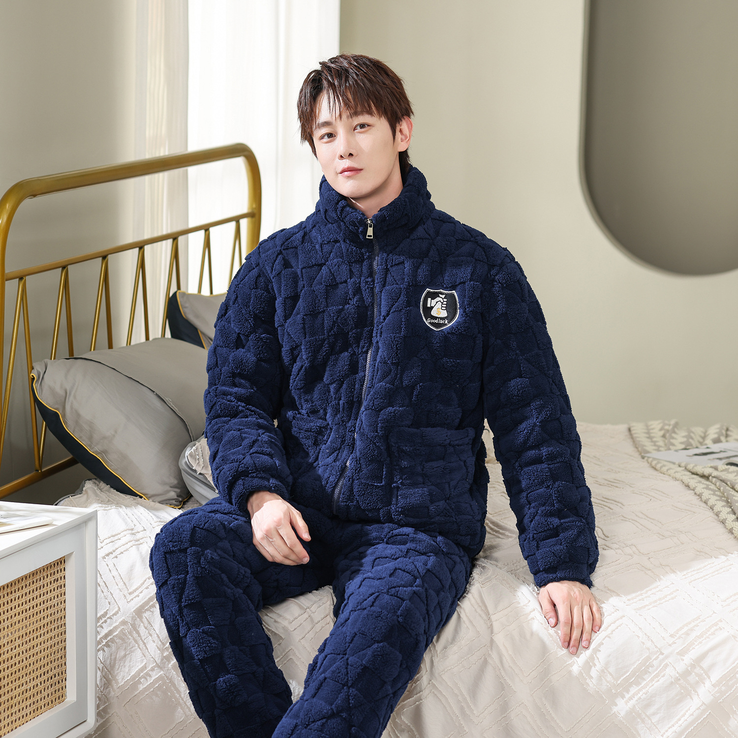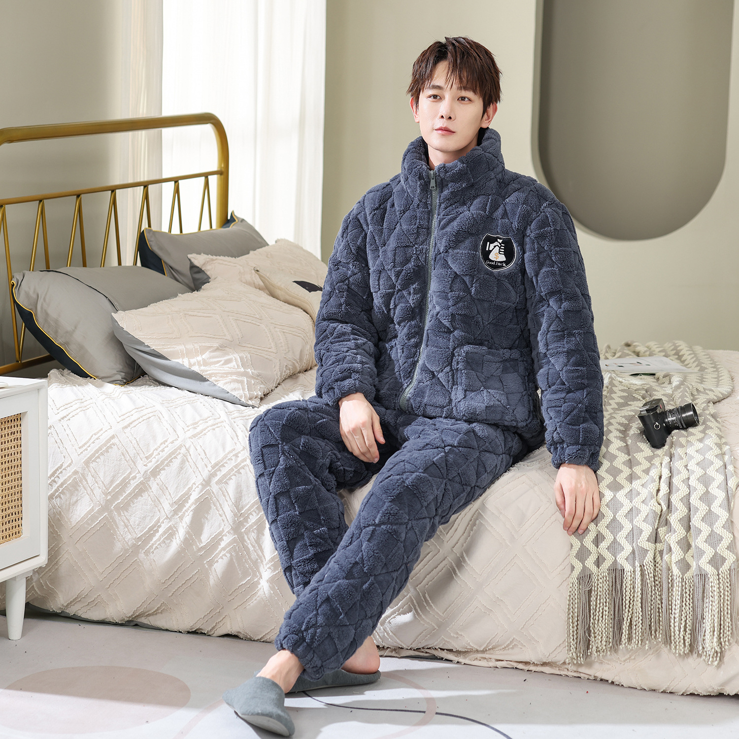 겨울철 남성용 맞춤형 잠옷, 두껍고 따뜻한 지퍼, 3겹 누비 산호 벨벳, 대형 아우터웨어, 홈웨어 세트, 스탠드 칼라스토어 가기