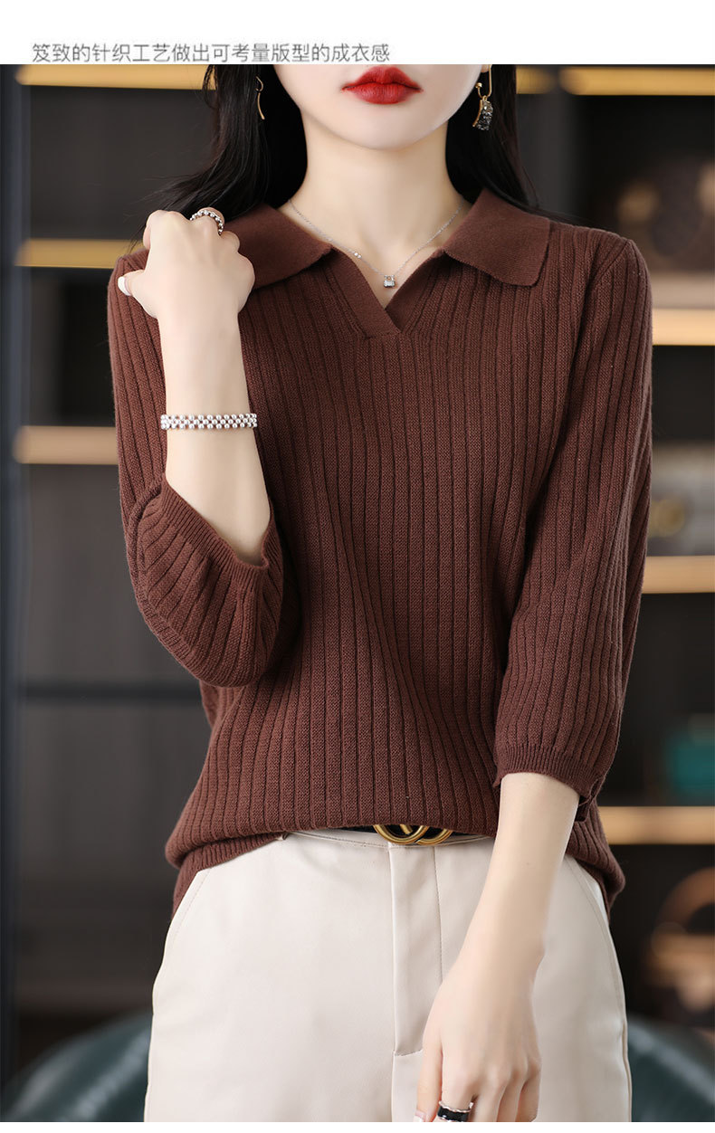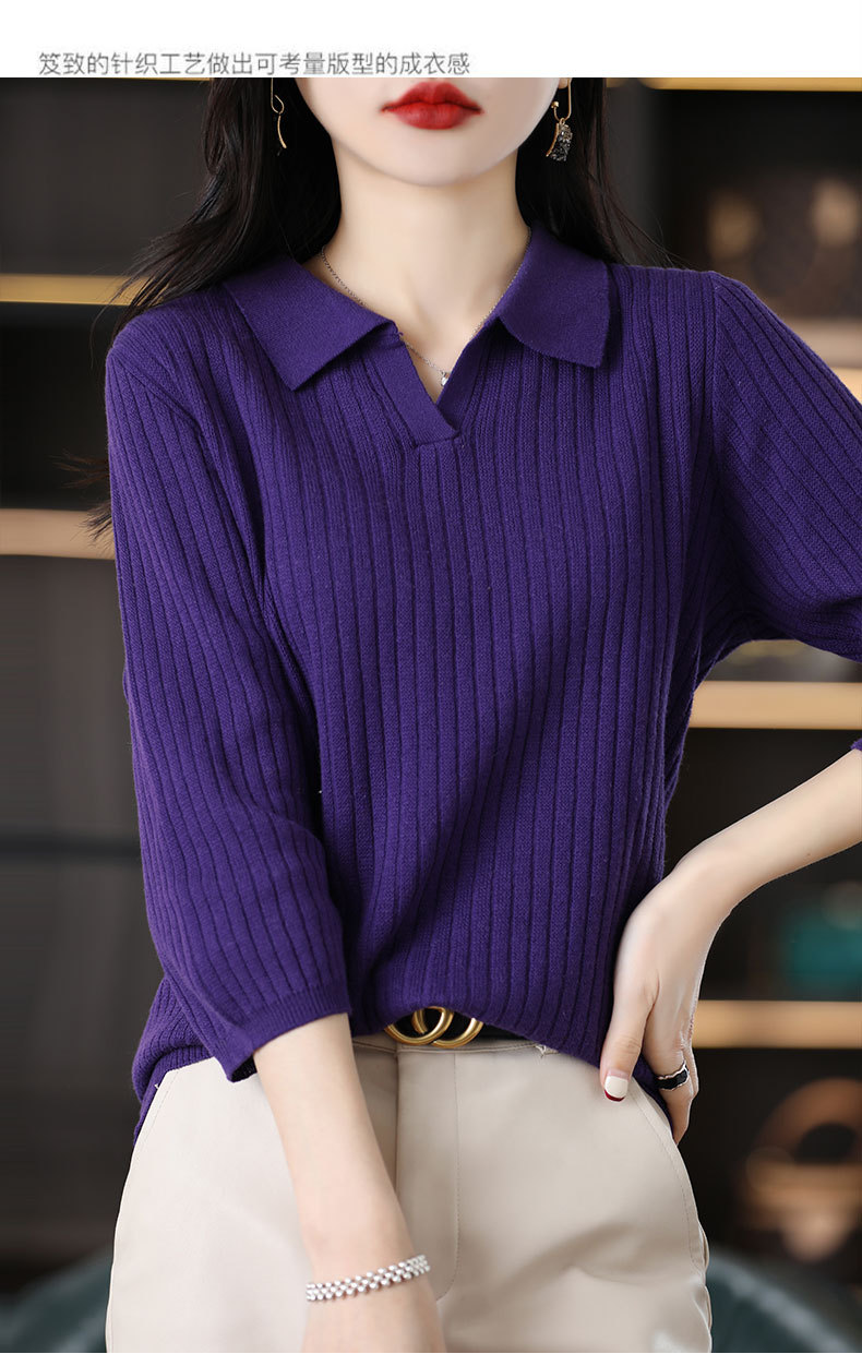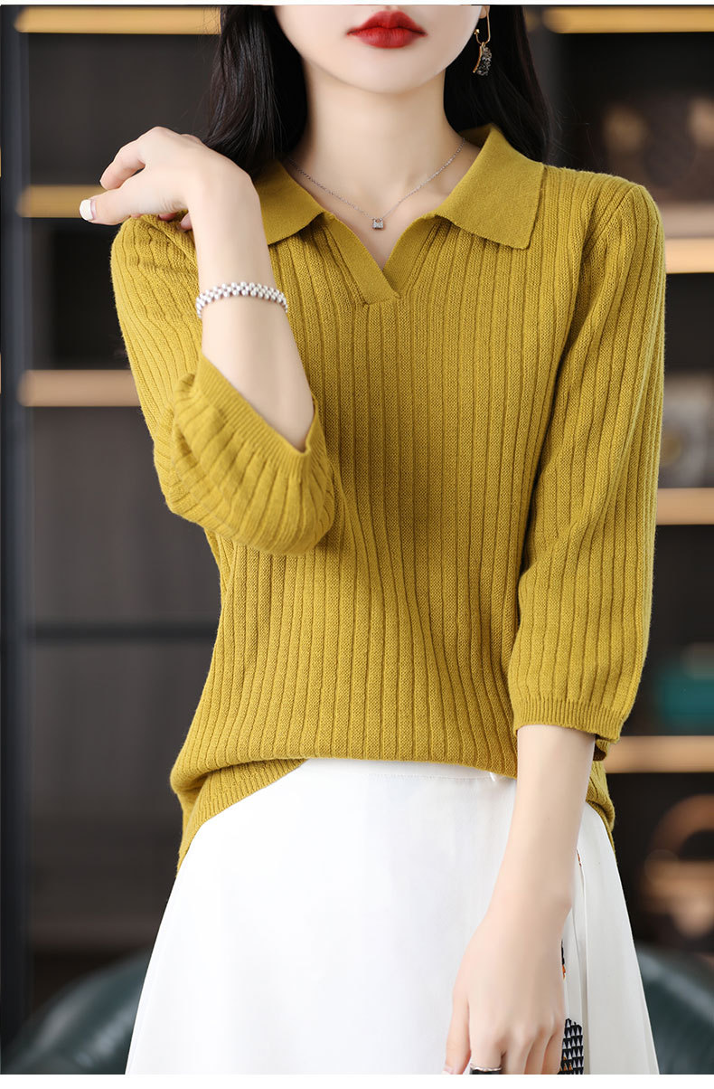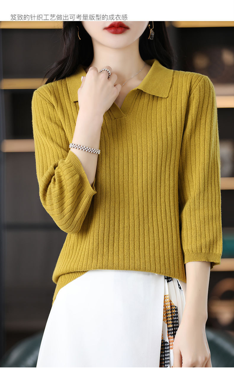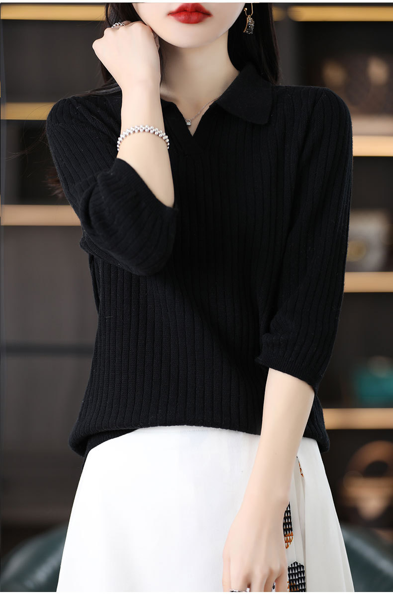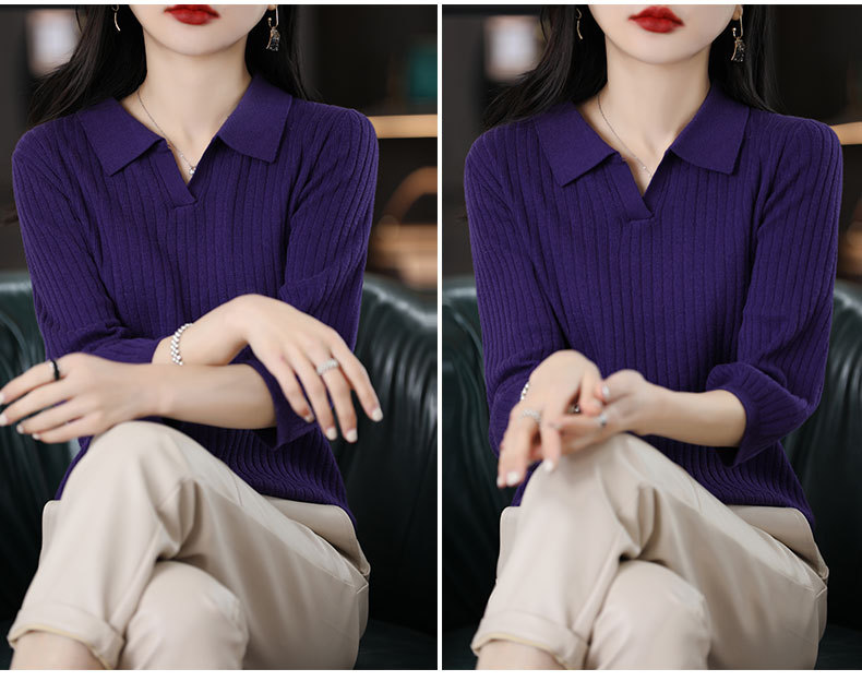 봄과 가을면 POLO 칼라 옷깃 7 소매 니트베이스 셔츠 여성의 느슨한 슬리밍 내부 니트 셔츠