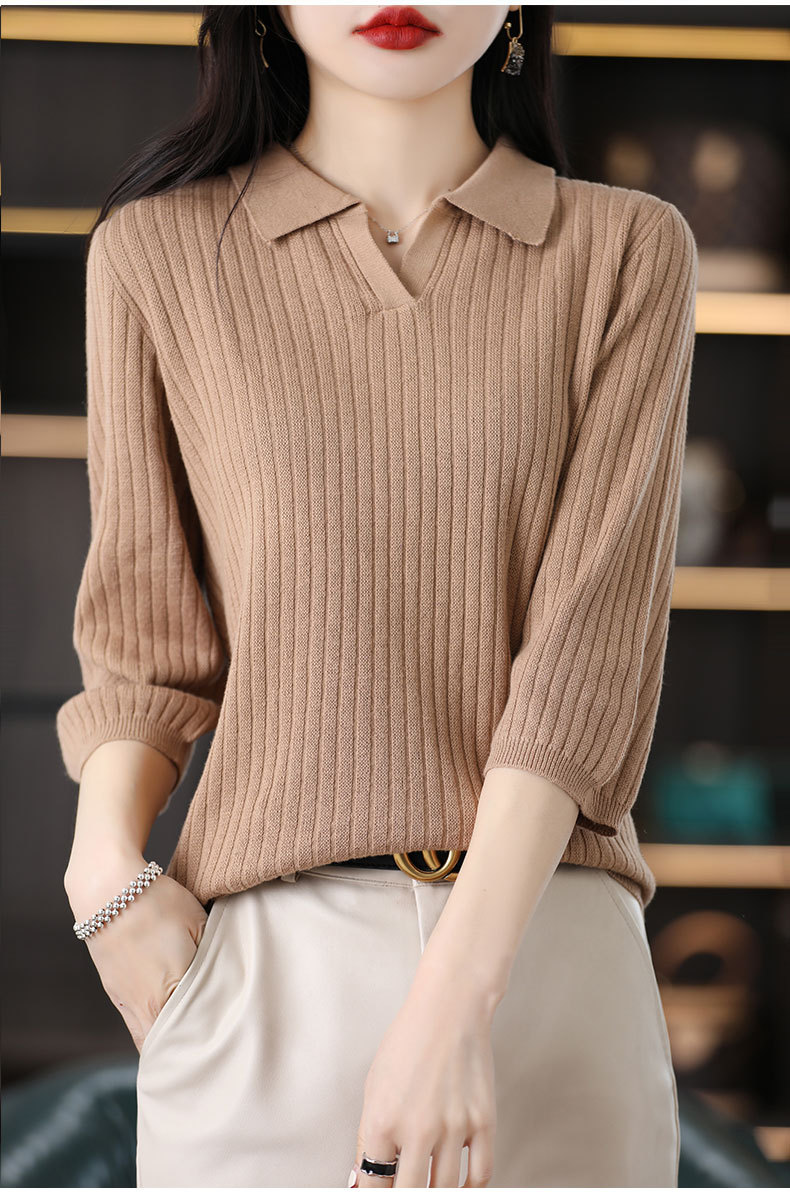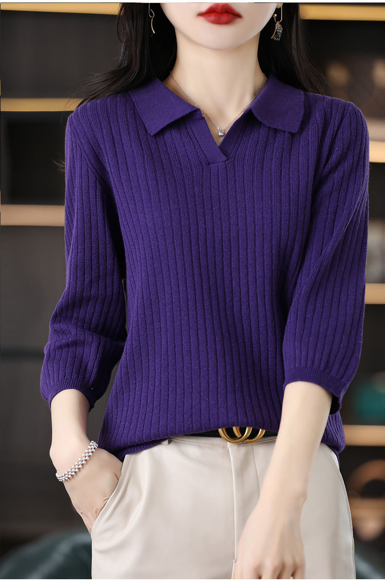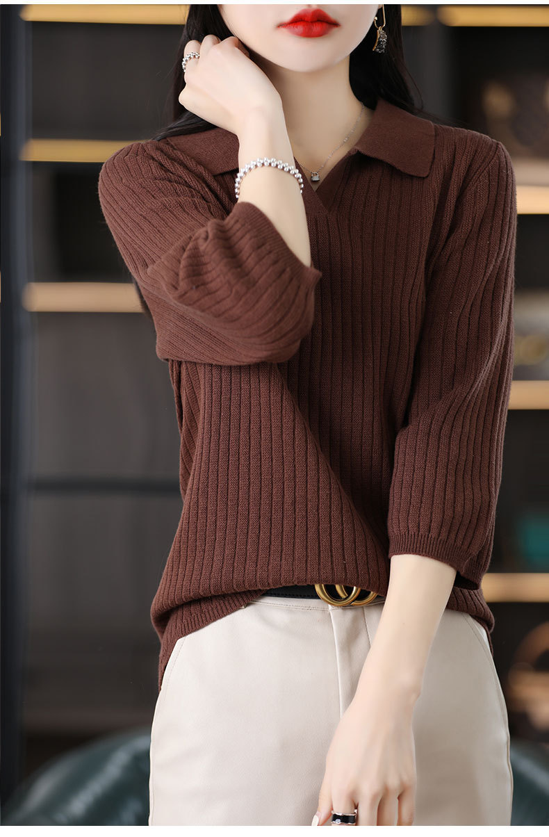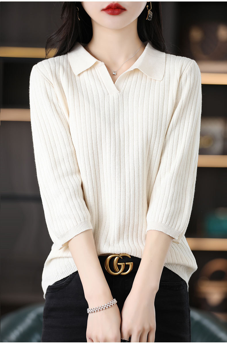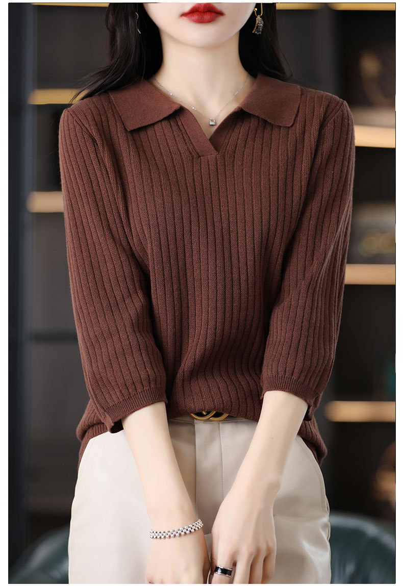 봄과 가을면 POLO 칼라 옷깃 7 소매 니트베이스 셔츠 여성의 느슨한 슬리밍 내부 니트 셔츠