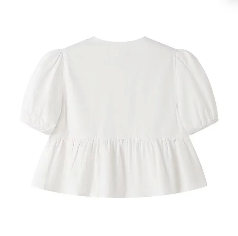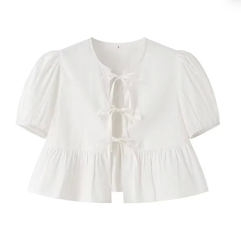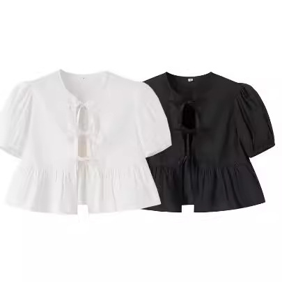 재고 있음 유럽과 미국의 크로스보더 여성 여름 신작 달콤한 캐주얼 스트랩 라운드 넥 퍼프 슬리브 셔츠 탑스토어 가기