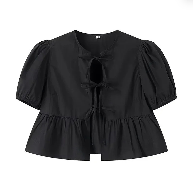 재고 있음 유럽과 미국의 크로스보더 여성 여름 신작 달콤한 캐주얼 스트랩 라운드 넥 퍼프 슬리브 셔츠 탑