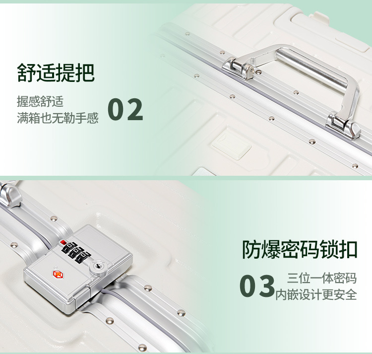 새로운 알루미늄 프레임 수하물 비밀번호 잠금 강화 강력하고 내구성이 뛰어난 대용량 가방 트롤리 케이스 암호 표시기 상자