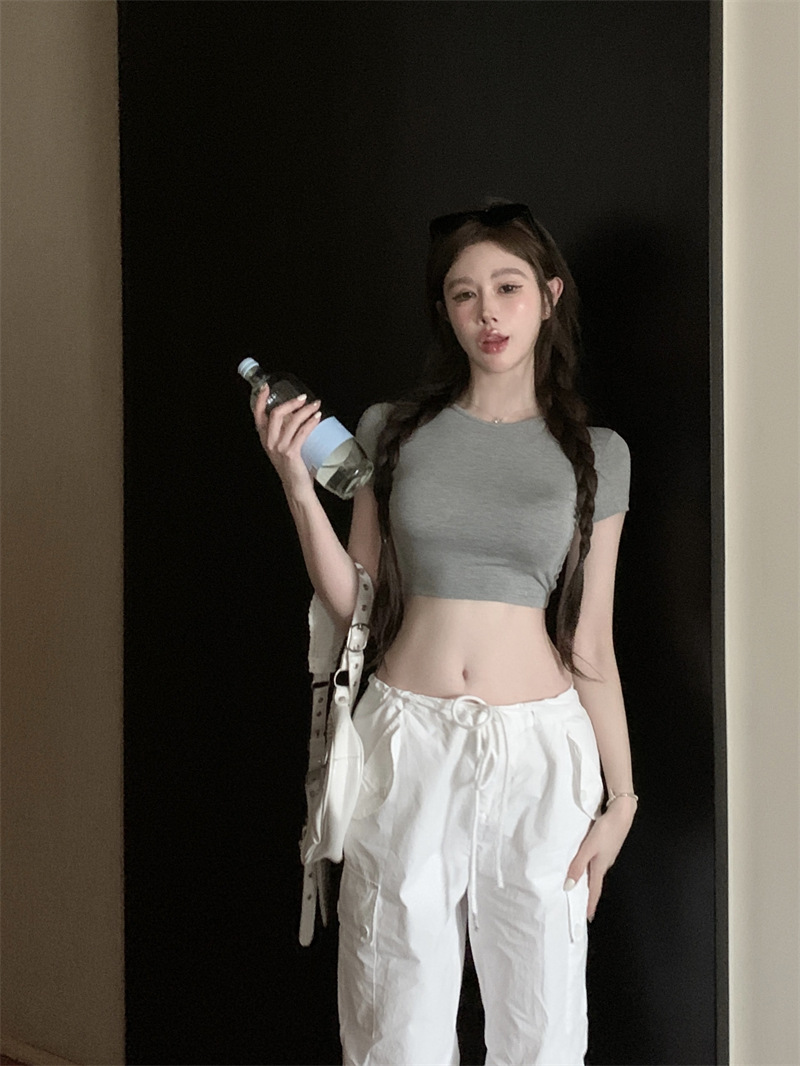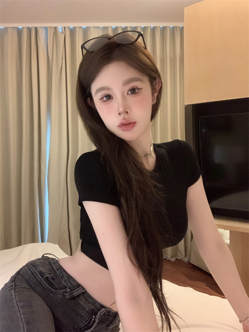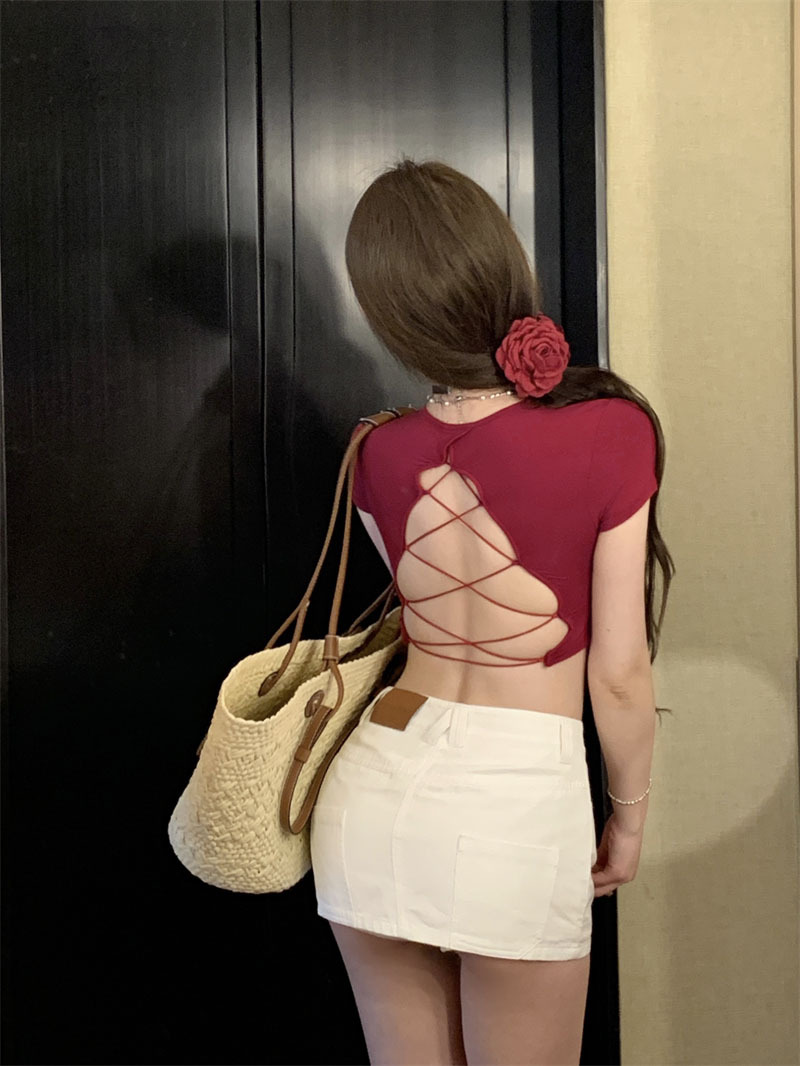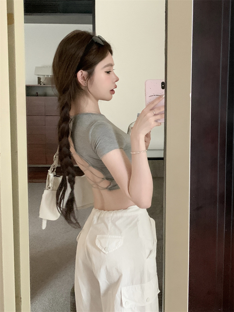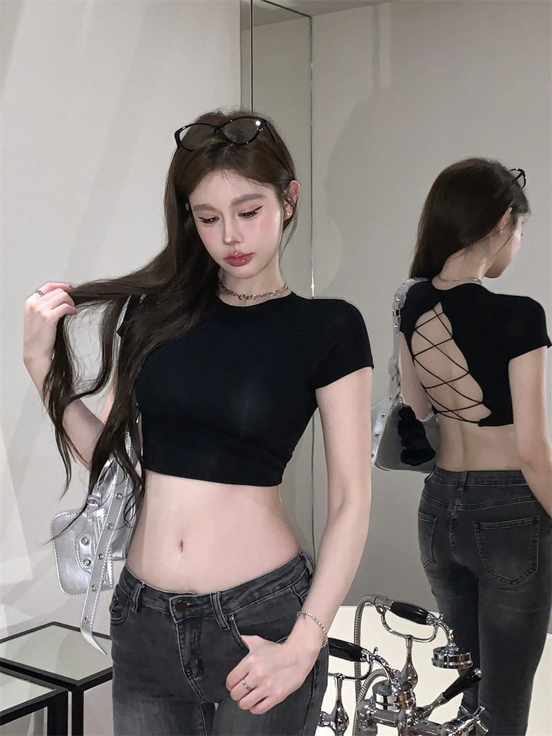 5012 # 레이온 핫 걸스 섹시한 순수한 중공 스트랩 백리스 반팔 티셔츠 슬림 짧은 크롭 탑 여성 패션스토어 가기