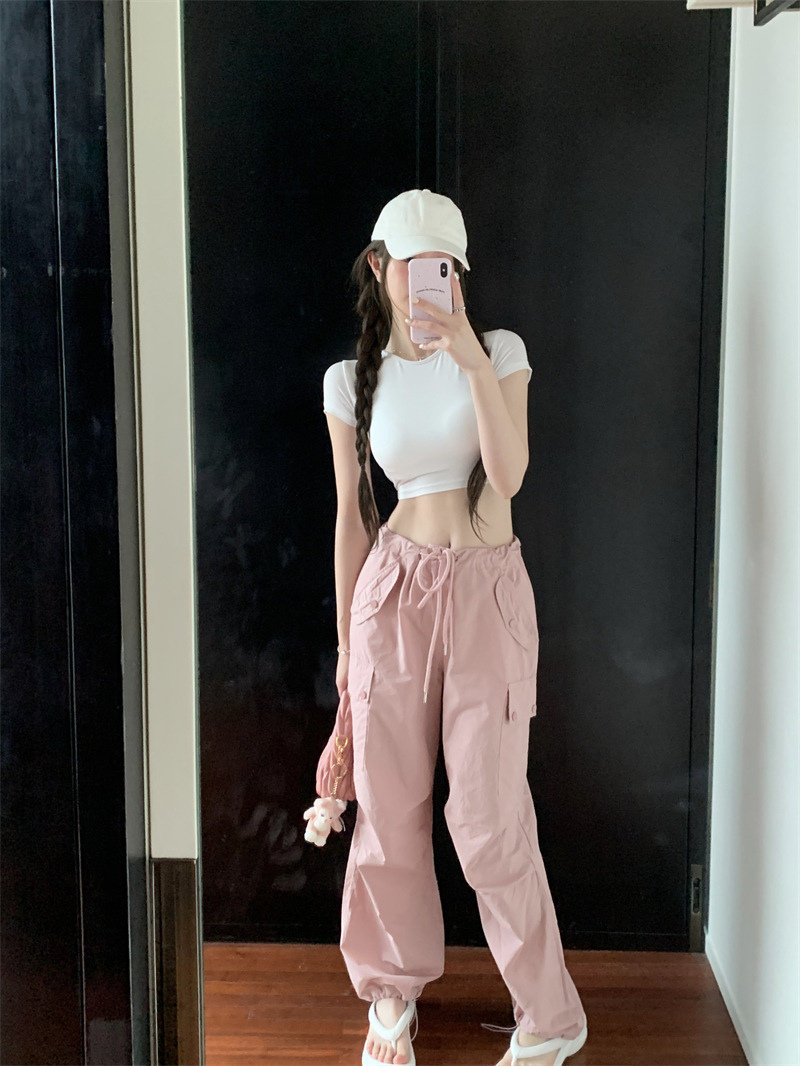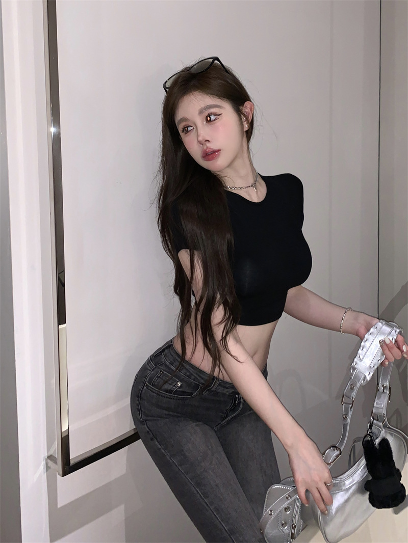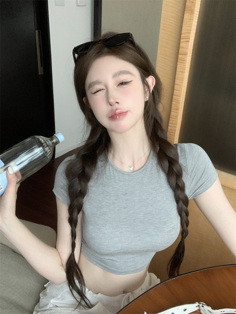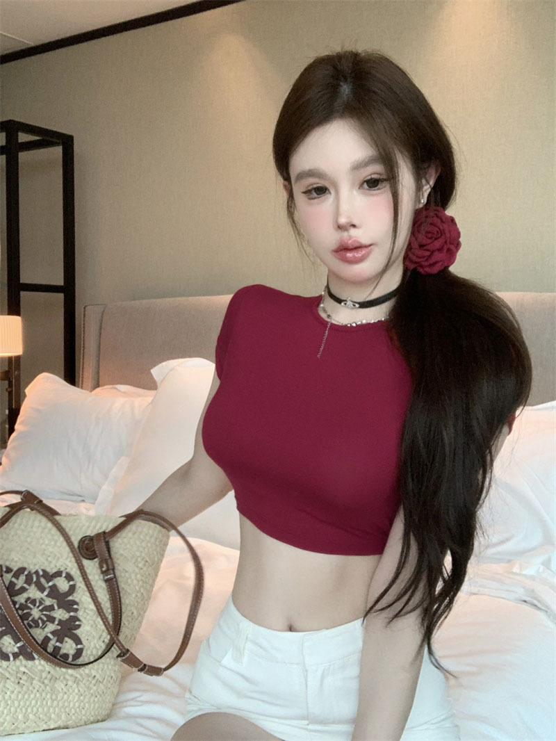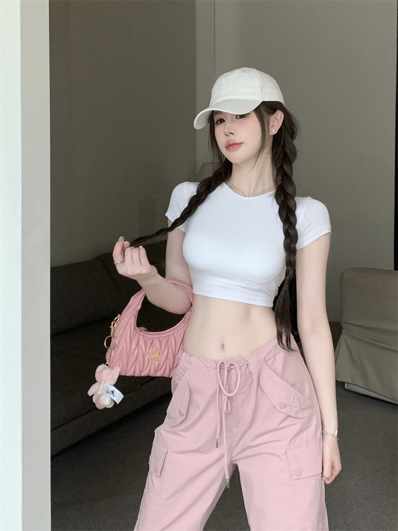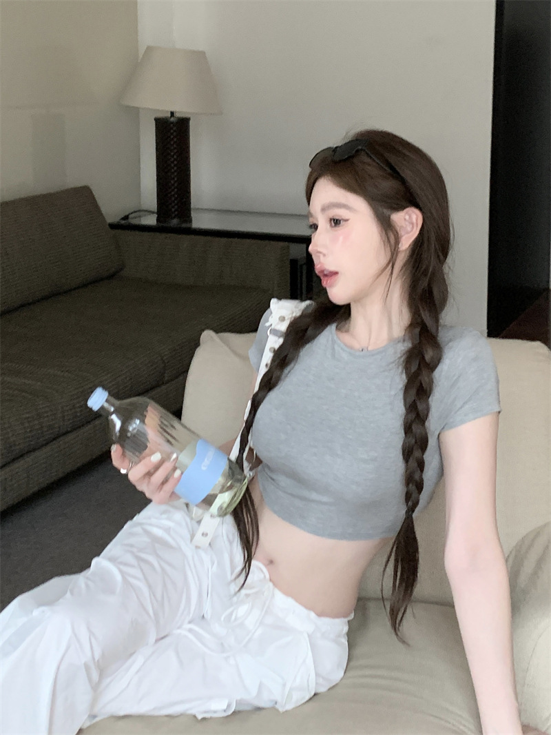 5012 # 레이온 핫 걸스 섹시한 순수한 중공 스트랩 백리스 반팔 티셔츠 슬림 짧은 크롭 탑 여성 패션스토어 가기