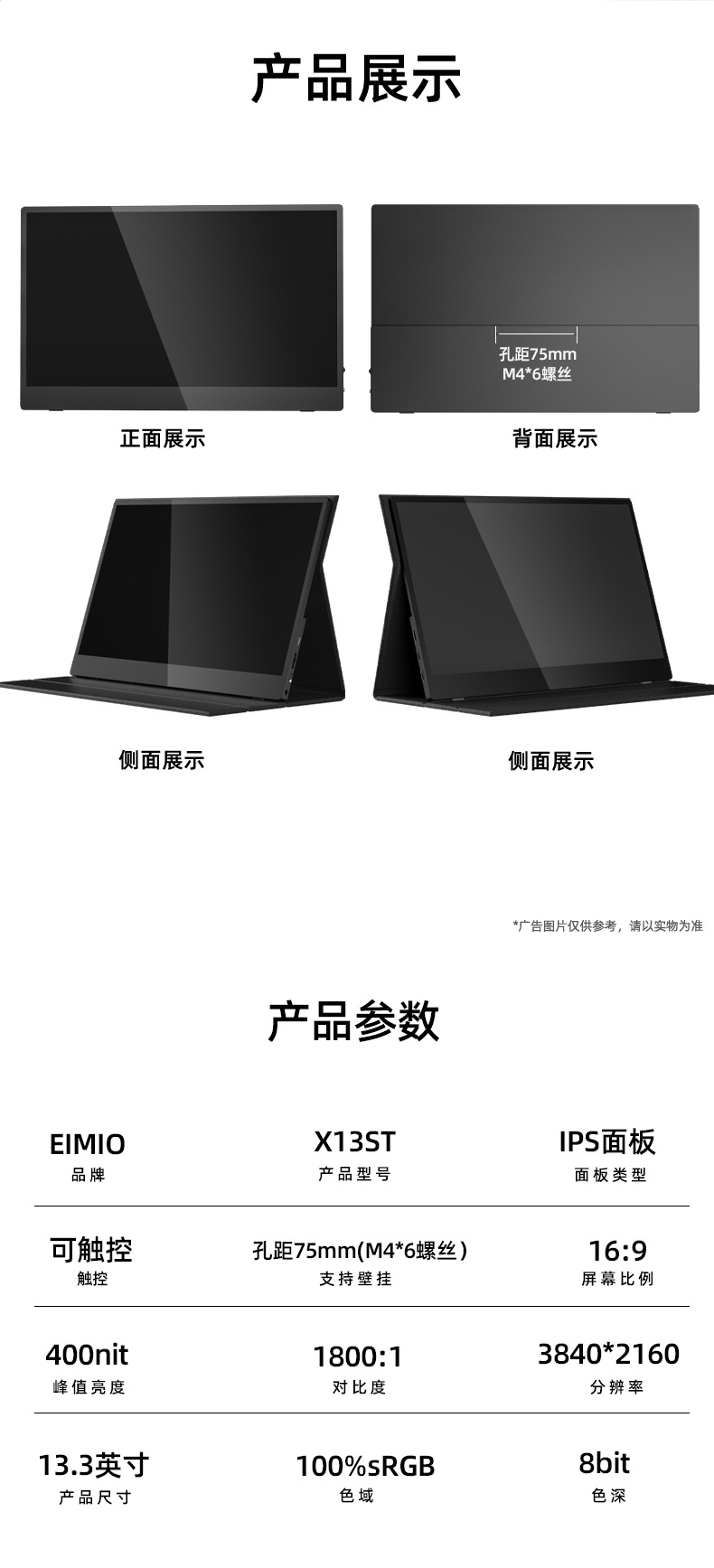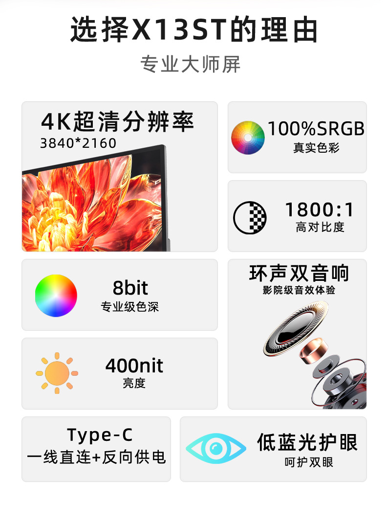 13.3 인치 터치 스크린 4K 휴대용 디스플레이 PS5 휴대 전화 확장 화면 스위치 외부 컴퓨터 서브 스크린스토어 가기