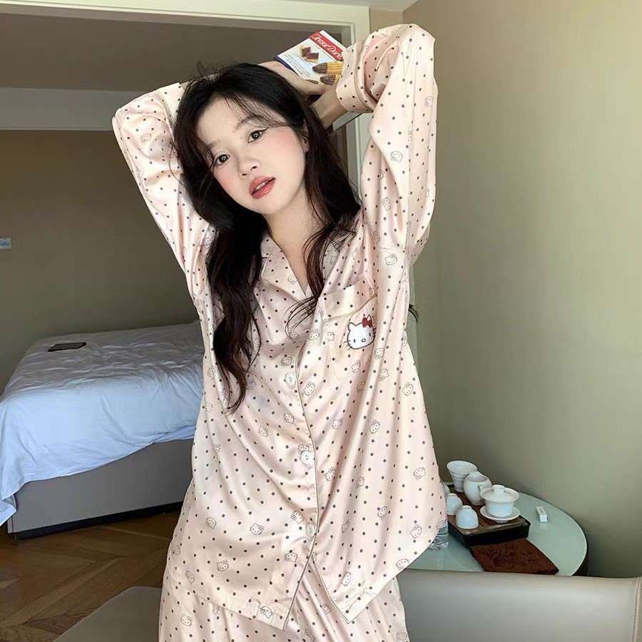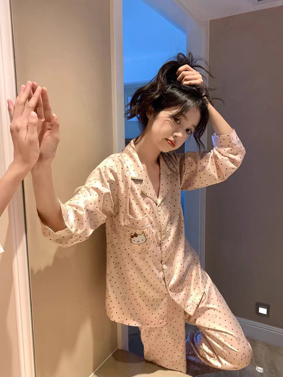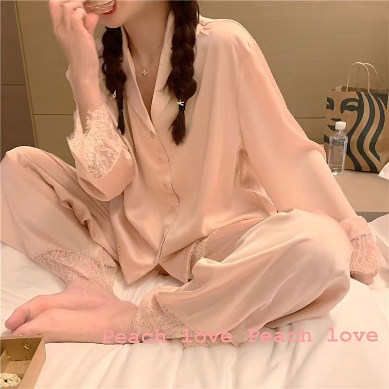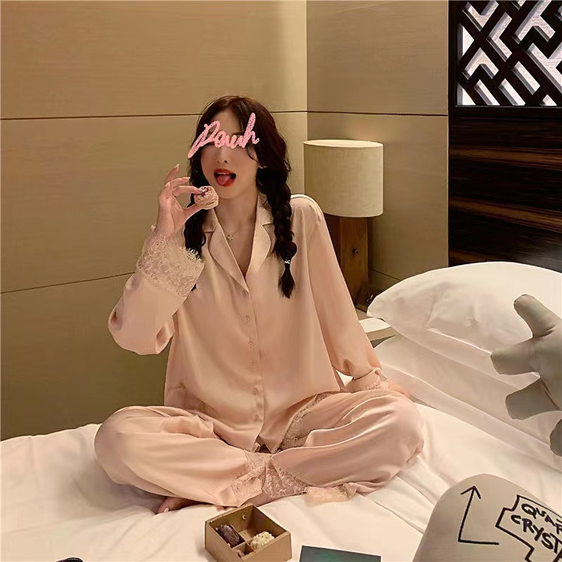 2025 새로운 스타일 잠옷 여성의 봄과 가을 긴 소매 바지 레이스 카디건 달콤한 공주 스타일 아이스 실크 얇은 투피스 세트스토어 가기